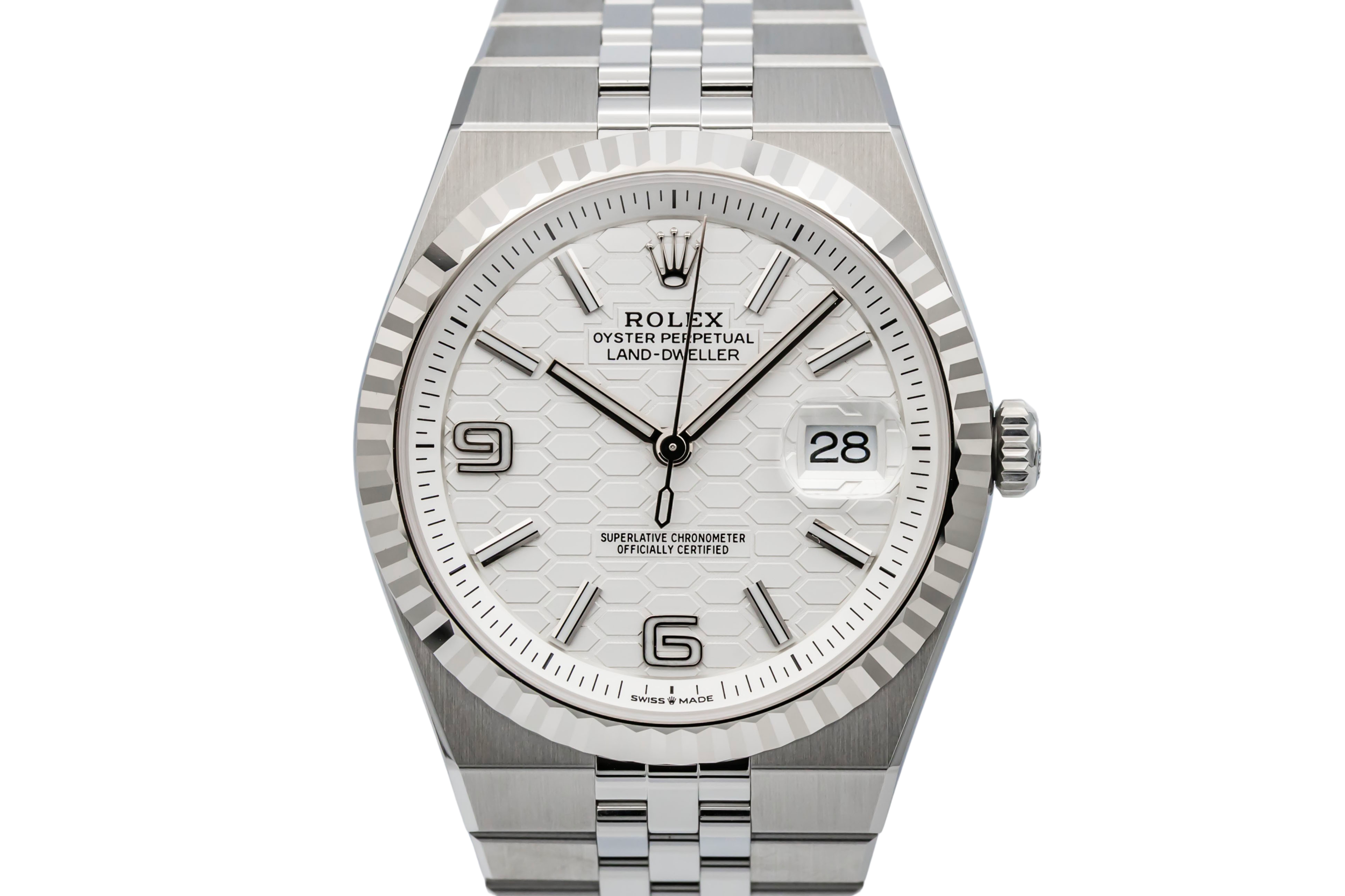 The unworn 2026 Rolex Land-Dweller 40mm features a white dial with luminous baton hour markers, polished hands, and a date window at 3 o’clock framed by the Cyclops lens for enhanced legibility. At 40mm, the case delivers balanced proportions, while the Flat Jubilee bracelet enhances comfort and aesthetic fluidity, making the piece suitable for both everyday wear and travel.
