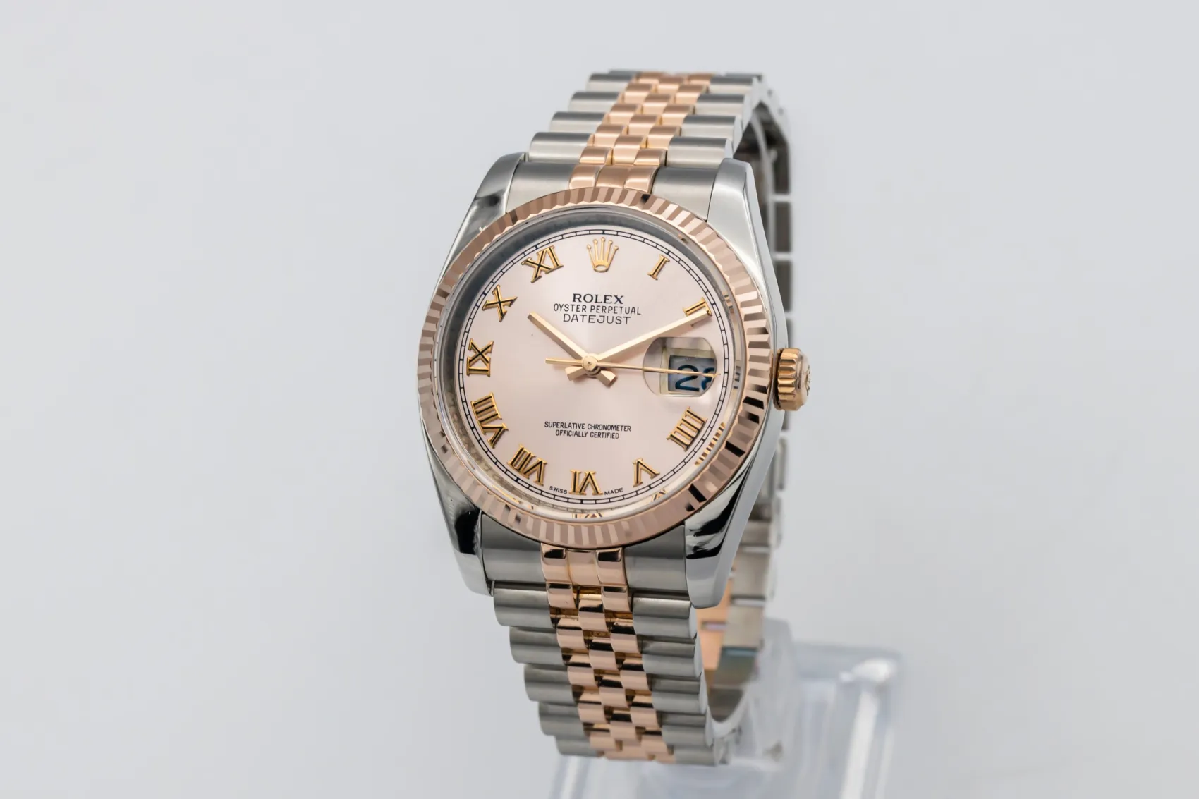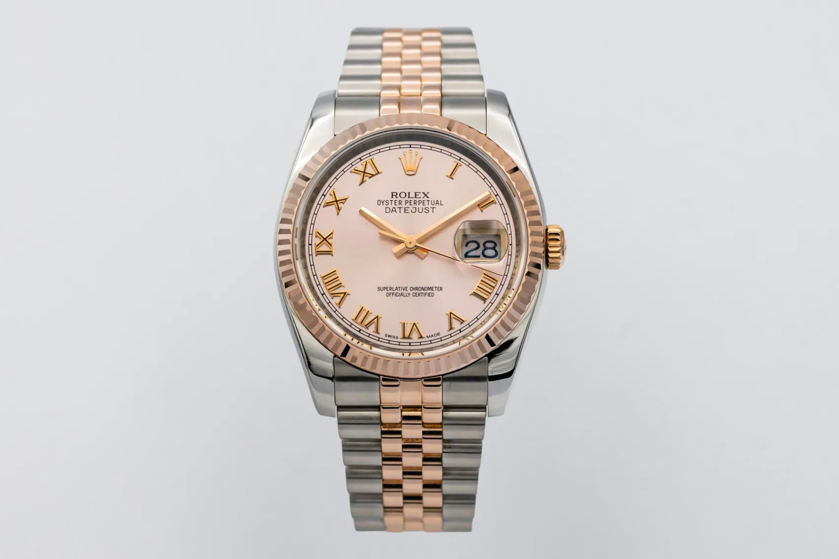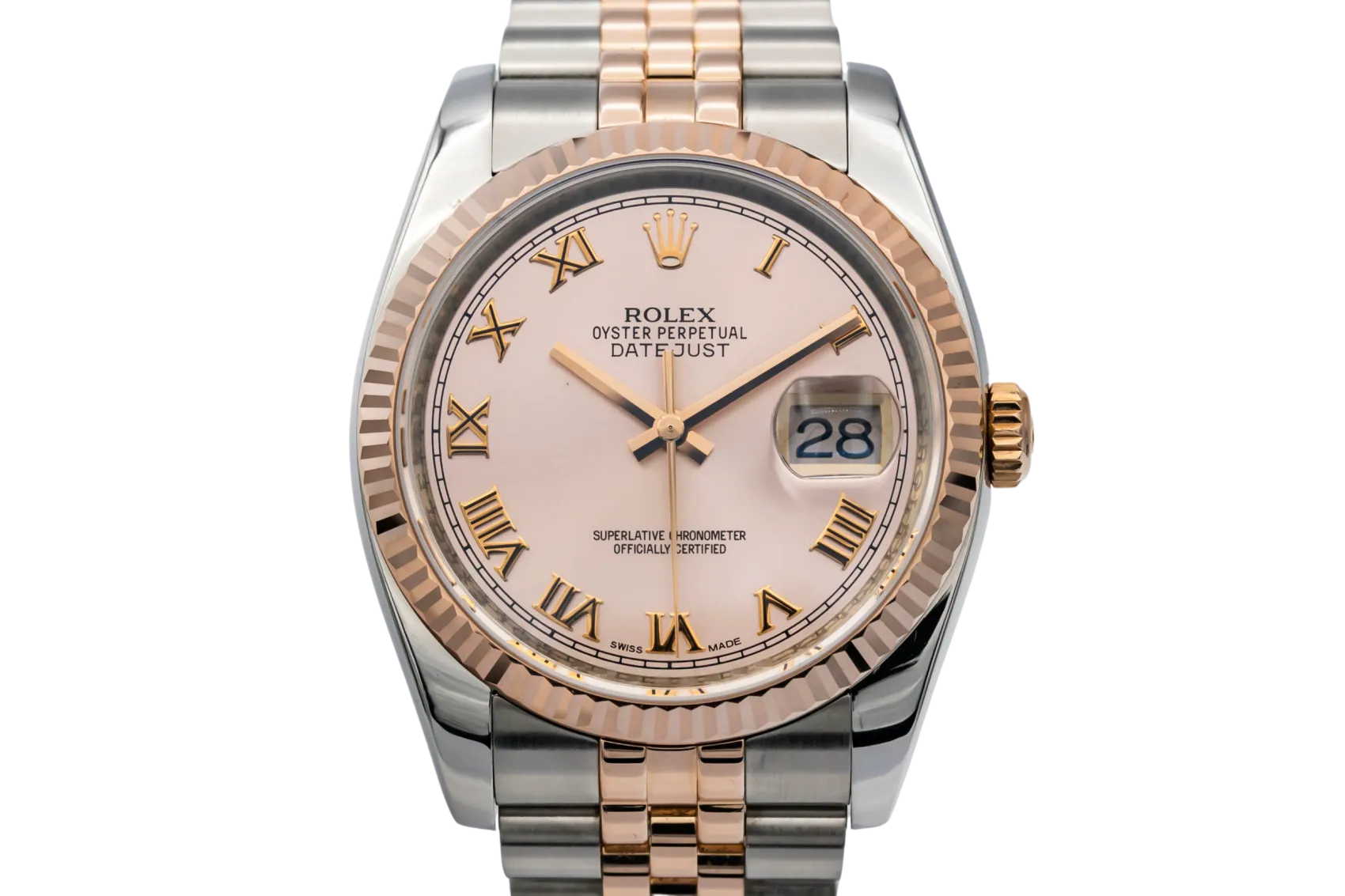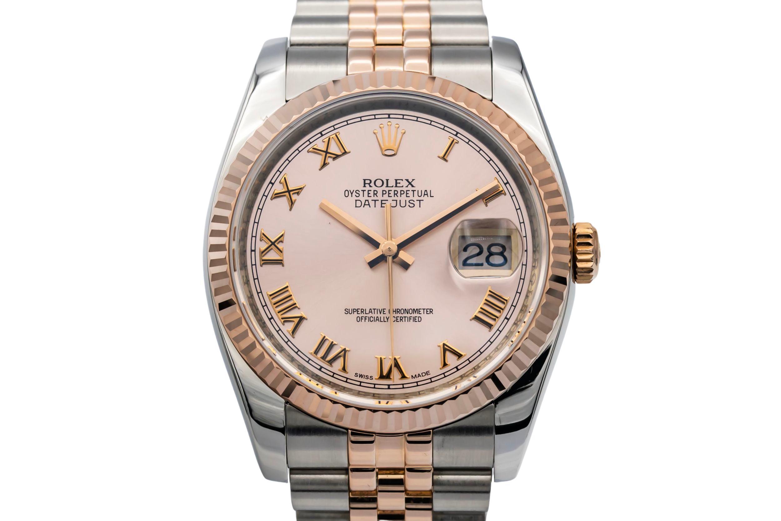 finance this from £190.92 p/m call the shop Read about our Limited Lifetime WarrantyThis 2015 Rolex DateJust 36mm is an elegant luxury timepiece crafted in stainless steel and 18ct Everose gold. The warm sundust dial features refined Roman numeral hour markers and the signature date window at 3 o’clock, offering soft contrast and excellent legibility. Finished with a fluted Everose gold bezel and the iconic steel and rose gold Jubilee bracelet.