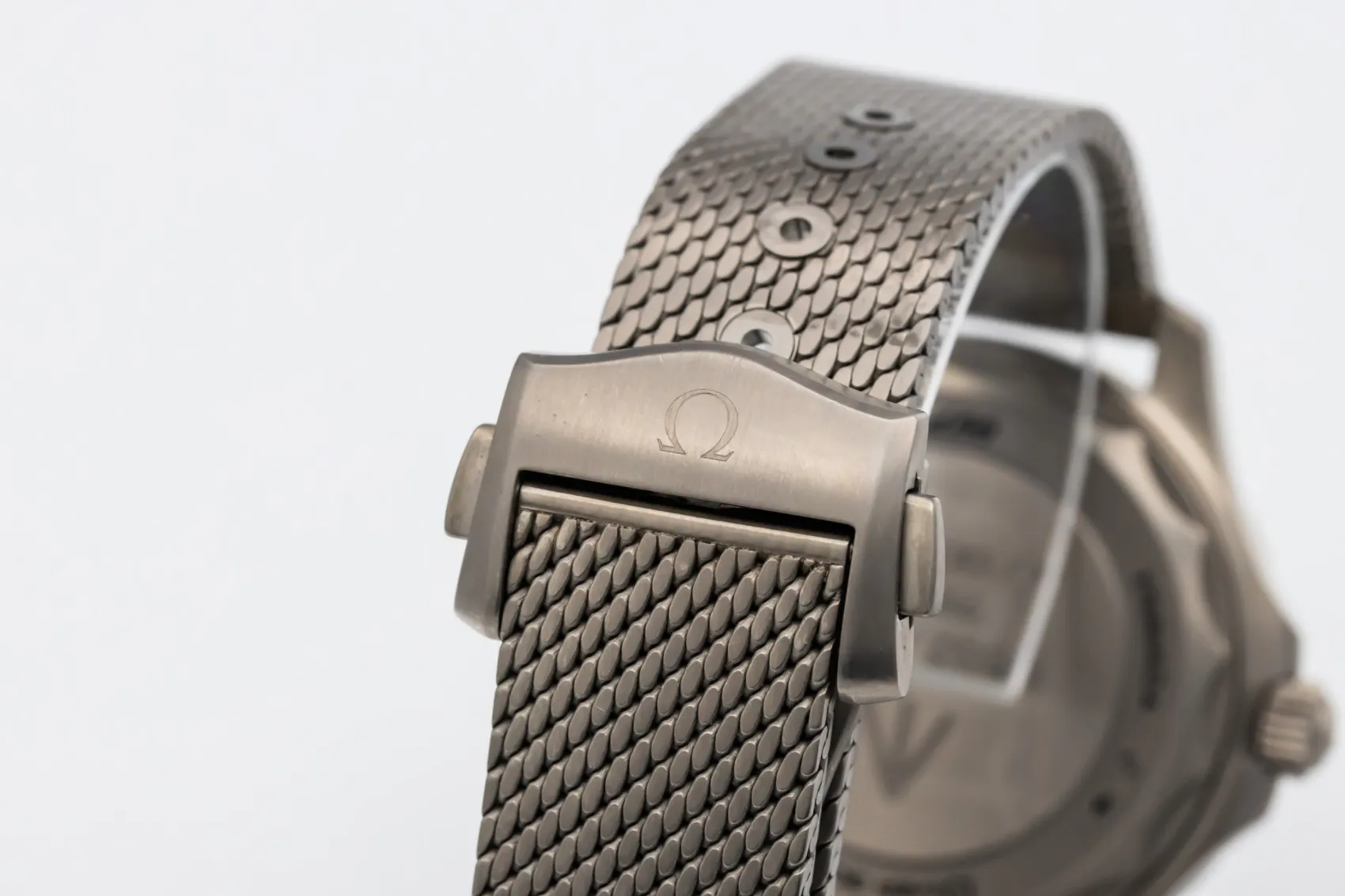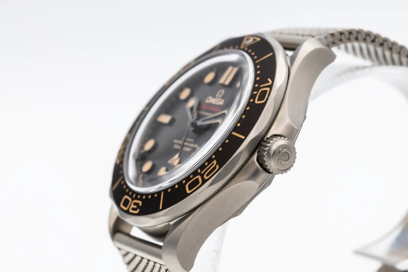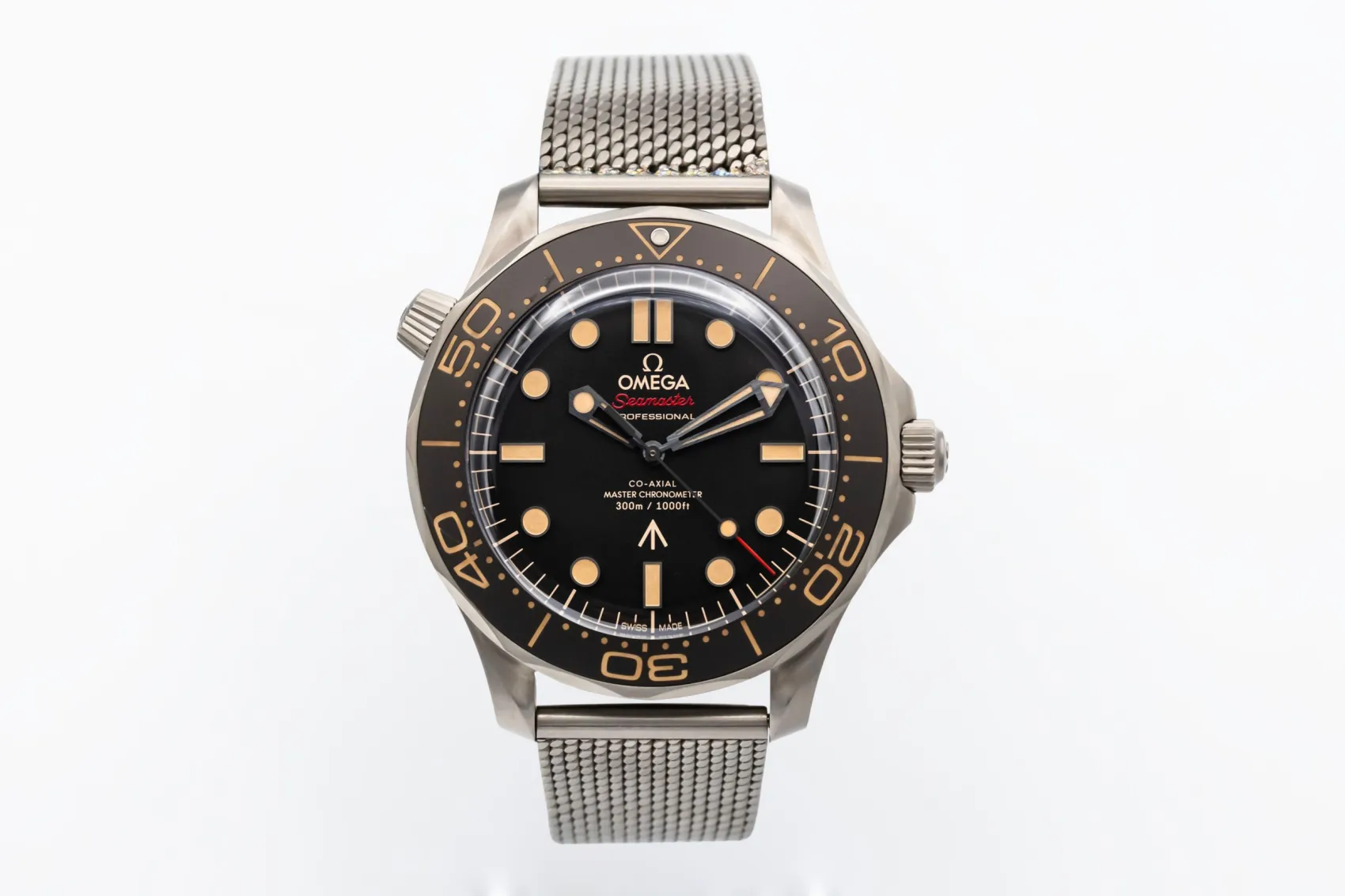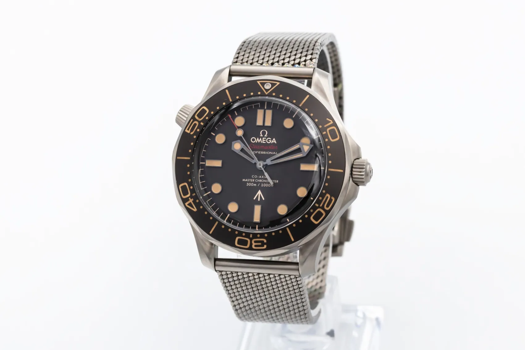 finance this from £136.63 p/m call the shop Read about our Limited Lifetime WarrantyThis 2020 OMEGA Seamaster Diver 300m ‘007 Edition’ is a lightweight professional dive watch crafted in brushed titanium. The tropical brown aluminium dial and bezel give it a distinctive vintage-inspired aesthetic, complemented by luminous hour markers and hands for exceptional legibility. Finished on a matching titanium mesh bracelet.