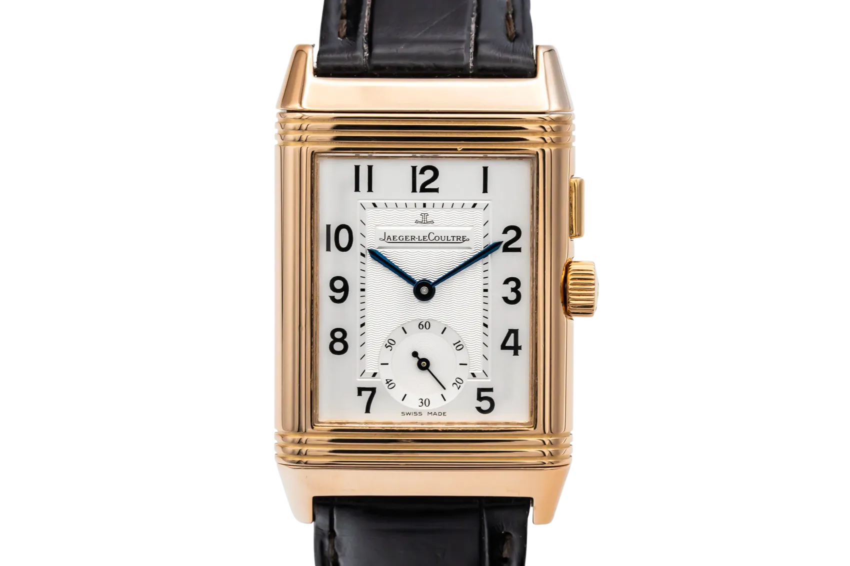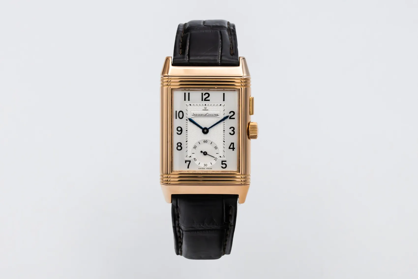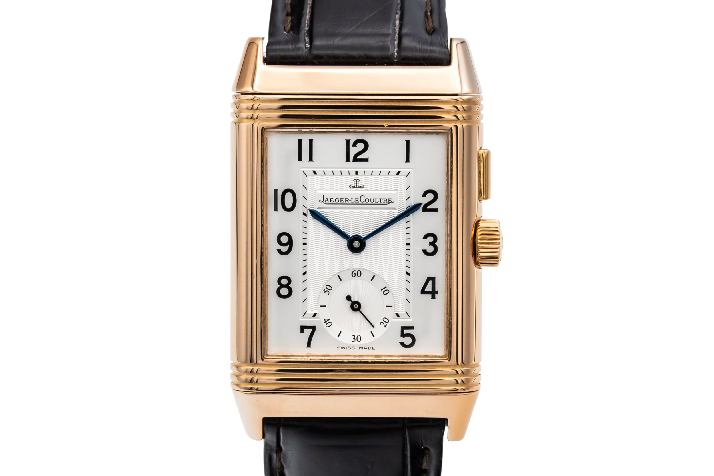 finance this from £211.03 p/m call the shop Read about our Limited Lifetime WarrantyThis 2005 Jaeger-LeCoultre Reverso Duoface 26mm is a refined and versatile luxury timepiece crafted in 18ct Rose Gold. The iconic rectangular reversible case reveals two distinct dials, offering dual time functionality in a slim and elegant profile. Finished on a classic black leather strap with a 18ct rose gold deployant clasp.