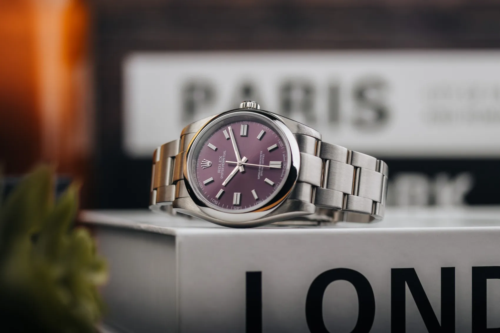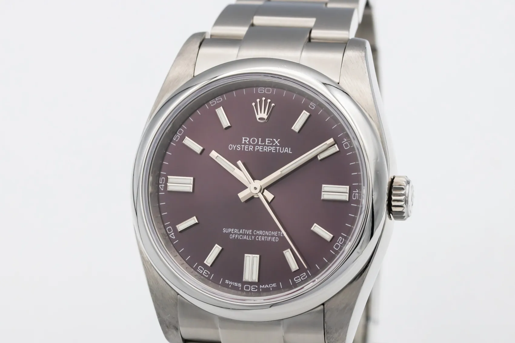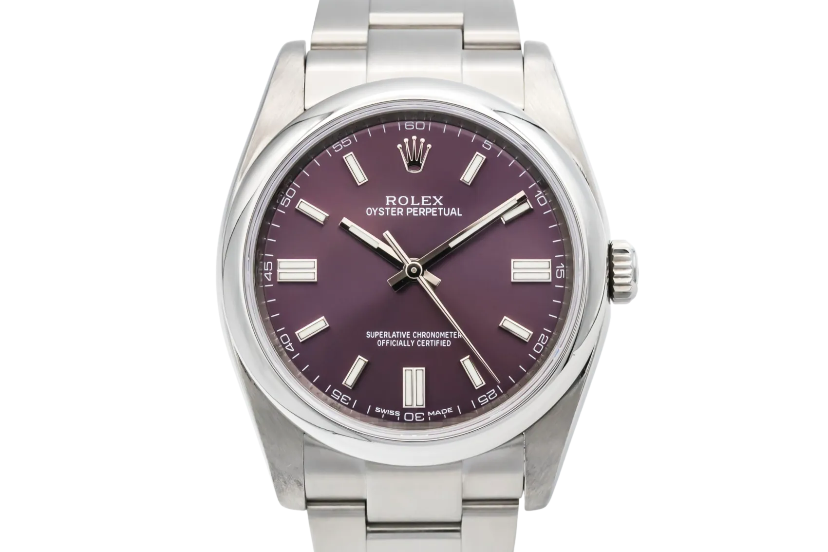 finance this from £120.55 p/m call the shop Read about our Limited Lifetime WarrantyThis 2015 Rolex Oyster Perpetual 36mm is a striking and versatile luxury timepiece crafted in stainless steel. The distinctive red grape dial features applied baton hour markers and luminous hands, creating a bold yet refined aesthetic with excellent legibility. Finished on a stainless steel Oyster bracelet with a secure Oysterclasp.