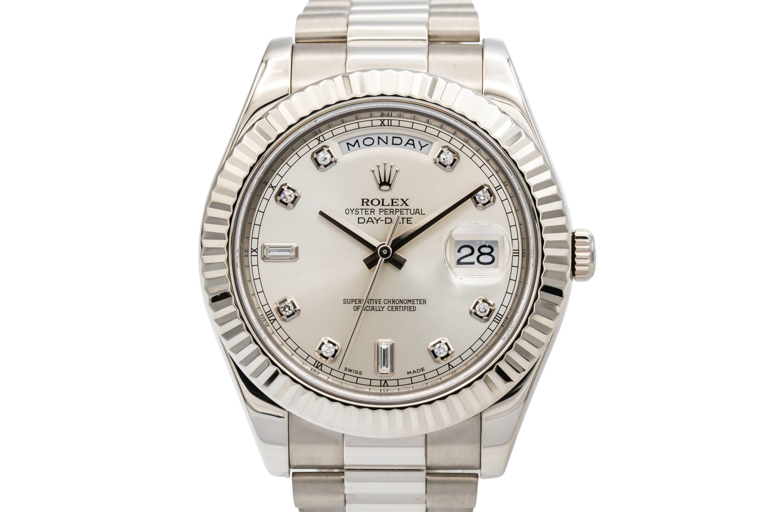 This 2014 Rolex Day-Date II is a powerful luxury timepiece crafted in solid 18ct white gold. The striking silver dial is set with factory diamond hour markers, complemented by the signature day display at 12 o’clock and date window at 3 o’clock for excellent legibility. Finished with a fluted white gold bezel and the prestigious 18ct white gold President bracelet.