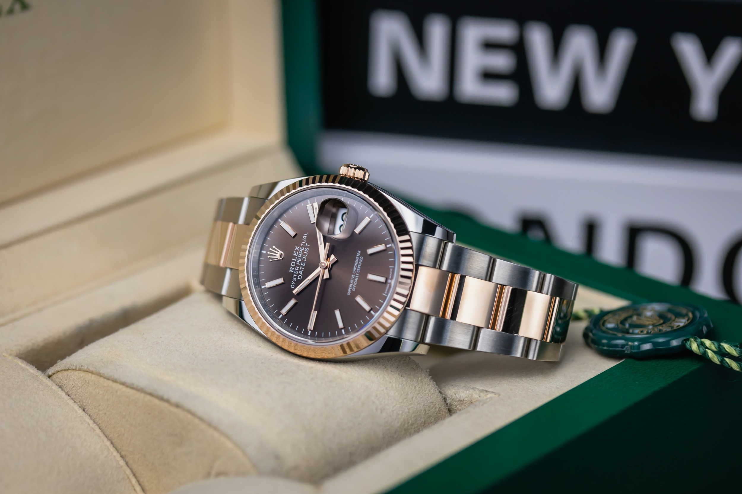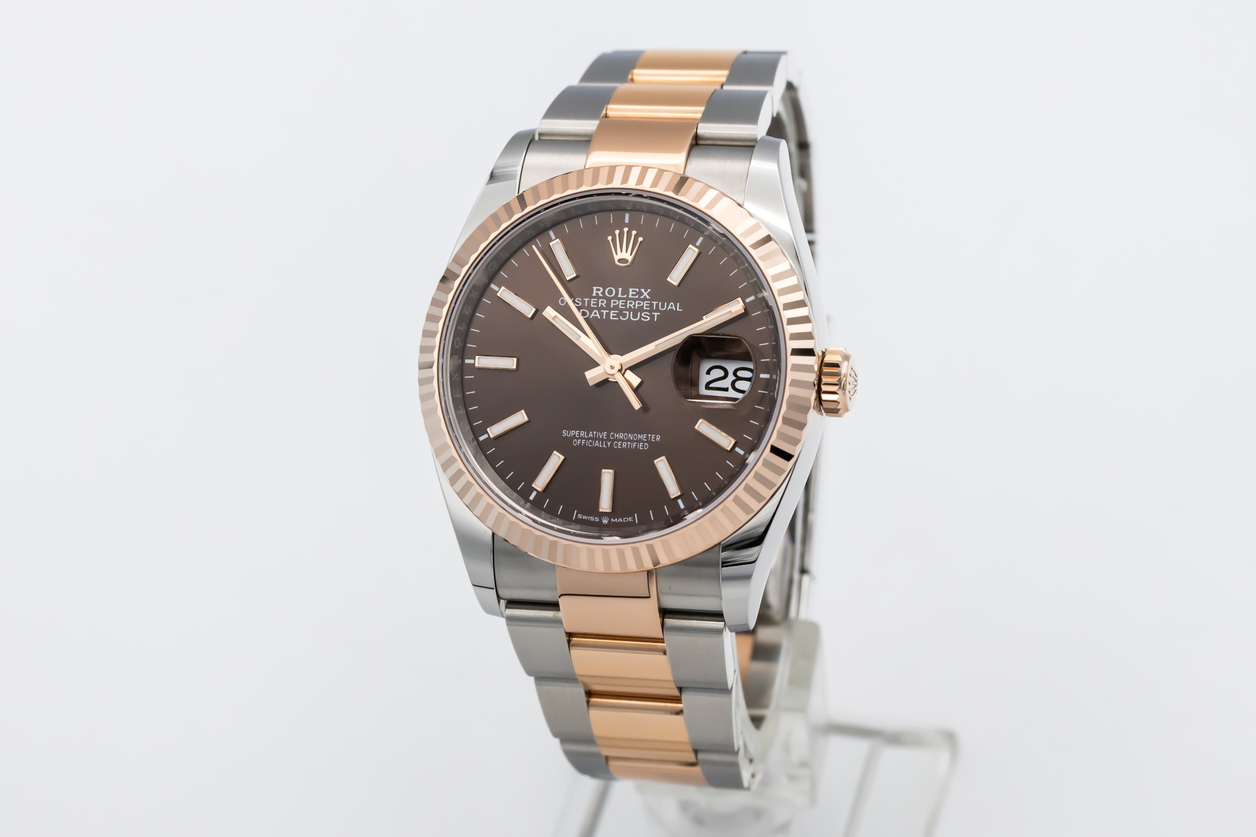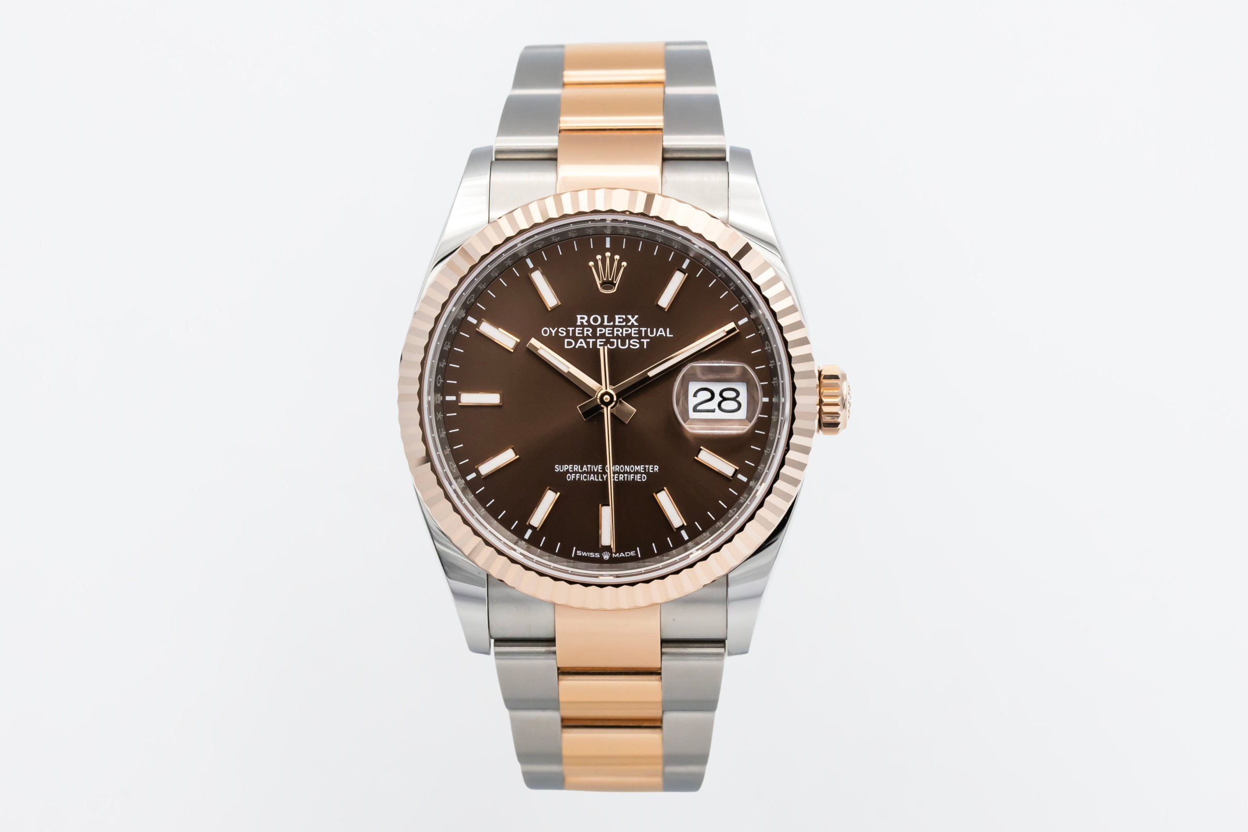 This 2025 Rolex DateJust 36mm is an elegant luxury timepiece crafted in stainless steel and 18ct rose gold. The chocolate dial is paired with baton hour markers and framed by a fluted Everose gold bezel, adding warmth and classic Rolex character. Finished on a steel and rose gold Oyster bracelet with a secure Oysterclasp.