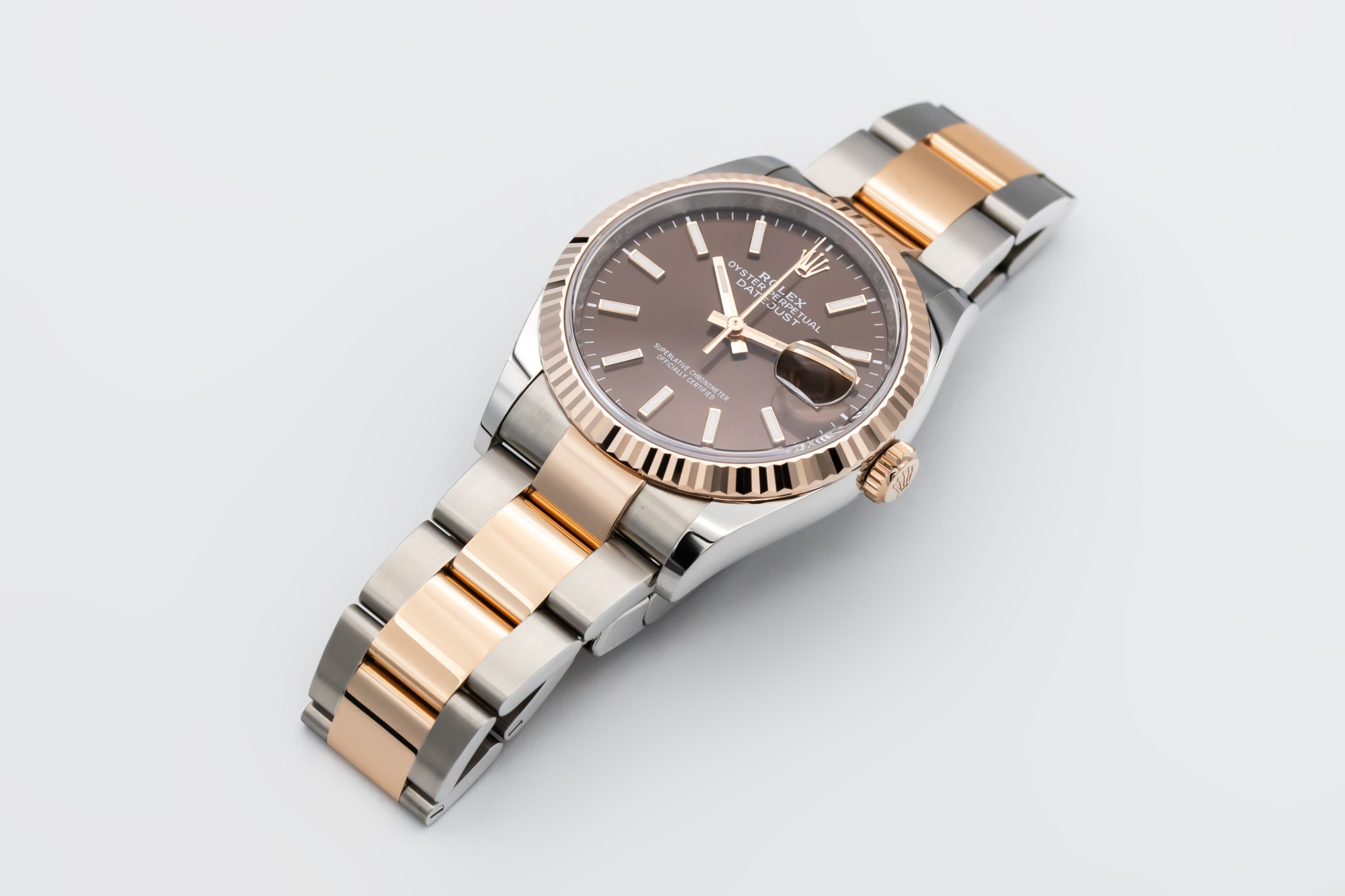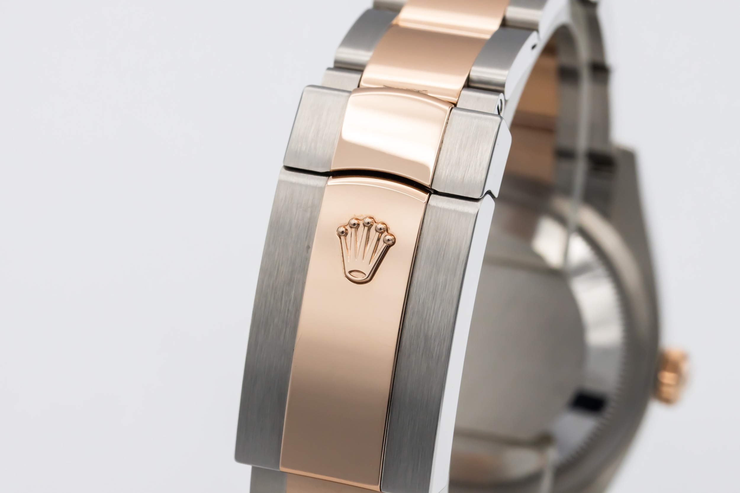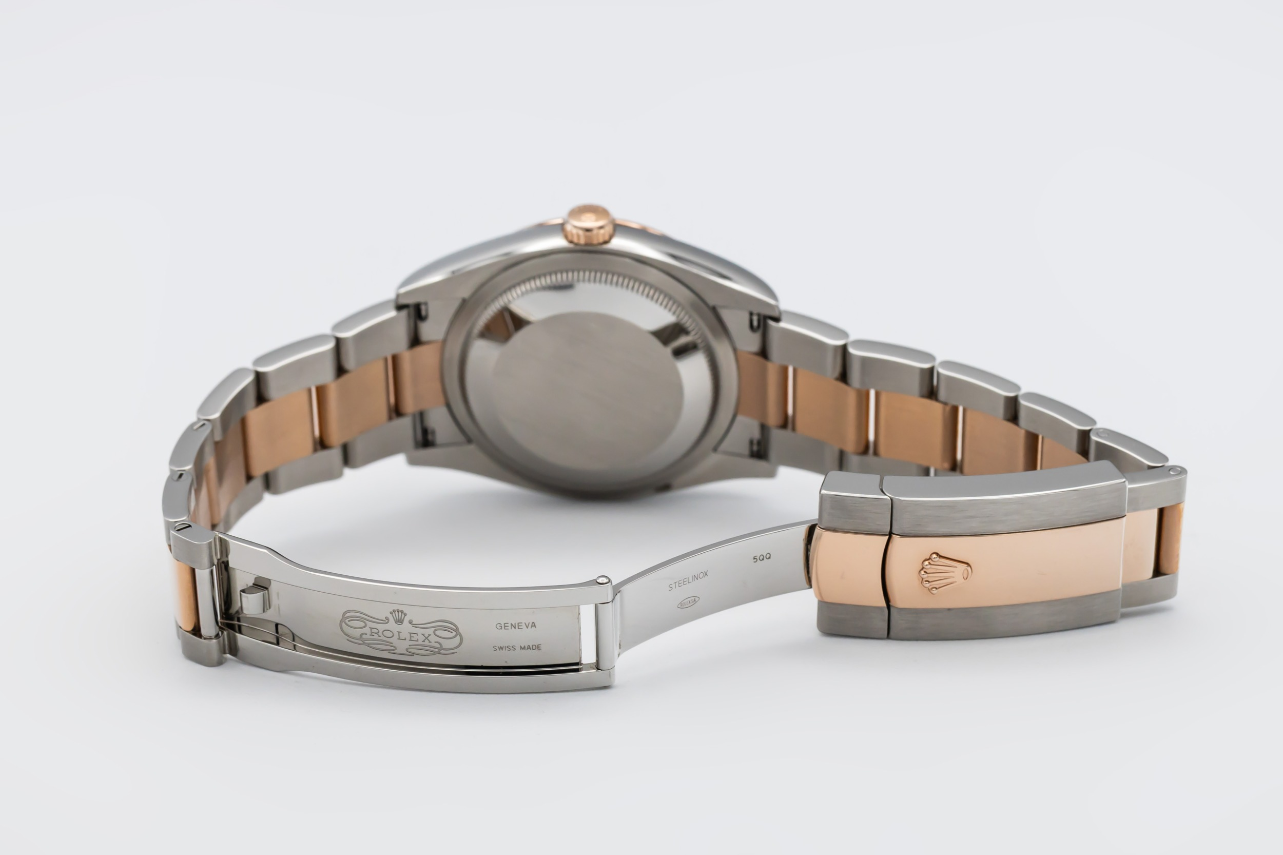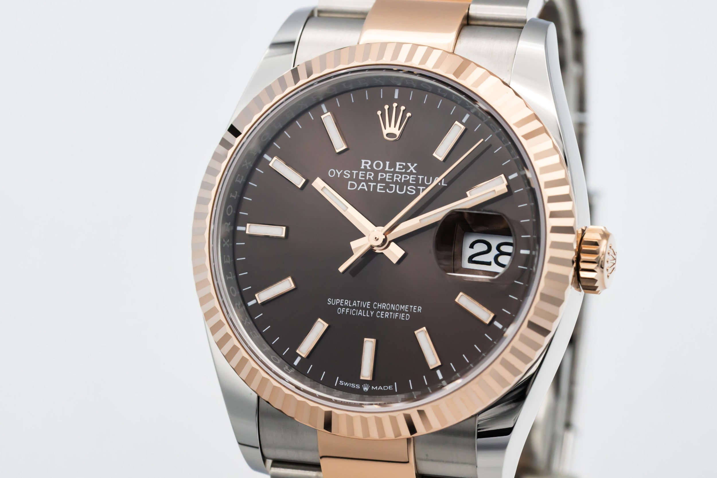 This 2025 Rolex DateJust 36mm is an elegant luxury timepiece crafted in stainless steel and 18ct rose gold. The chocolate dial is paired with baton hour markers and framed by a fluted Everose gold bezel, adding warmth and classic Rolex character. Finished on a steel and rose gold Oyster bracelet with a secure Oysterclasp.