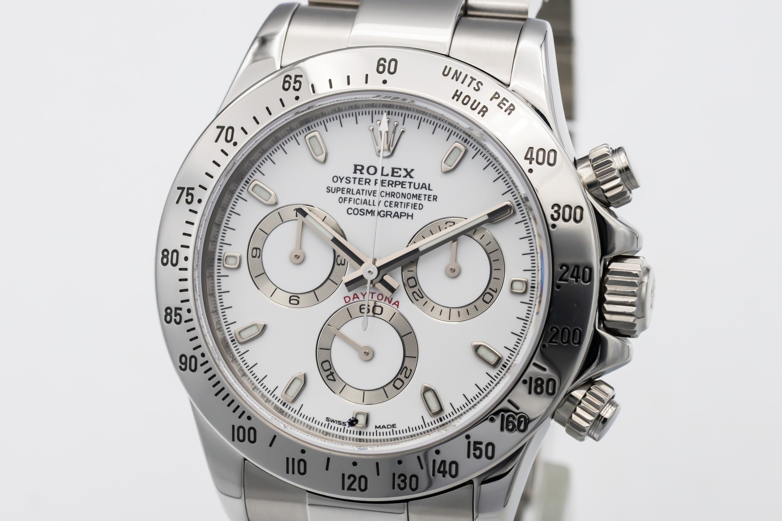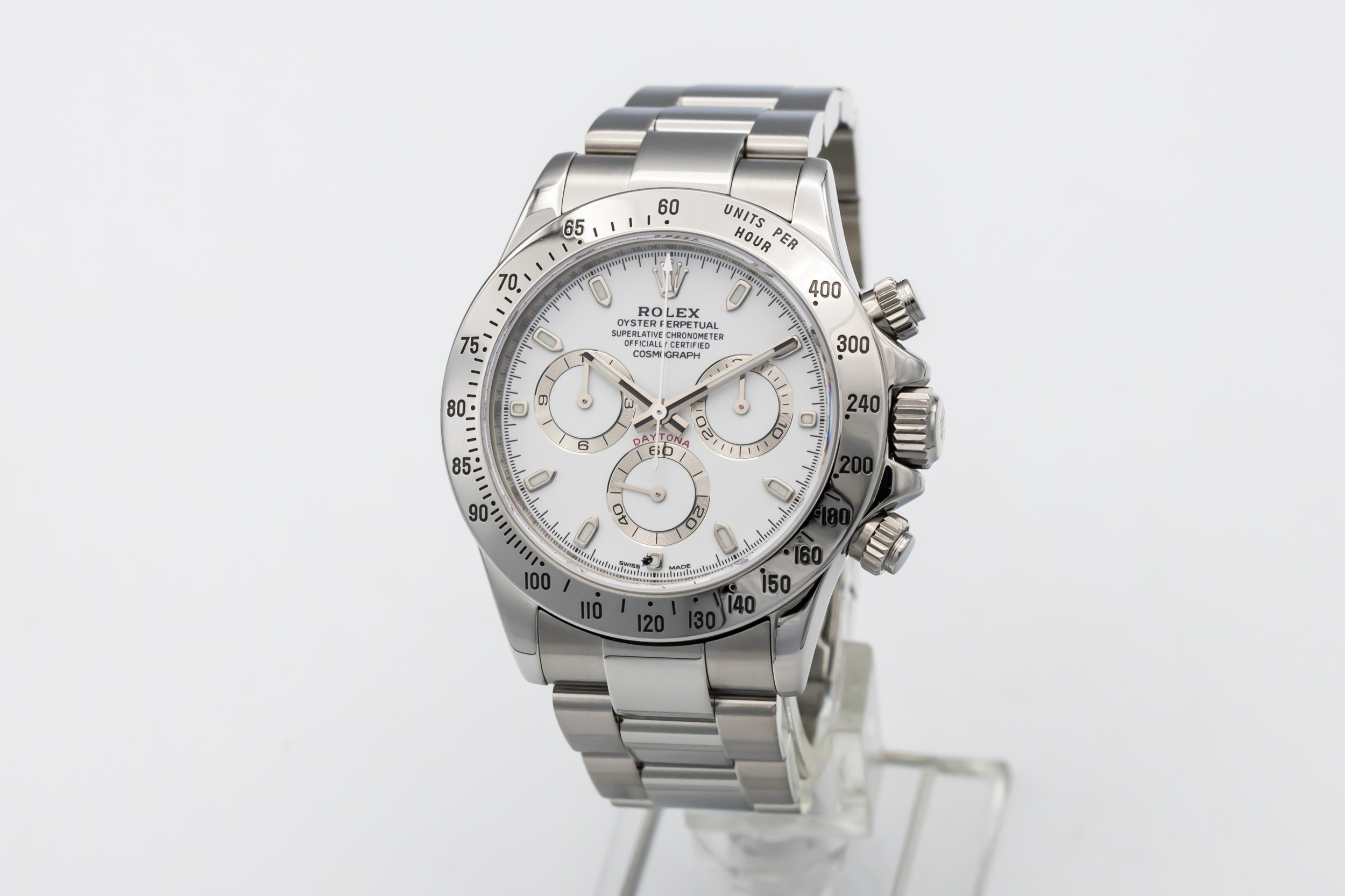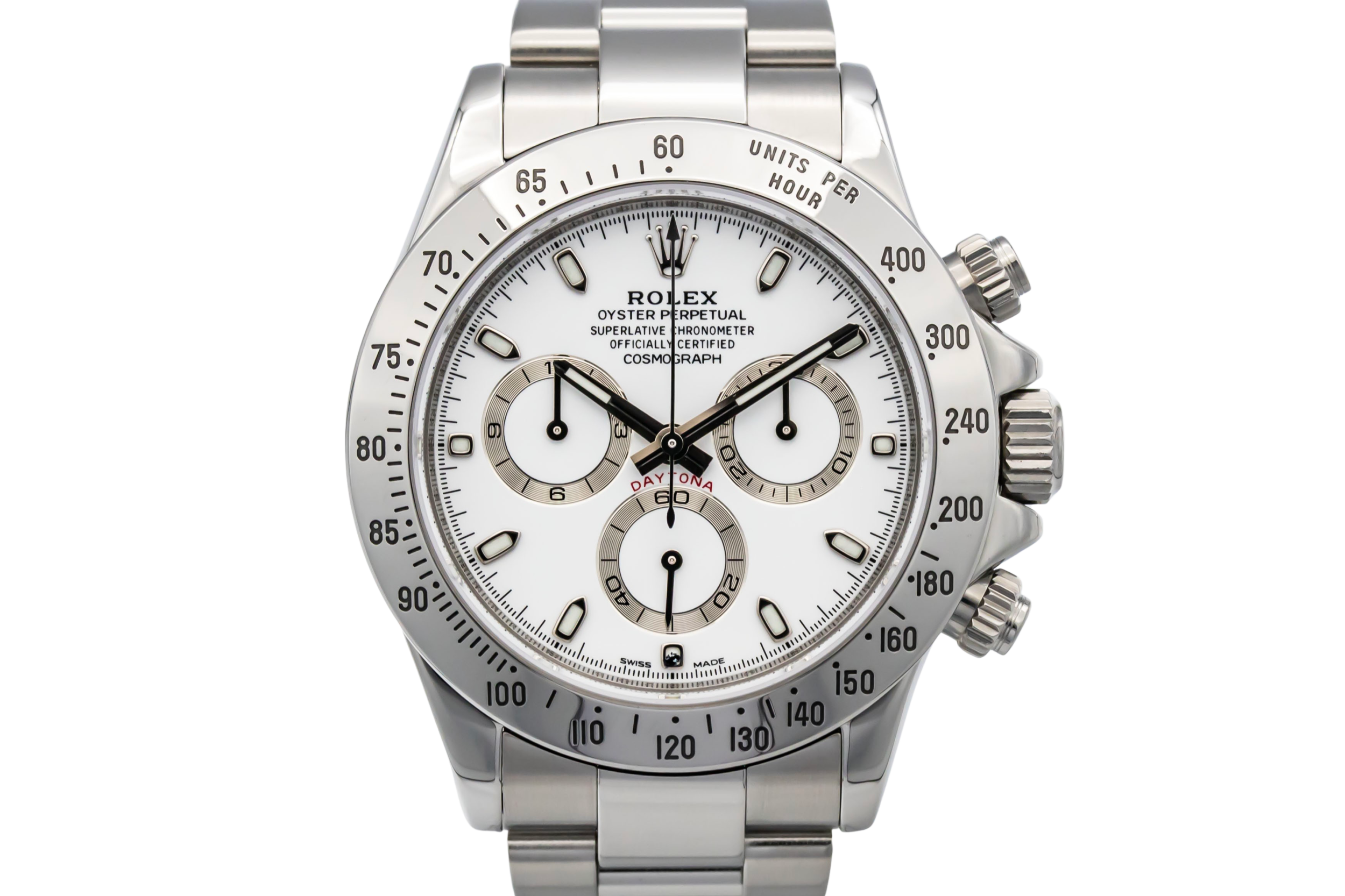 This 2008 Rolex Cosmograph Daytona 40mm is an iconic luxury chronograph crafted in stainless steel. The clean, highly legible white dial features applied hour markers, contrasting chronograph sub-dials, and the classic Daytona layout renowned for precision and balance. Finished on a stainless steel Oyster bracelet with a secure Oysterlock clasp.