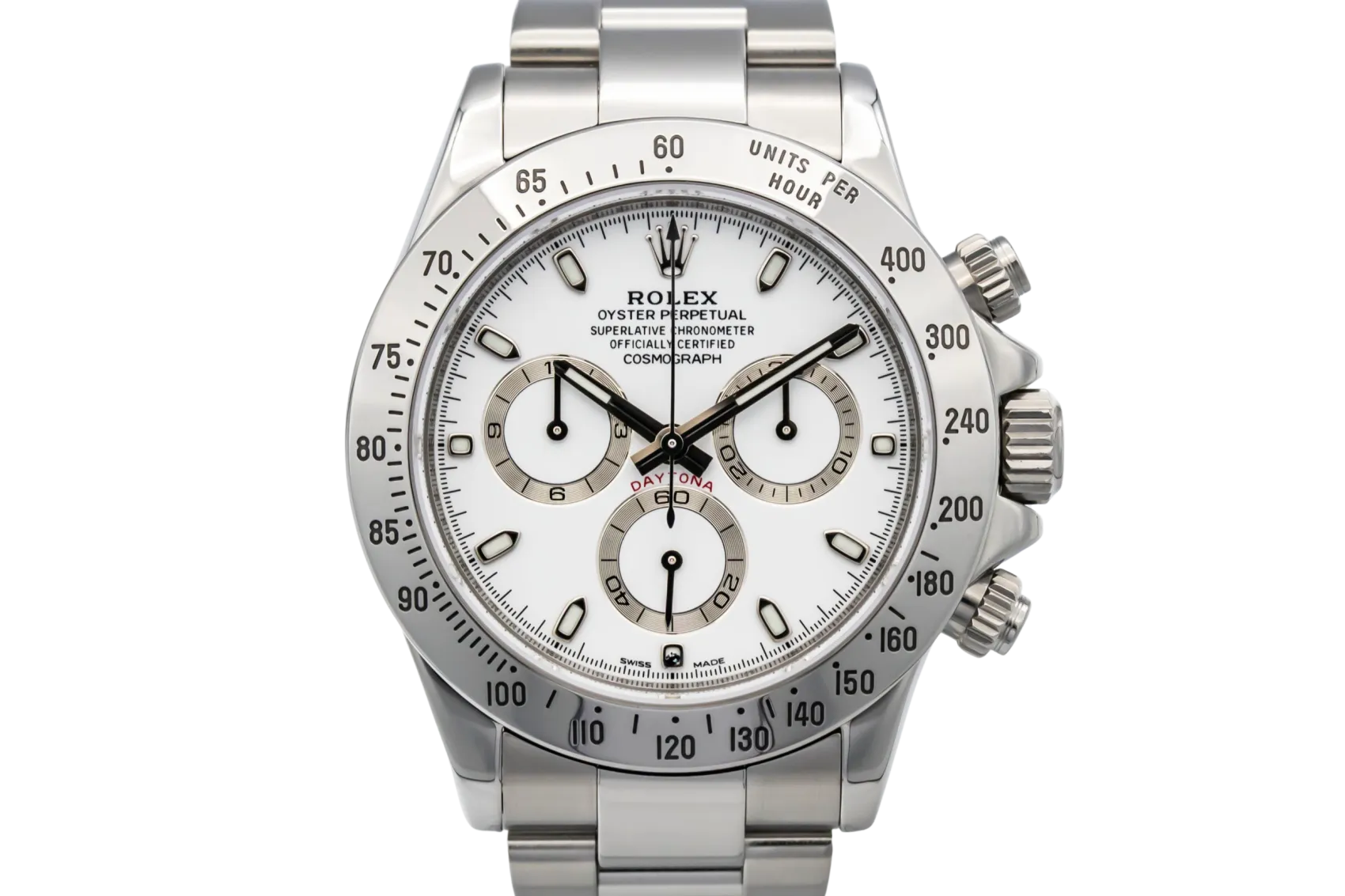 finance this from £347.76 p/m call the shop Read about our Limited Lifetime WarrantyThis 2008 Rolex Cosmograph Daytona 40mm is an iconic luxury chronograph crafted in stainless steel. The clean, highly legible white dial features applied hour markers, contrasting chronograph sub-dials, and the classic Daytona layout renowned for precision and balance. Finished on a stainless steel Oyster bracelet with a secure Oysterlock clasp.