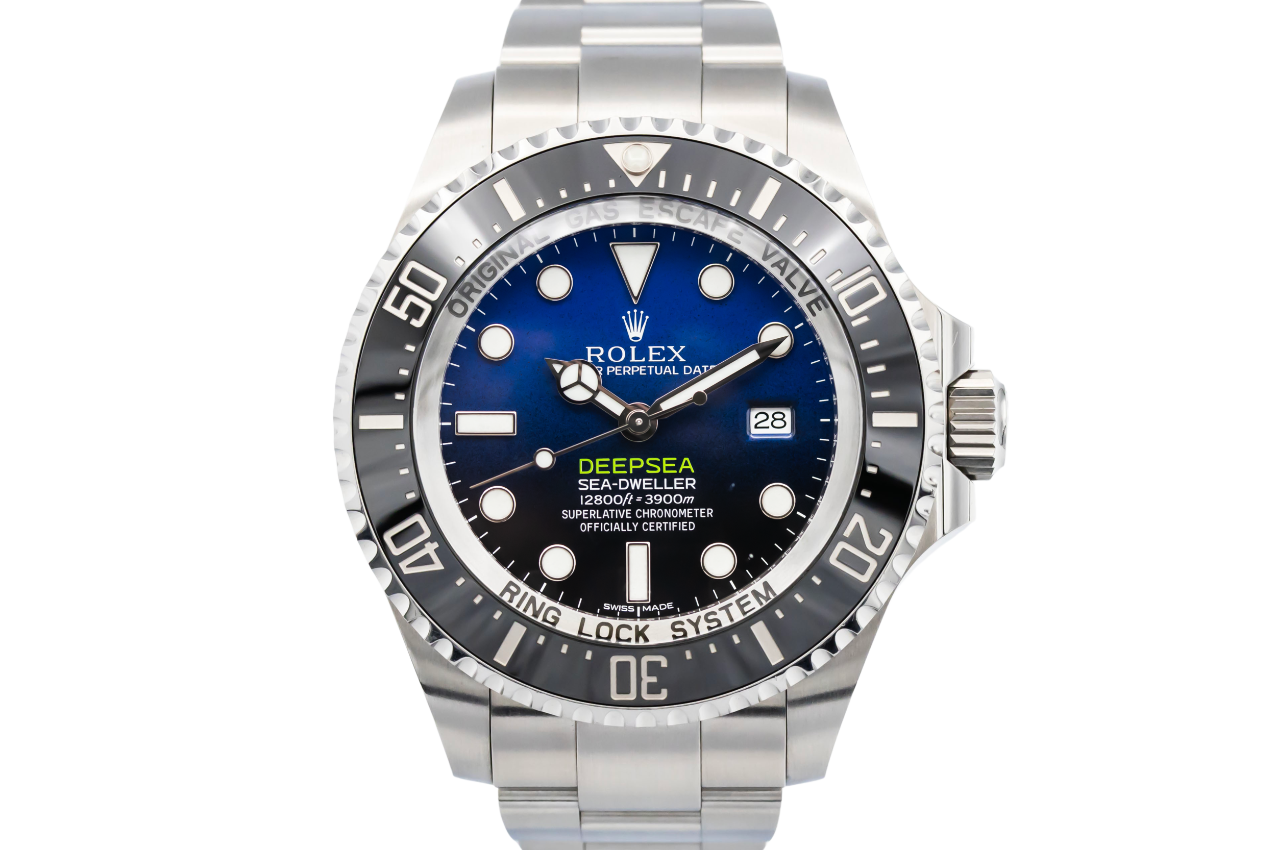 This 2018 Rolex Deepsea Sea-Dweller 44mm is an extreme professional dive watch crafted in stainless steel. The striking blue-to-black gradient “James Cameron” dial is paired with large luminous hour markers and hands for maximum underwater legibility. Finished with a robust black Cerachrom bezel and a stainless steel Oyster bracelet featuring the Glidelock extension system.