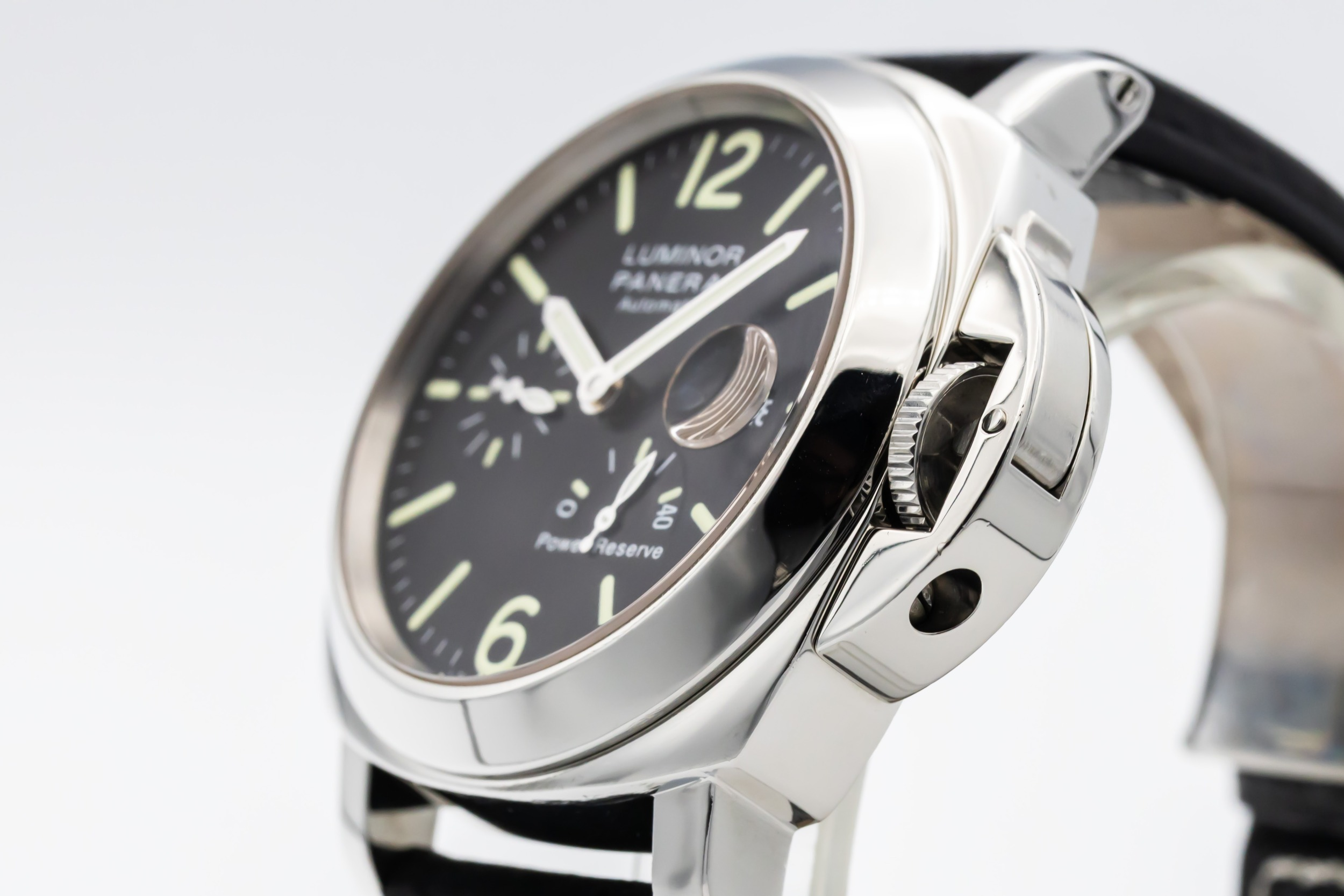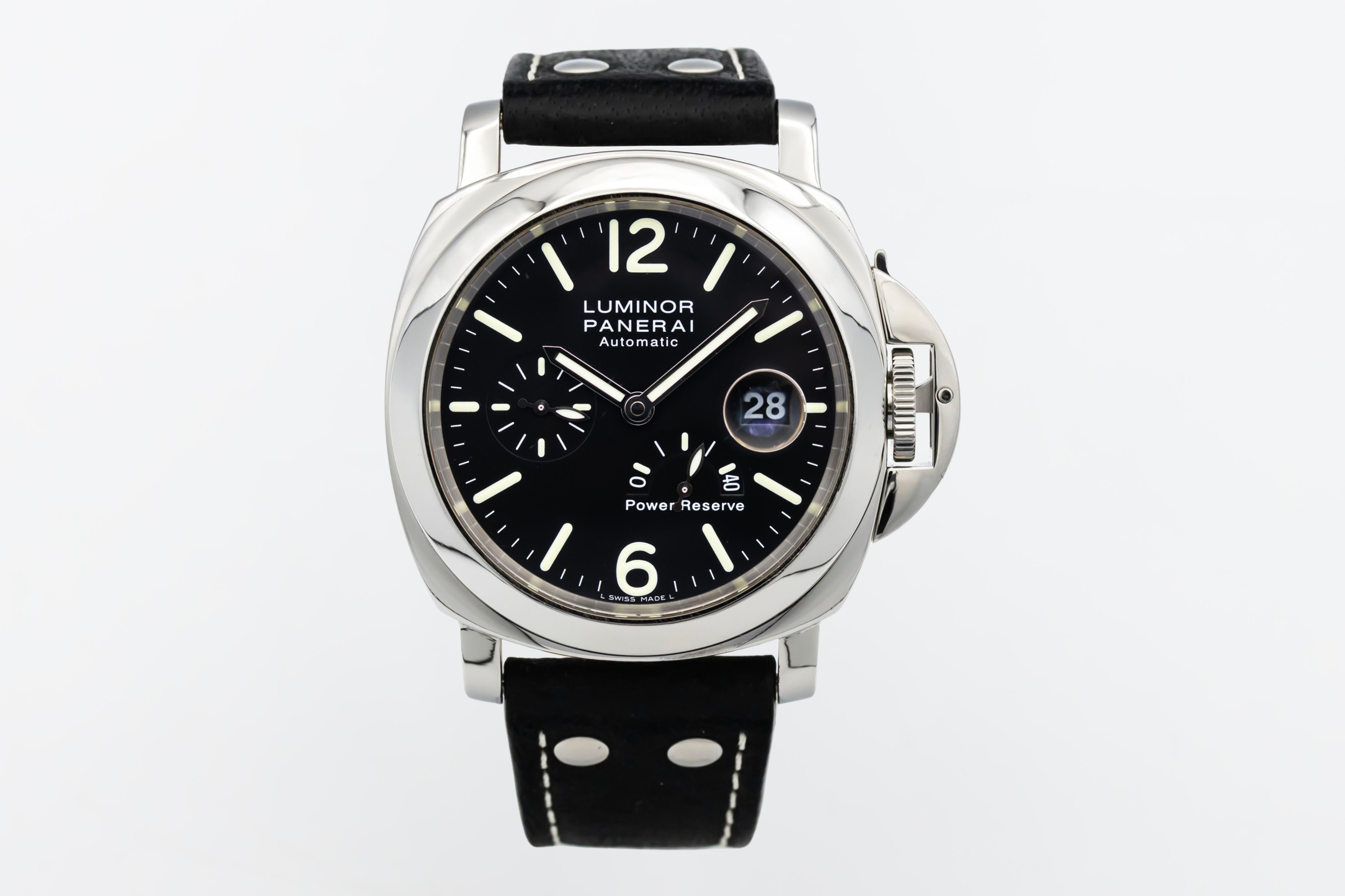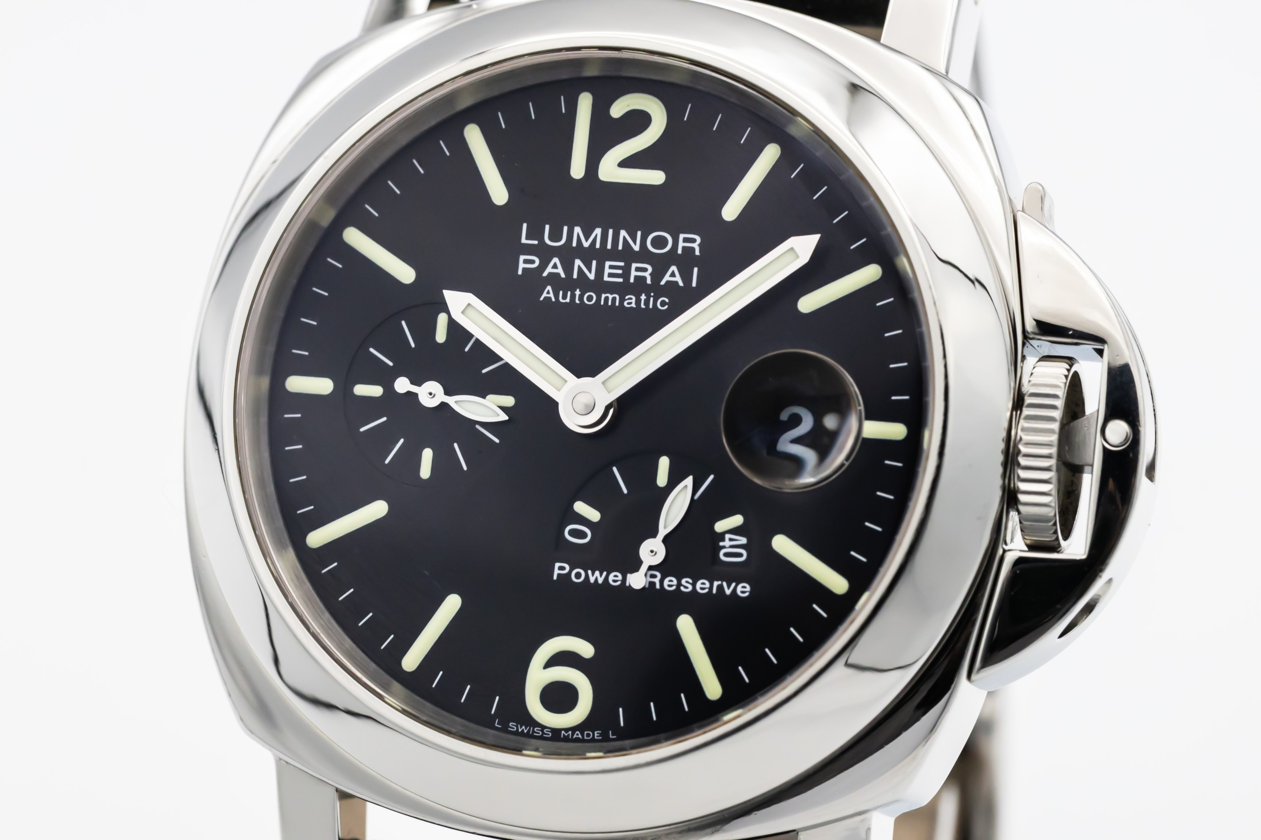 This circa 2000s Panerai Luminor Power Reserve 44mm is a bold luxury sports watch crafted in stainless steel. The black dial features luminous Arabic numerals, the signature Panerai sandwich construction for exceptional legibility, a small seconds sub-dial, and a power reserve indicator for added functionality. Finished with the iconic crown guard bridge and paired on a black leather strap.
