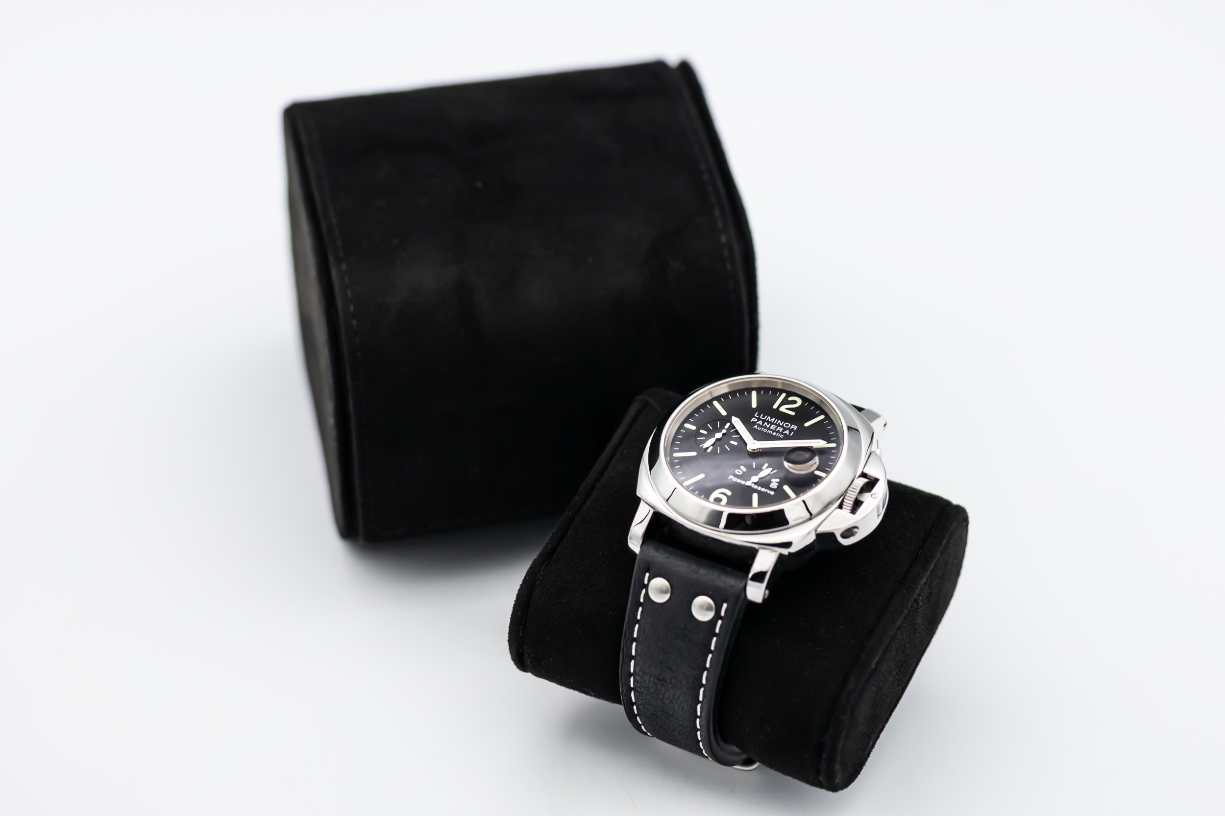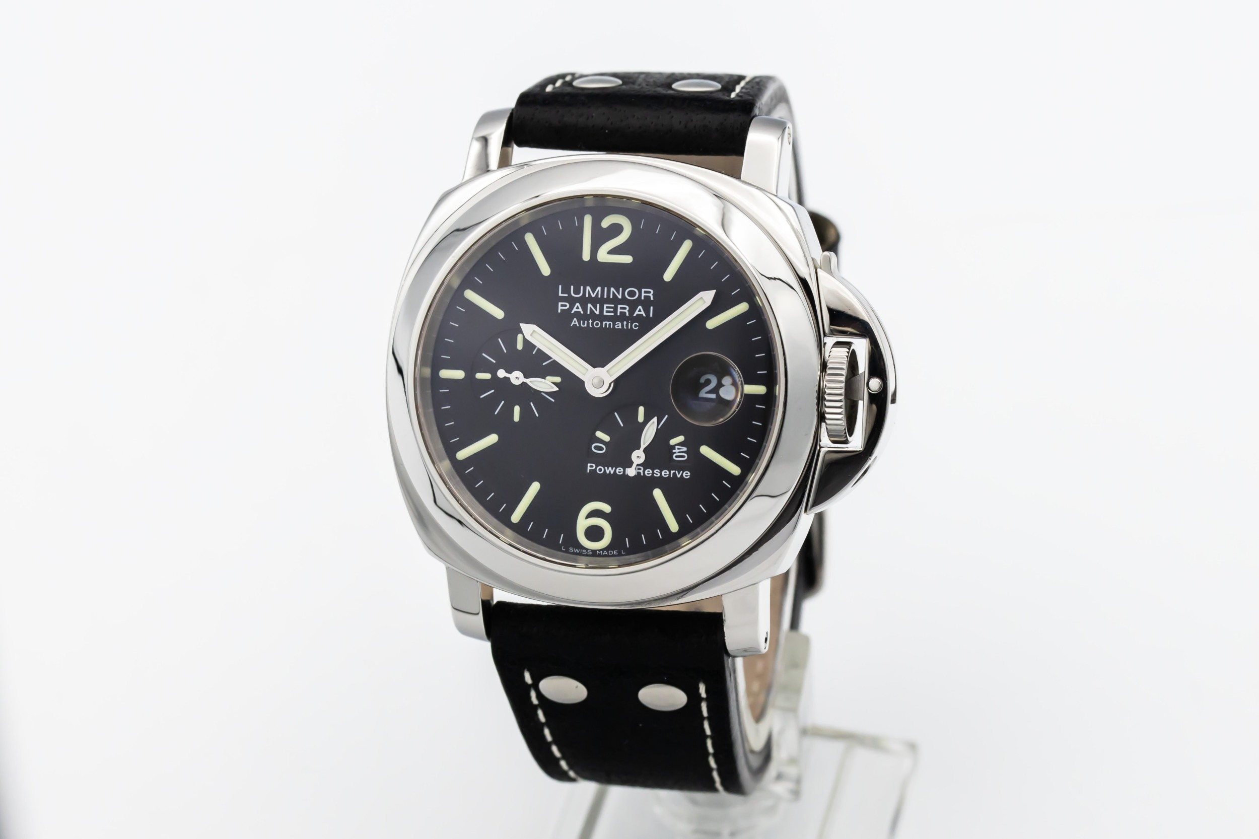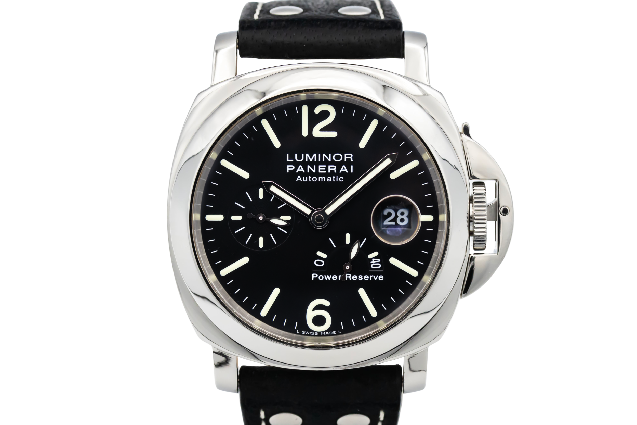 This circa 2000s Panerai Luminor Power Reserve 44mm is a bold luxury sports watch crafted in stainless steel. The black dial features luminous Arabic numerals, the signature Panerai sandwich construction for exceptional legibility, a small seconds sub-dial, and a power reserve indicator for added functionality. Finished with the iconic crown guard bridge and paired on a black leather strap.