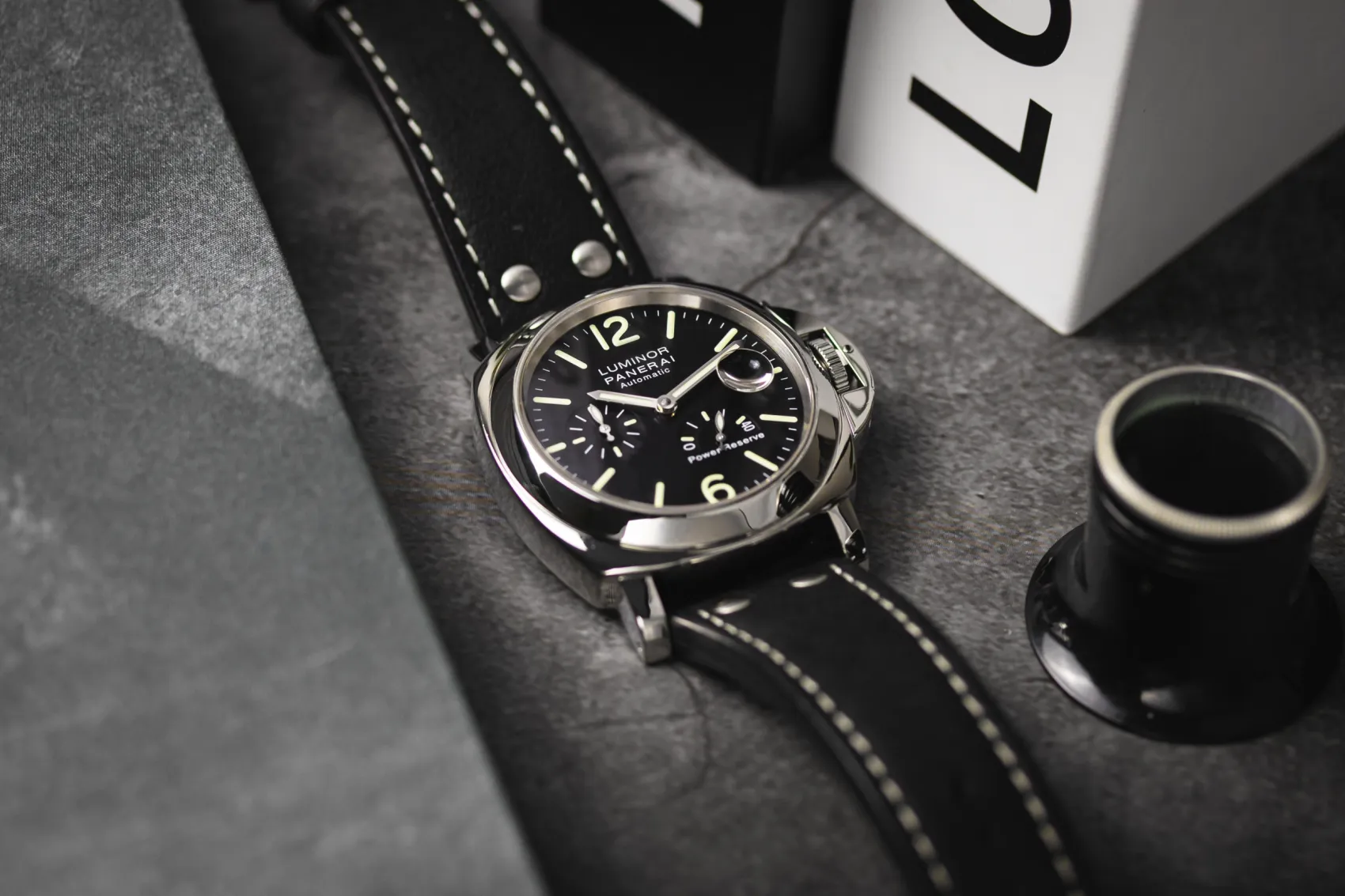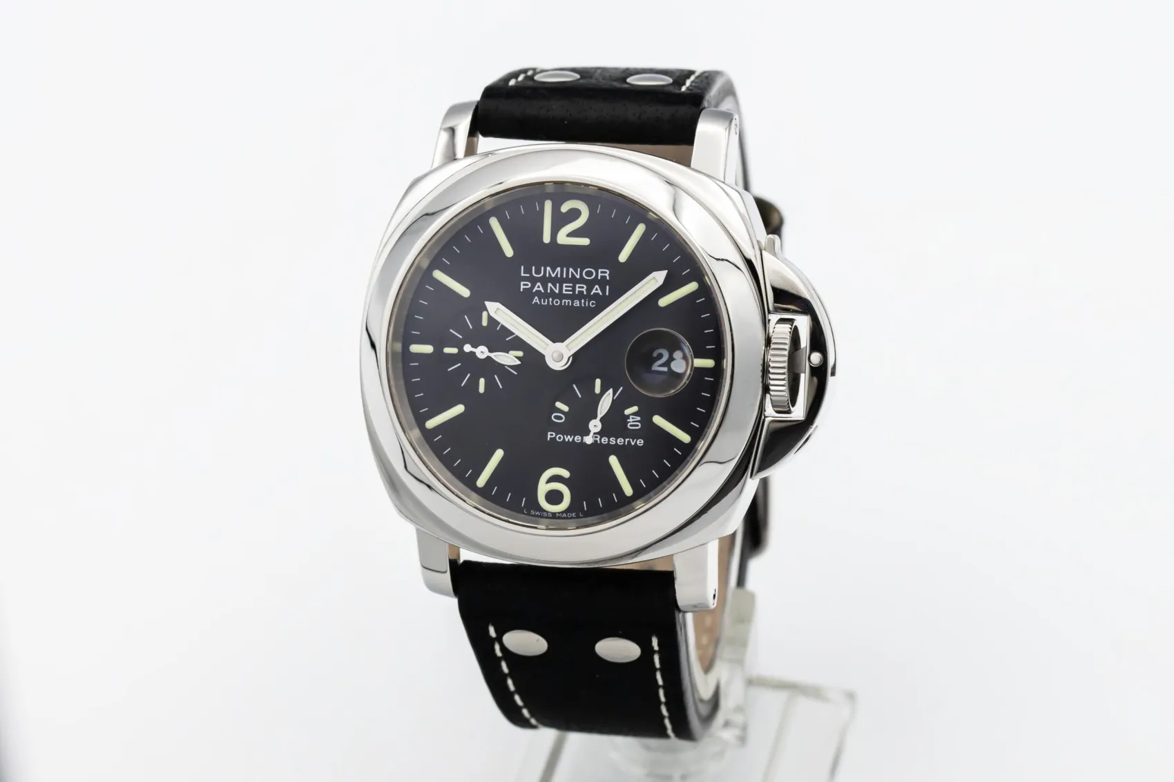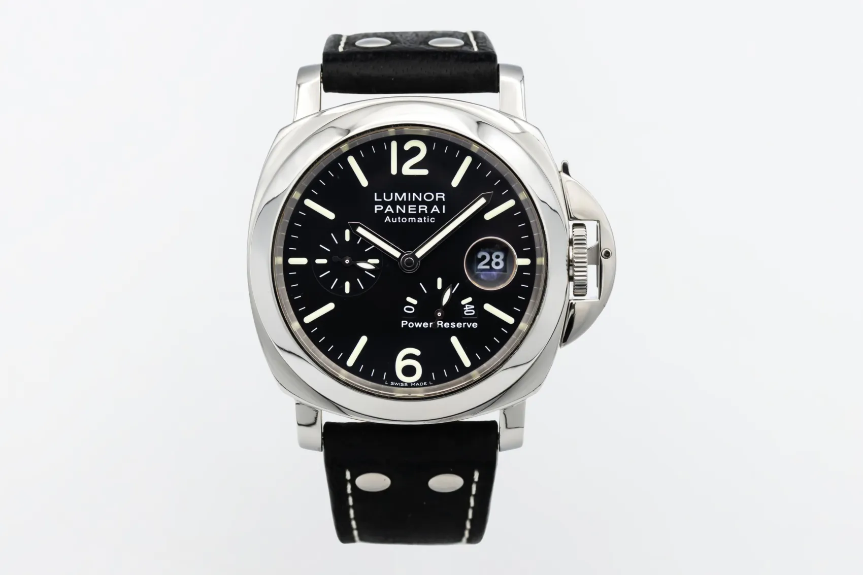 finance this from £49.97 p/m call the shop Read about our Limited Lifetime WarrantyThis circa 2000s Panerai Luminor Power Reserve 44mm is a bold luxury sports watch crafted in stainless steel. The black dial features luminous Arabic numerals, the signature Panerai sandwich construction for exceptional legibility, a small seconds sub-dial, and a power reserve indicator for added functionality. Finished with the iconic crown guard bridge and paired on a black leather strap.
