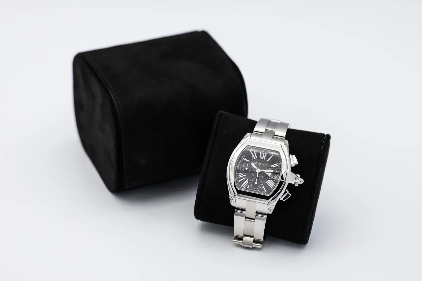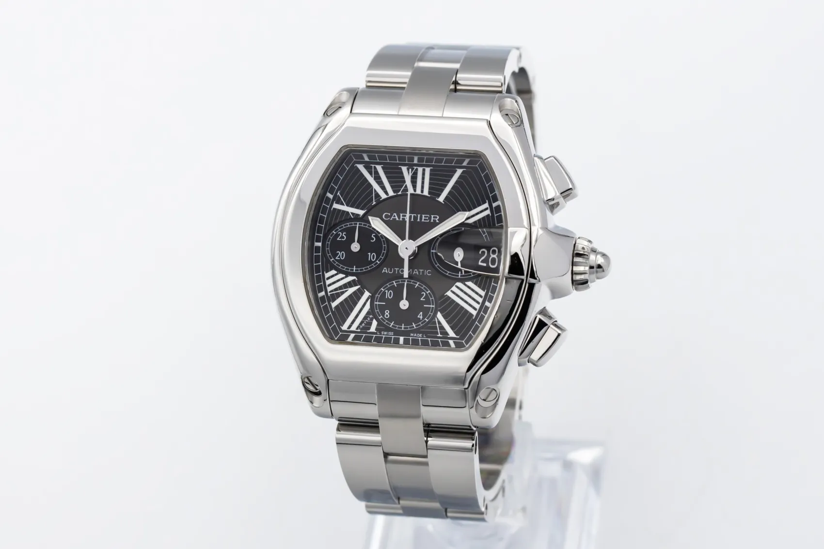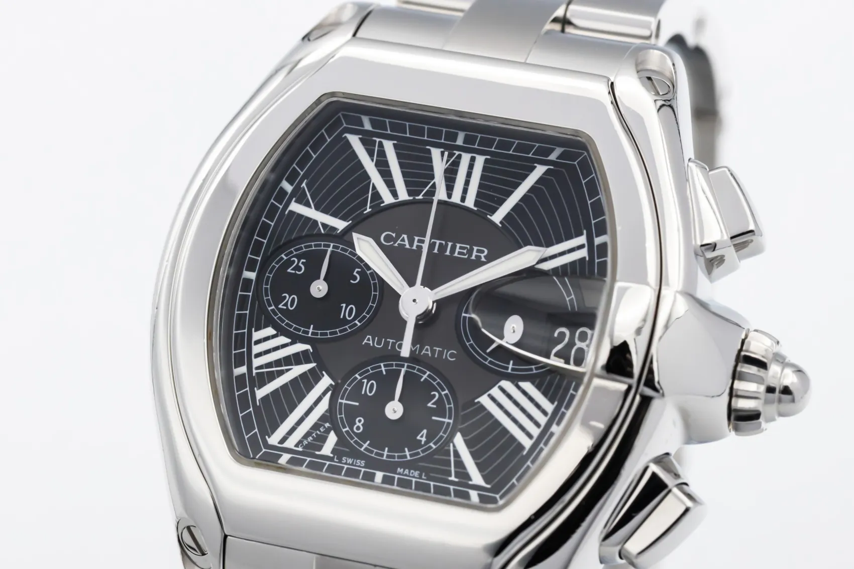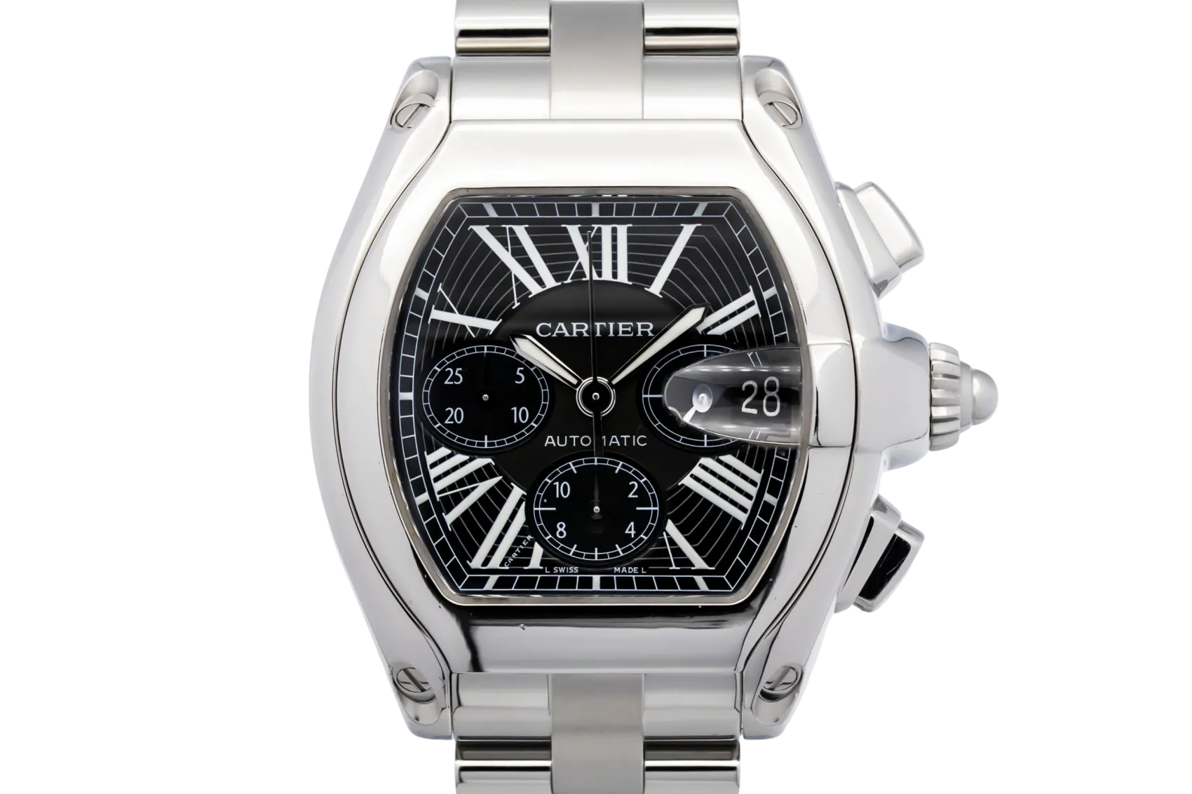finance this from £80.33 p/m call the shop Read about our Limited Lifetime WarrantyThis circa 2010 Cartier Roadster 39mm is a distinctive luxury timepiece crafted in stainless steel. The tonneau-shaped case frames a black dial with bold black Roman numeral hour markers, steel hands, and Cartier’s signature magnified date window for excellent legibility. Finished on a stainless steel Roadster bracelet.