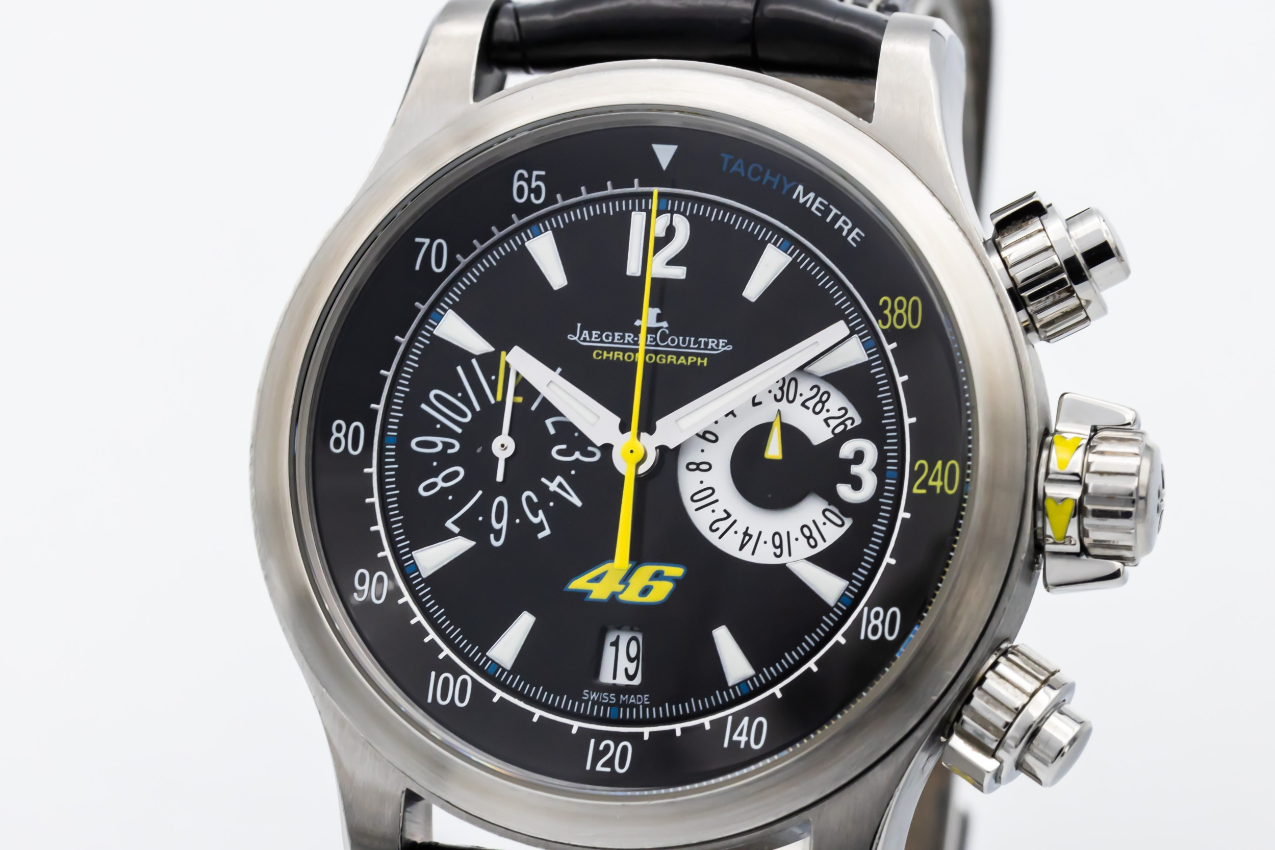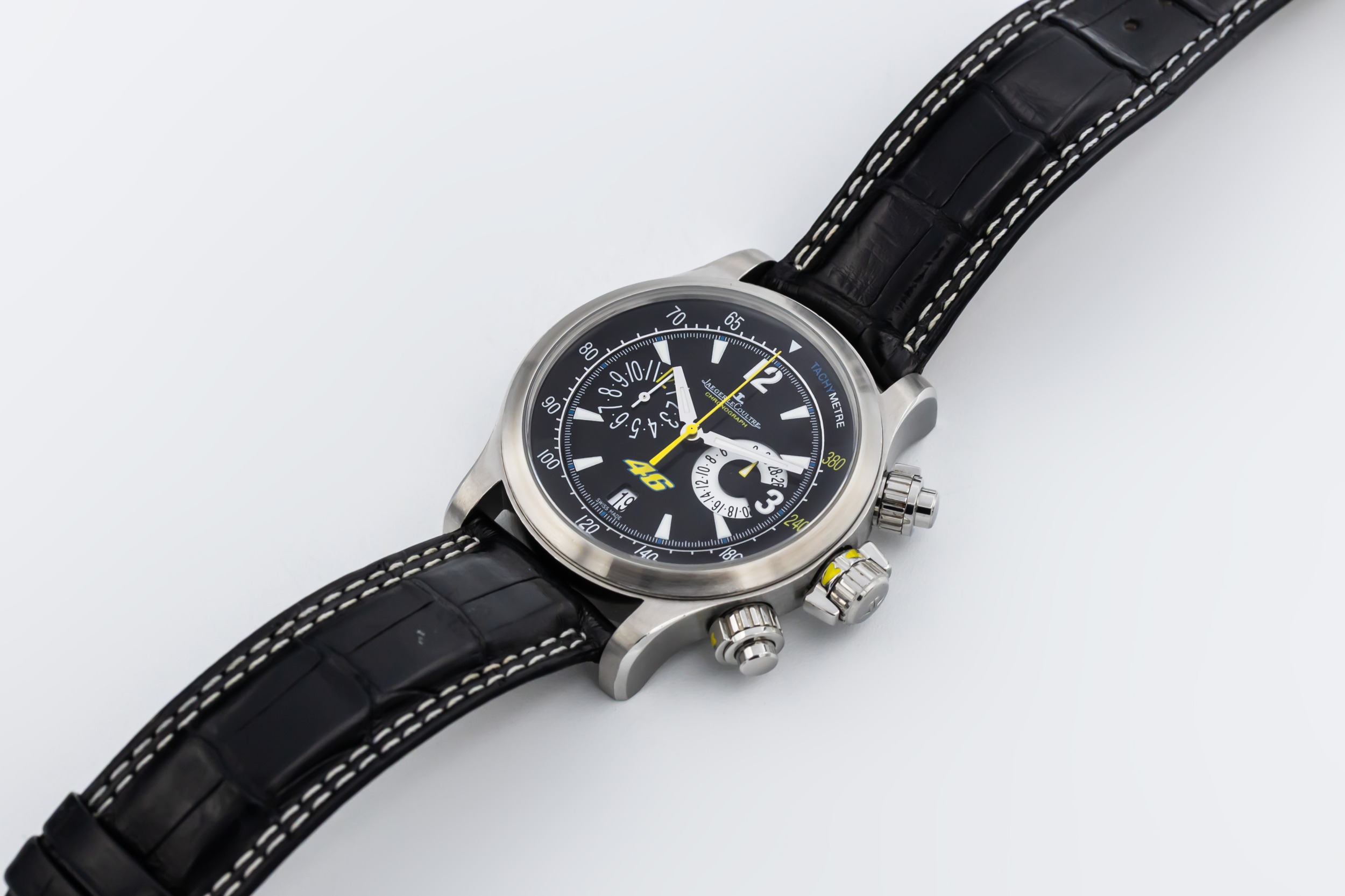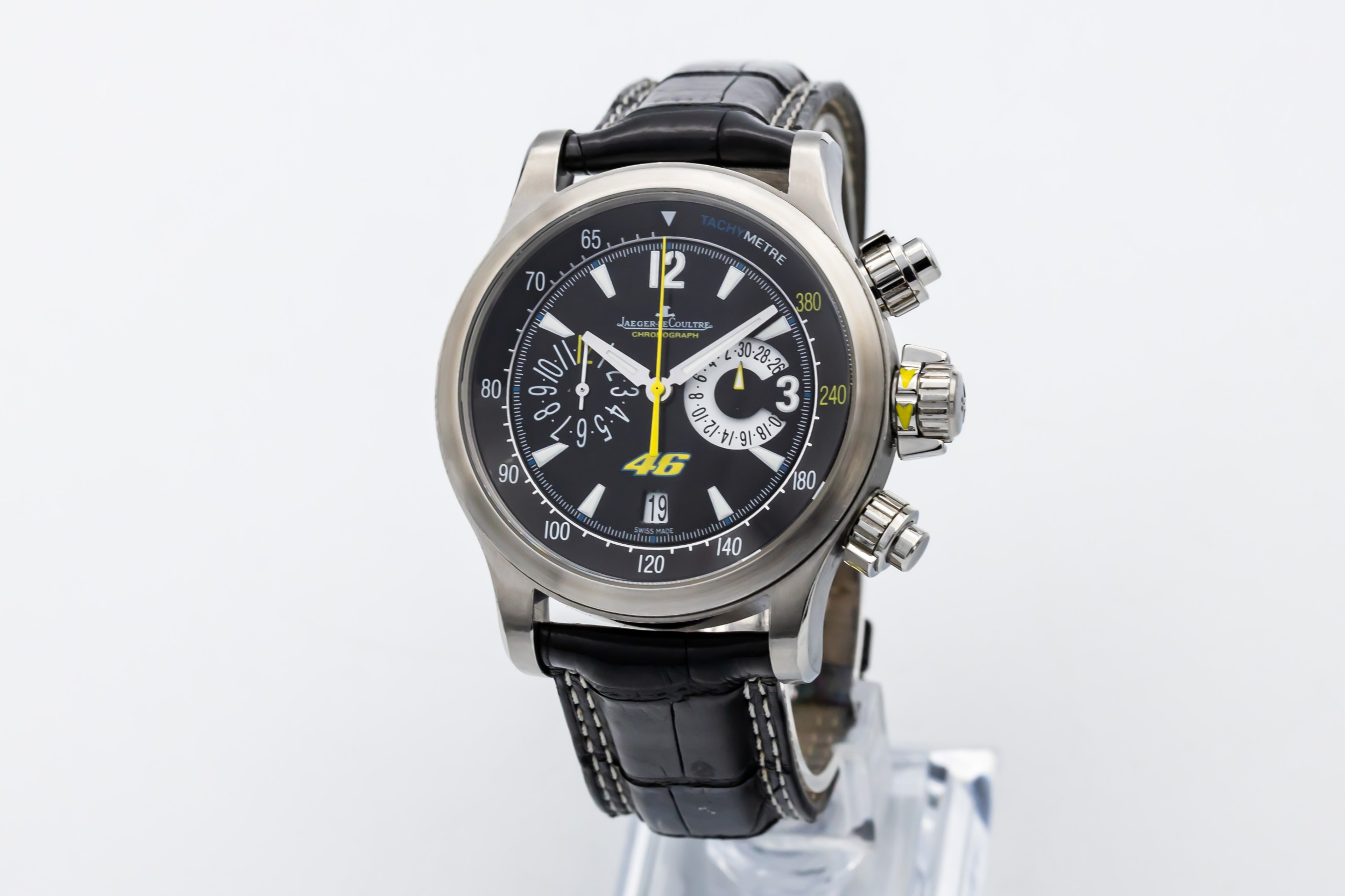 This 2011 Jaeger-LeCoultre Master Compressor 41.5mm is a refined sports watch crafted in stainless steel. The black dial features luminous hour markers, bold hands, and a clean, highly legible layout designed for precision timing. Finished on a black leather strap with a stainless steel deployant clasp.