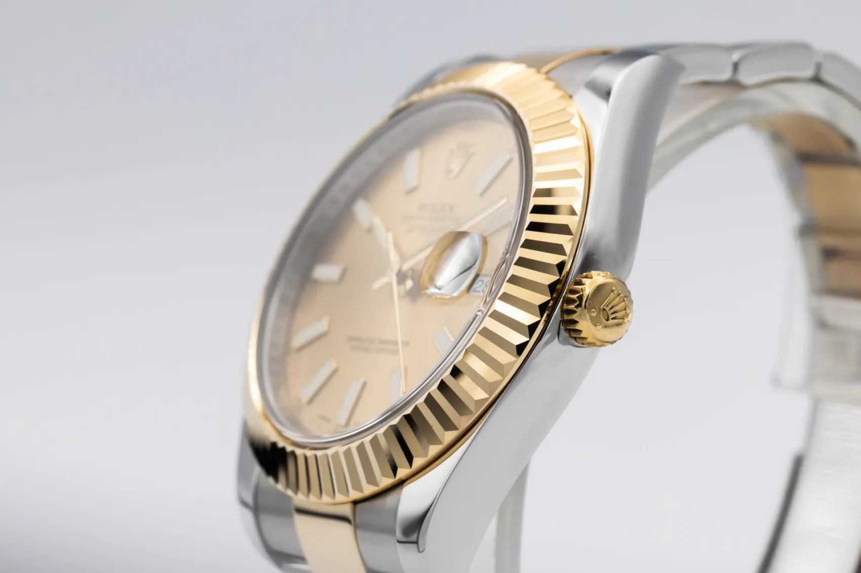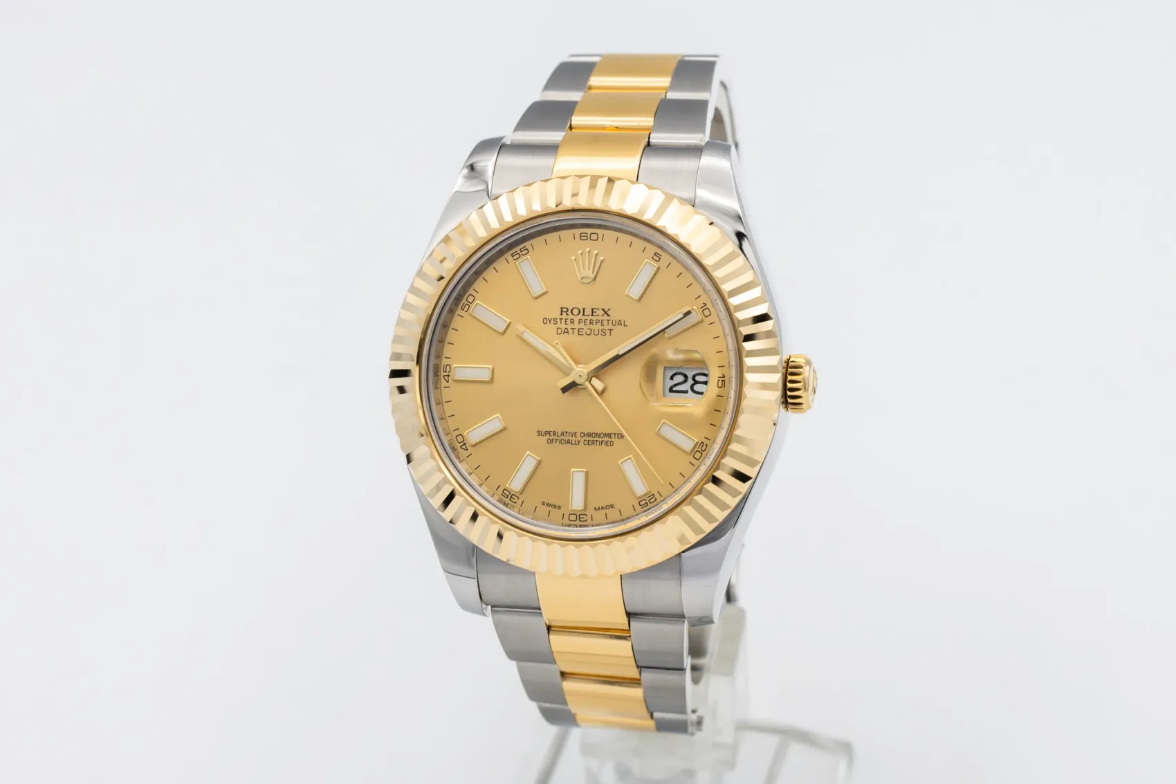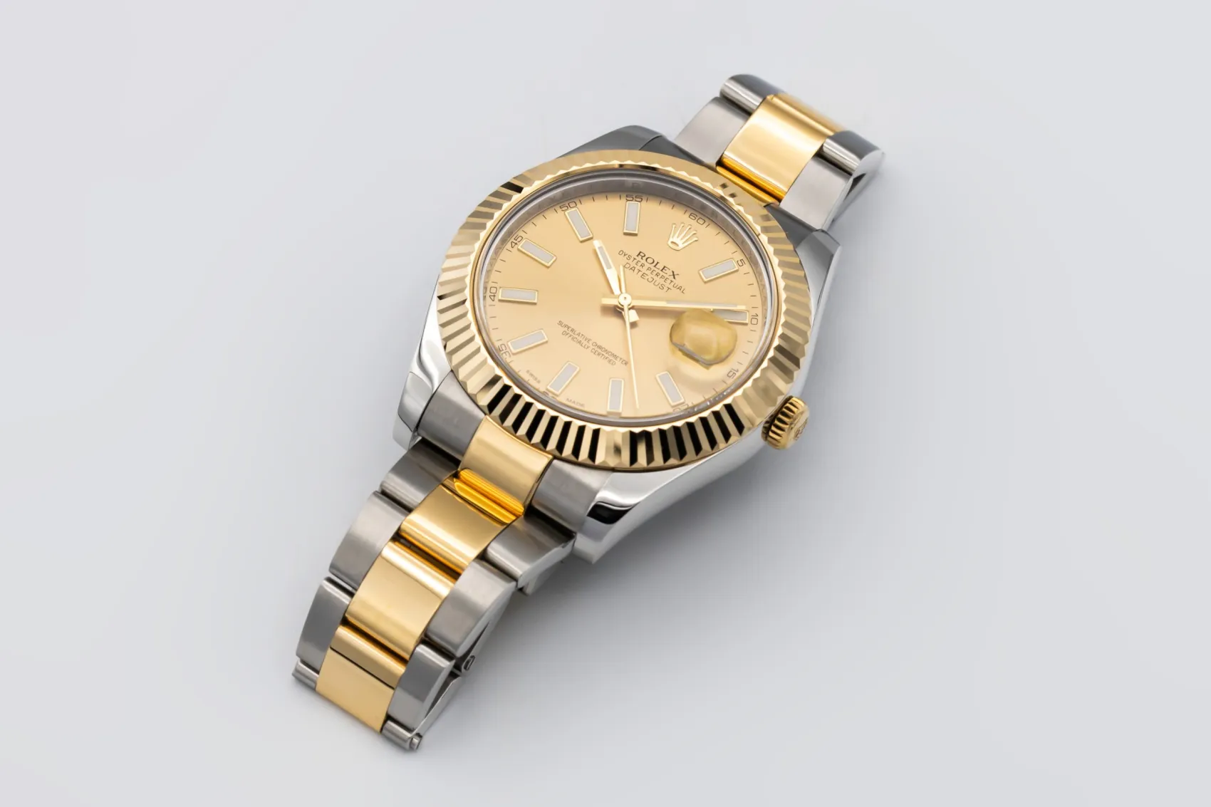 finance this from £151.62 p/m call the shop Read about our Limited Lifetime WarrantyThis 2014 Rolex DateJust II 41mm is a bold luxury timepiece crafted in stainless steel and 18ct yellow gold. The refined champagne dial is paired with baton hour markers and framed by a fluted yellow gold bezel, delivering strong wrist presence with classic Rolex elegance. Finished on a steel and yellow gold Oyster bracelet with a secure Oysterclasp.