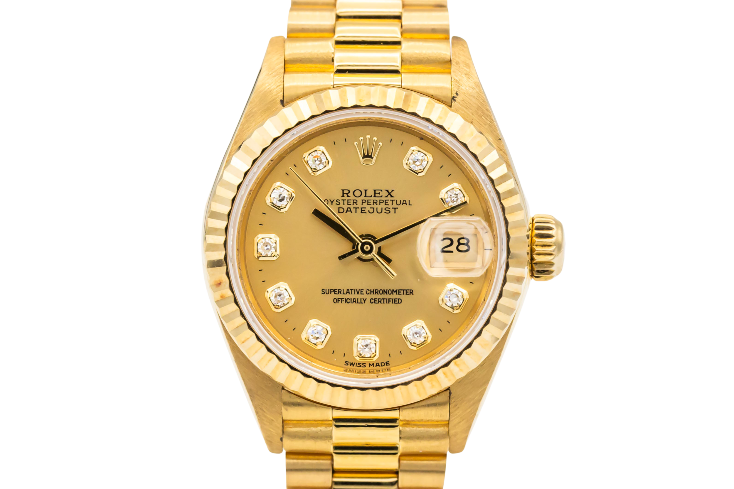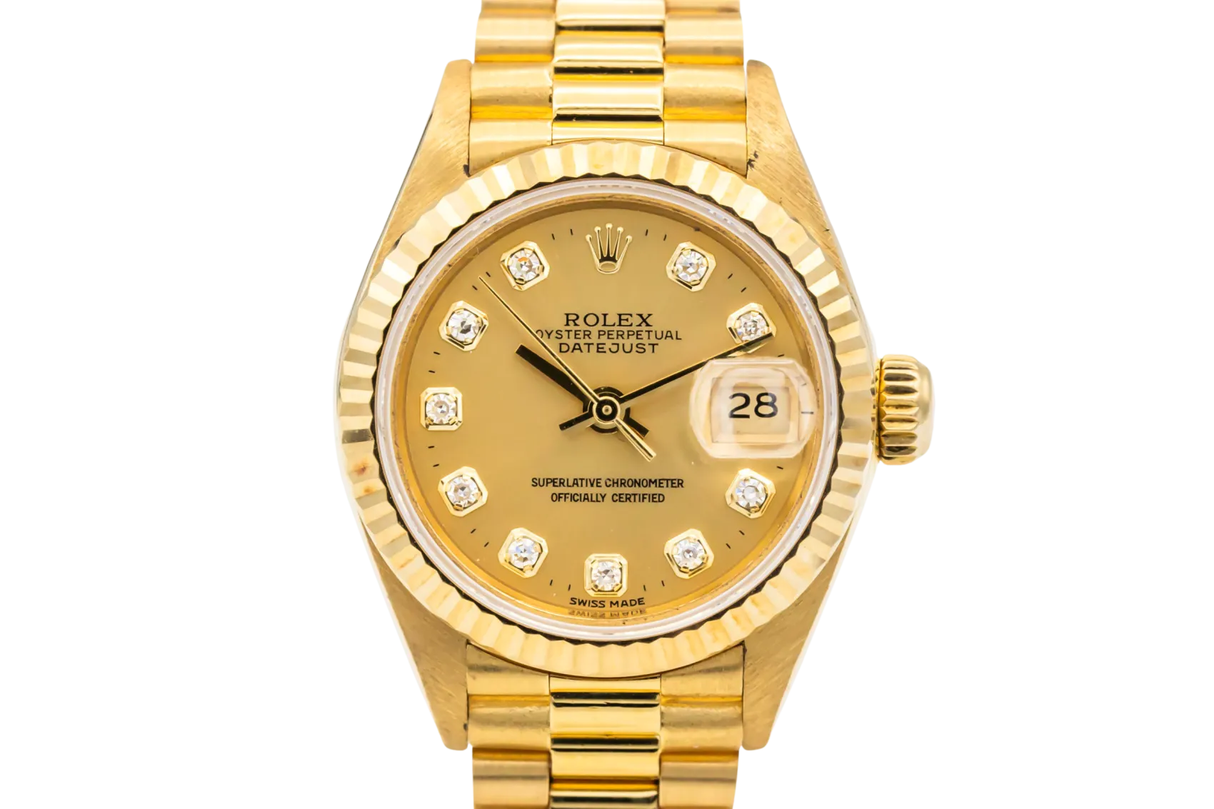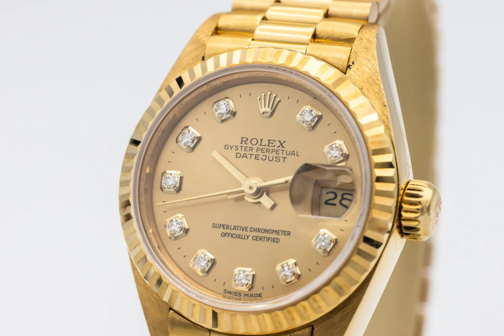 finance this from £151.62 p/m call the shop Read about our Limited Lifetime WarrantyThis 1998 Rolex Lady DateJust 26mm is a classic luxury timepiece crafted in solid 18ct yellow gold. The elegant champagne dial is complemented by diamond hour markers and the signature date window at 3 o’clock, offering timeless Rolex style with excellent legibility. Finished with a fluted yellow gold bezel and the prestigious 18ct yellow gold President bracelet.