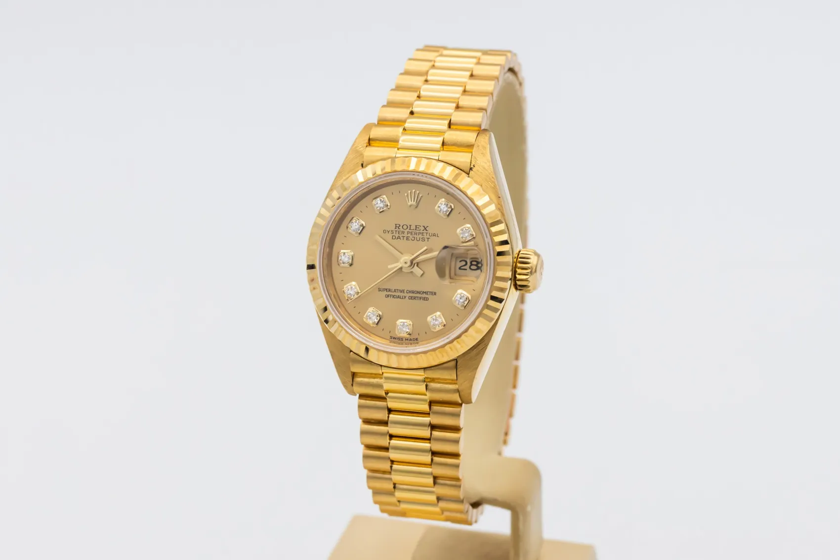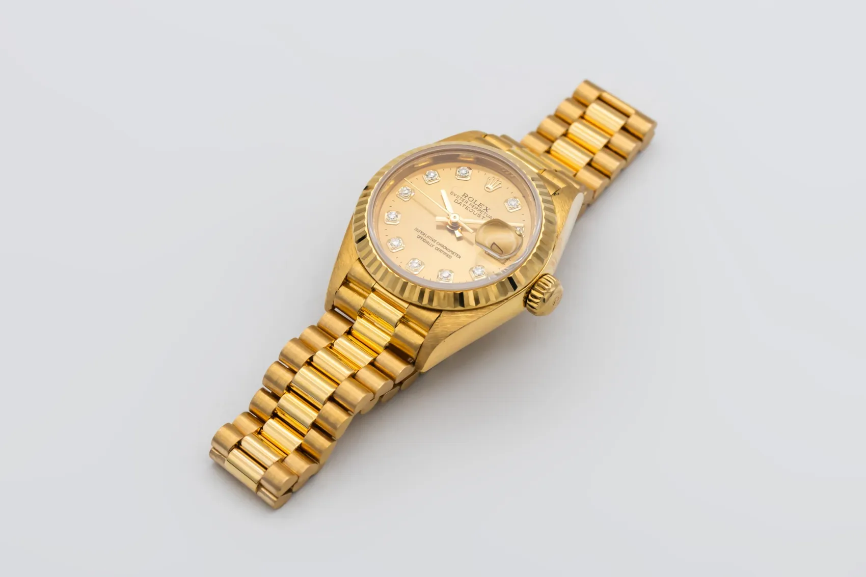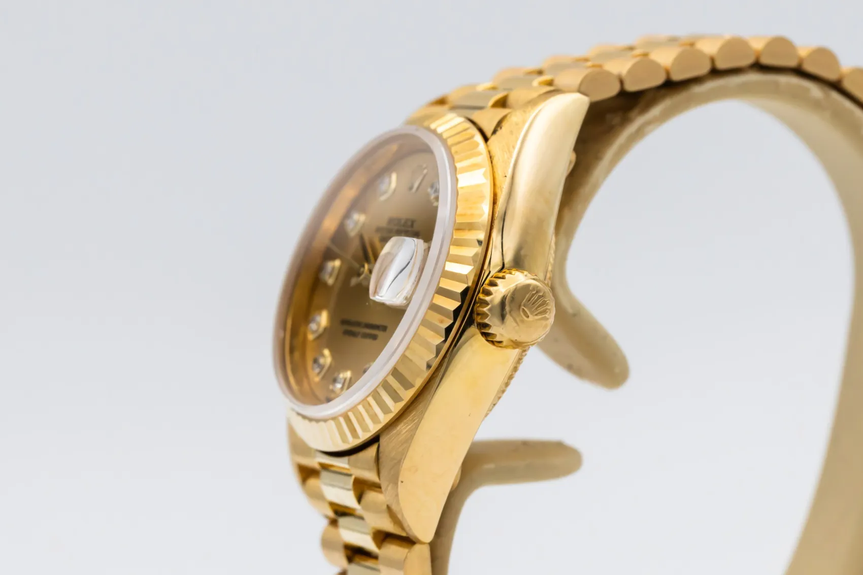 finance this from £151.62 p/m call the shop Read about our Limited Lifetime WarrantyThis 1998 Rolex Lady DateJust 26mm is a classic luxury timepiece crafted in solid 18ct yellow gold. The elegant champagne dial is complemented by diamond hour markers and the signature date window at 3 o’clock, offering timeless Rolex style with excellent legibility. Finished with a fluted yellow gold bezel and the prestigious 18ct yellow gold President bracelet.