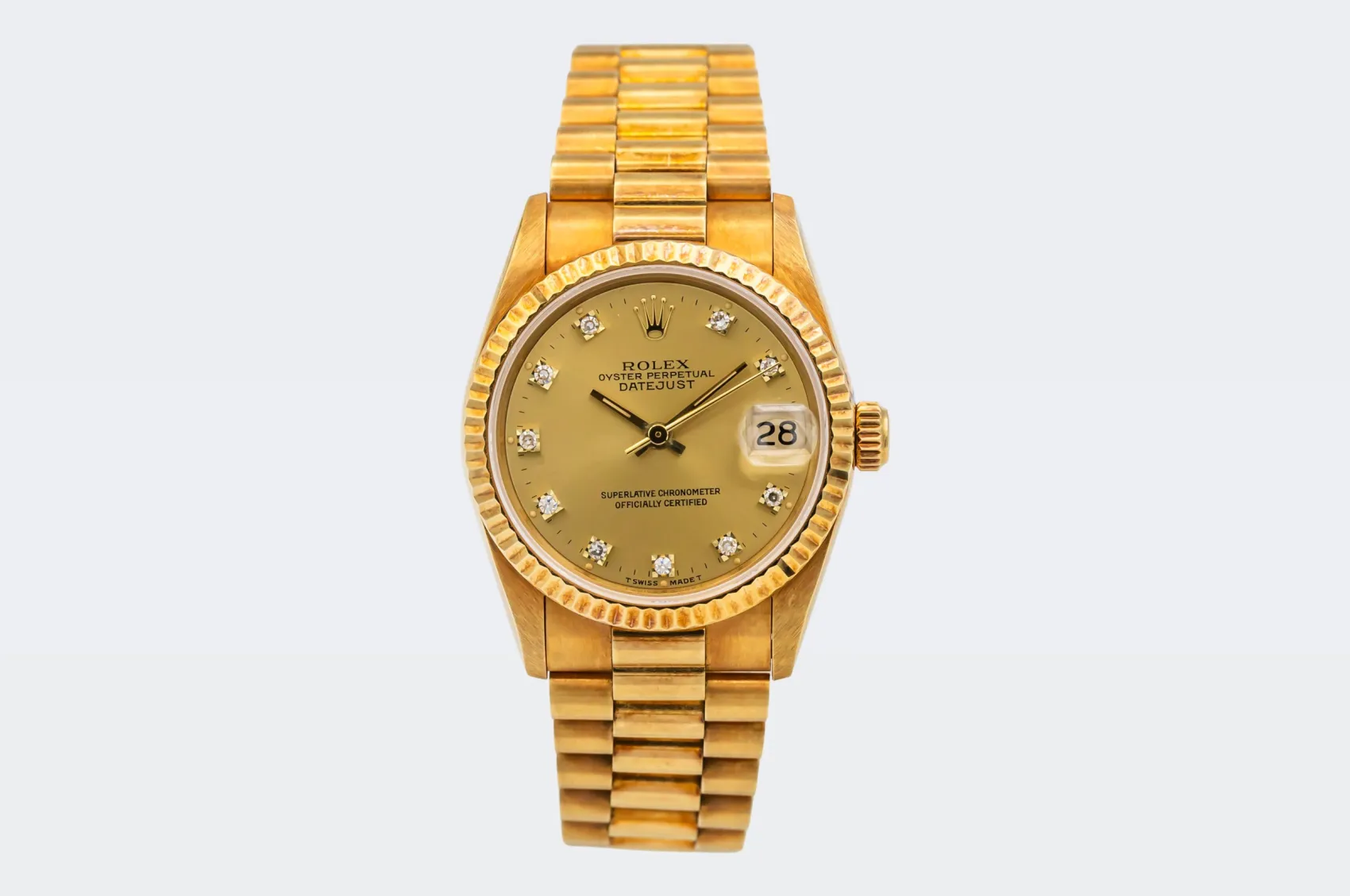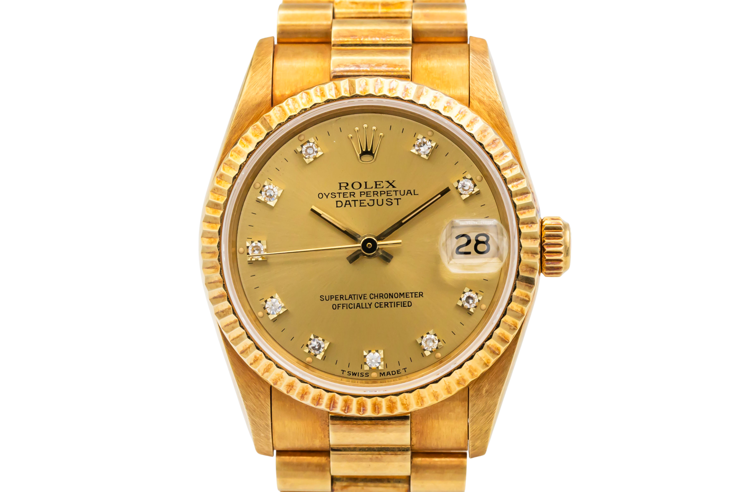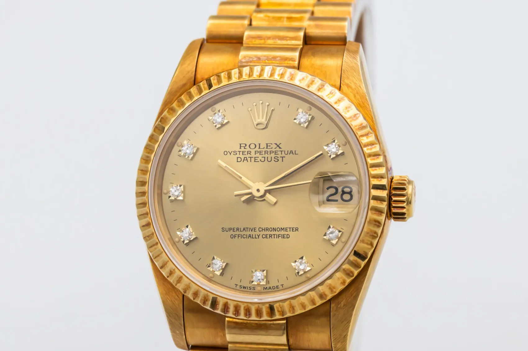finance this from £233.81 p/m call the shop Read about our Limited Lifetime WarrantyThis 1995 Rolex DateJust 31mm is a classic luxury timepiece crafted in solid 18ct yellow gold. The elegant champagne dial is complemented by diamond hour markers and the signature date window at 3 o’clock, offering timeless Rolex aesthetics with excellent legibility. Finished with a fluted yellow gold bezel and the prestigious 18ct yellow gold President bracelet.