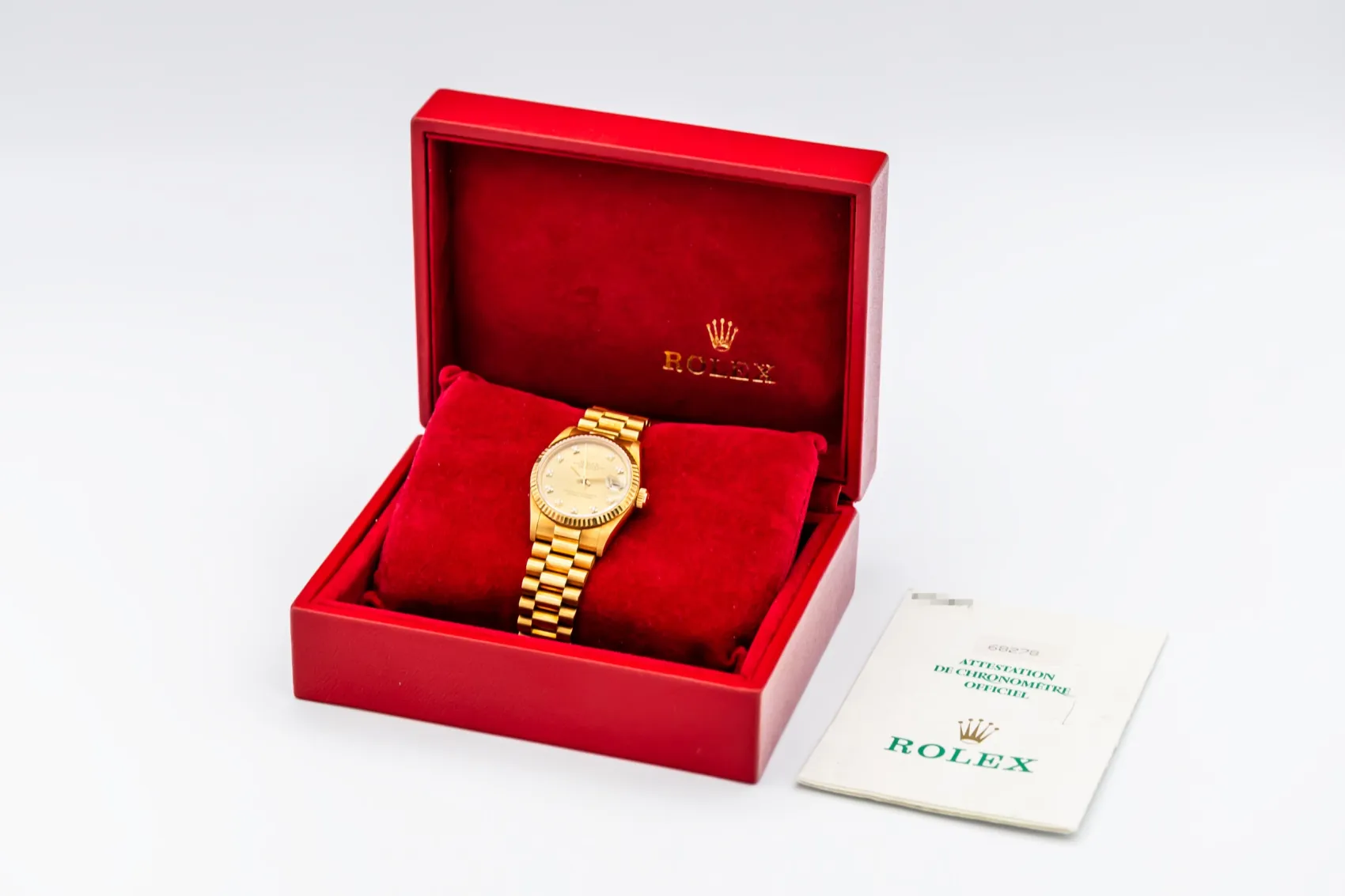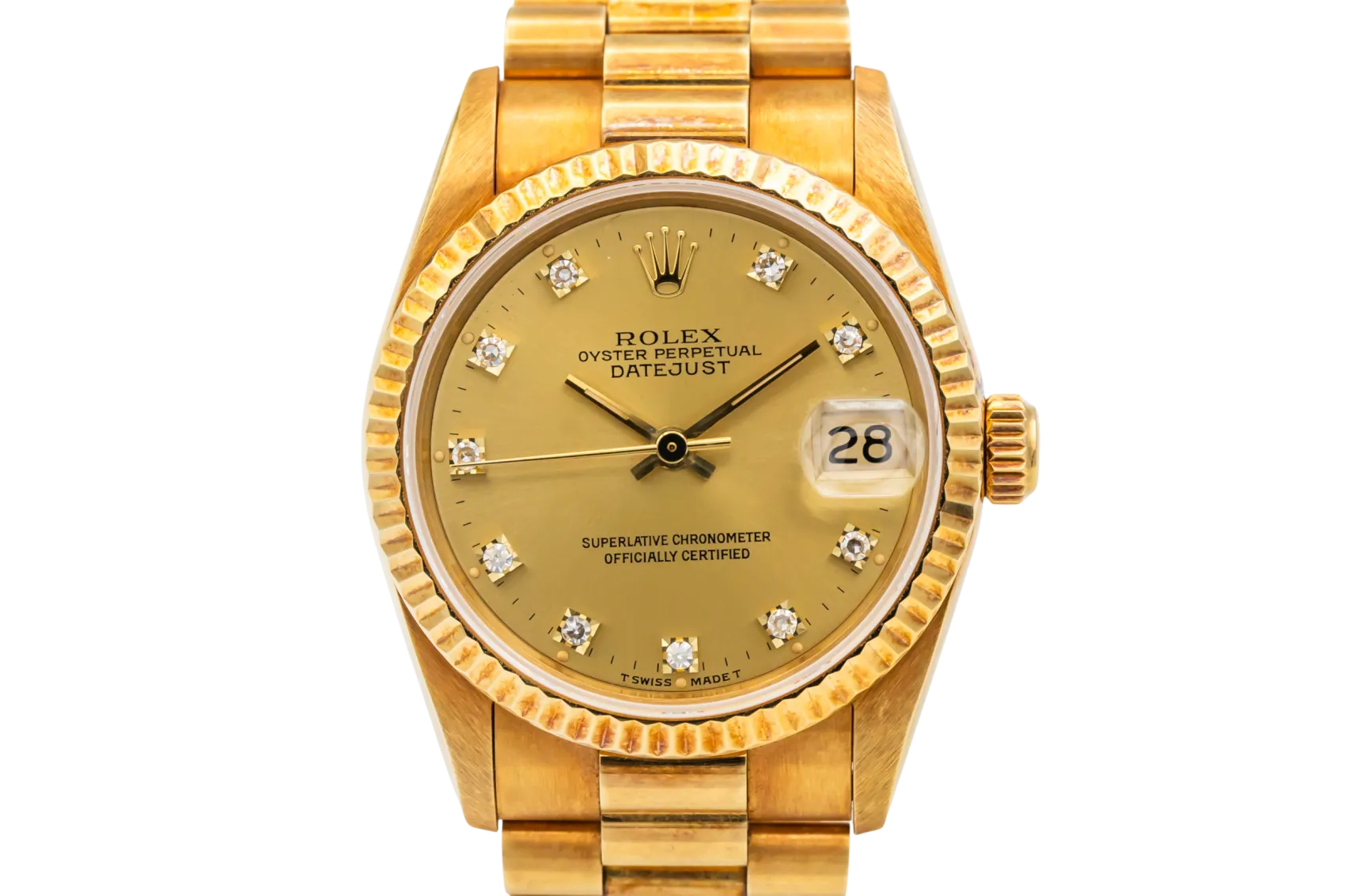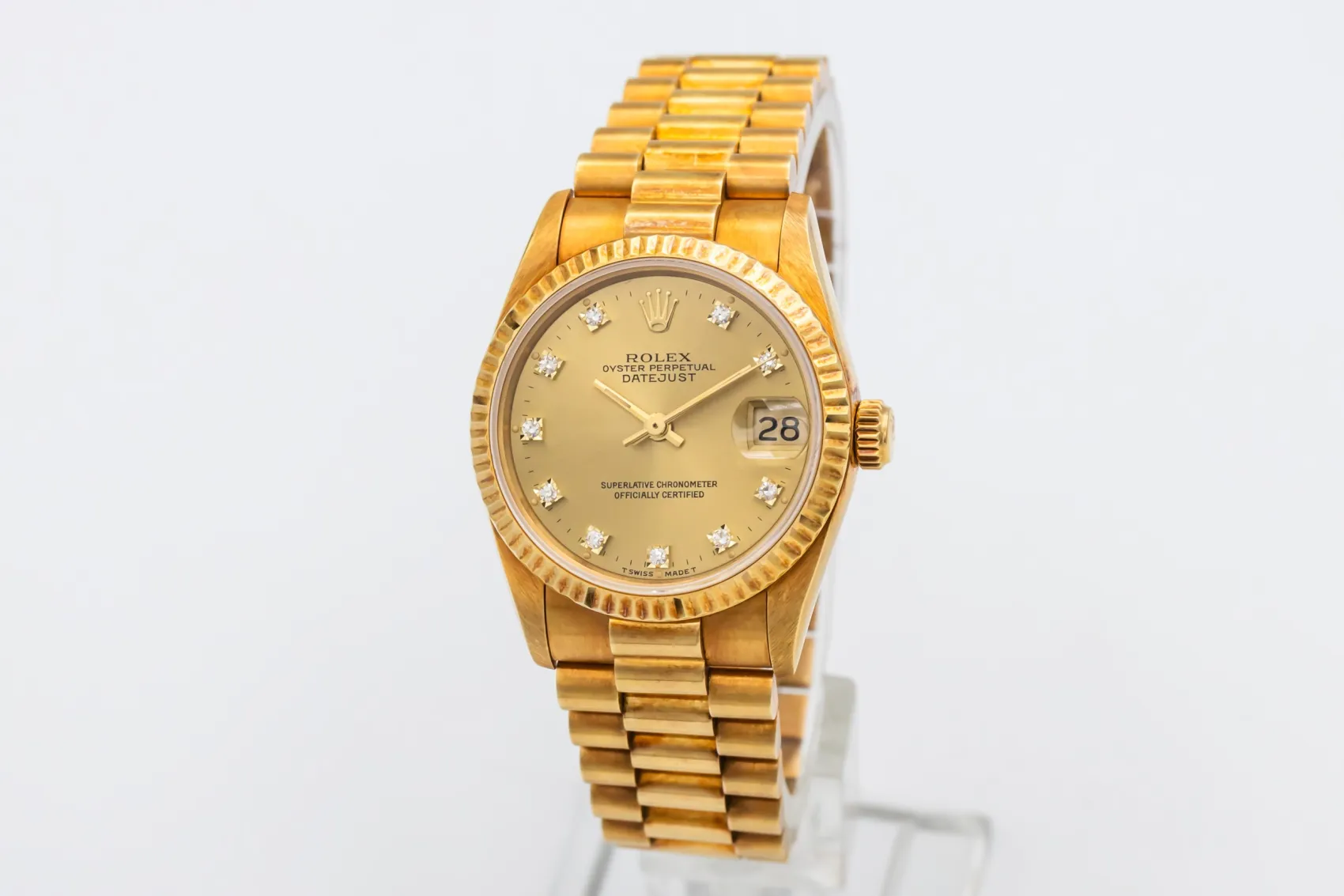 finance this from £233.81 p/m call the shop Read about our Limited Lifetime WarrantyThis 1995 Rolex DateJust 31mm is a classic luxury timepiece crafted in solid 18ct yellow gold. The elegant champagne dial is complemented by diamond hour markers and the signature date window at 3 o’clock, offering timeless Rolex aesthetics with excellent legibility. Finished with a fluted yellow gold bezel and the prestigious 18ct yellow gold President bracelet.