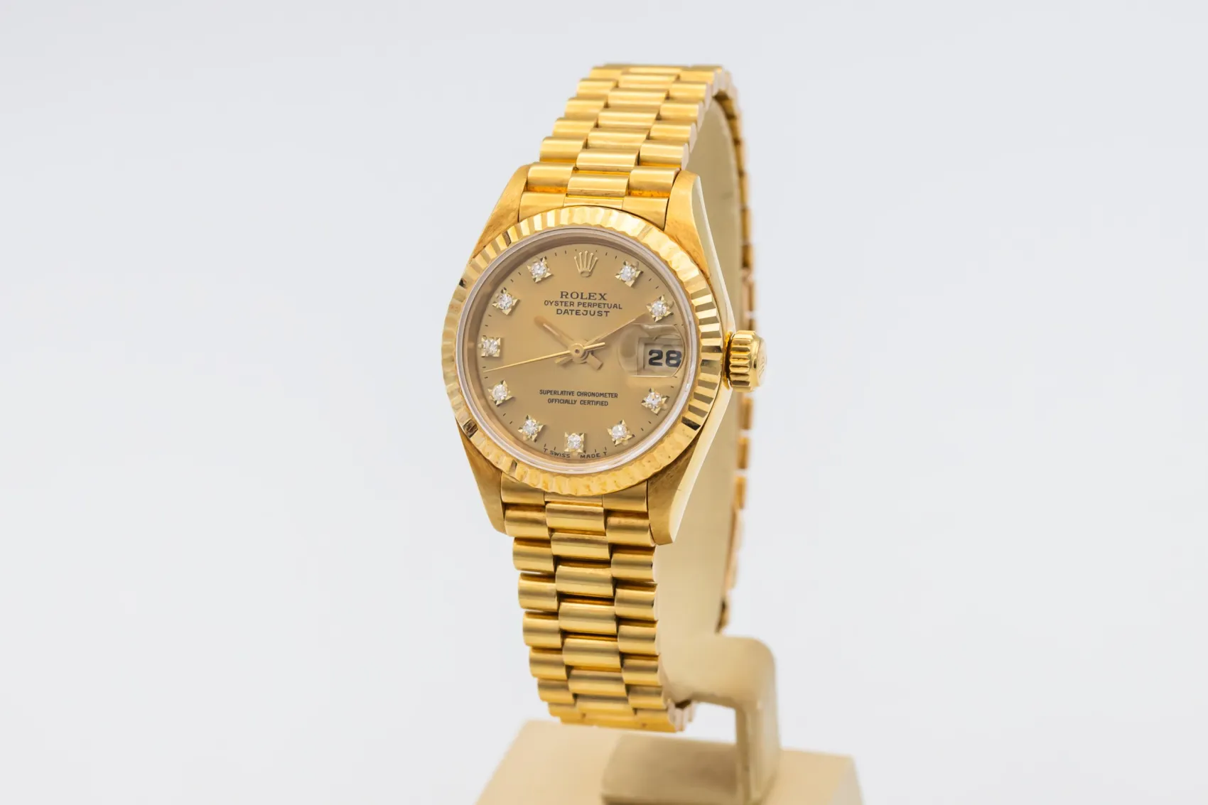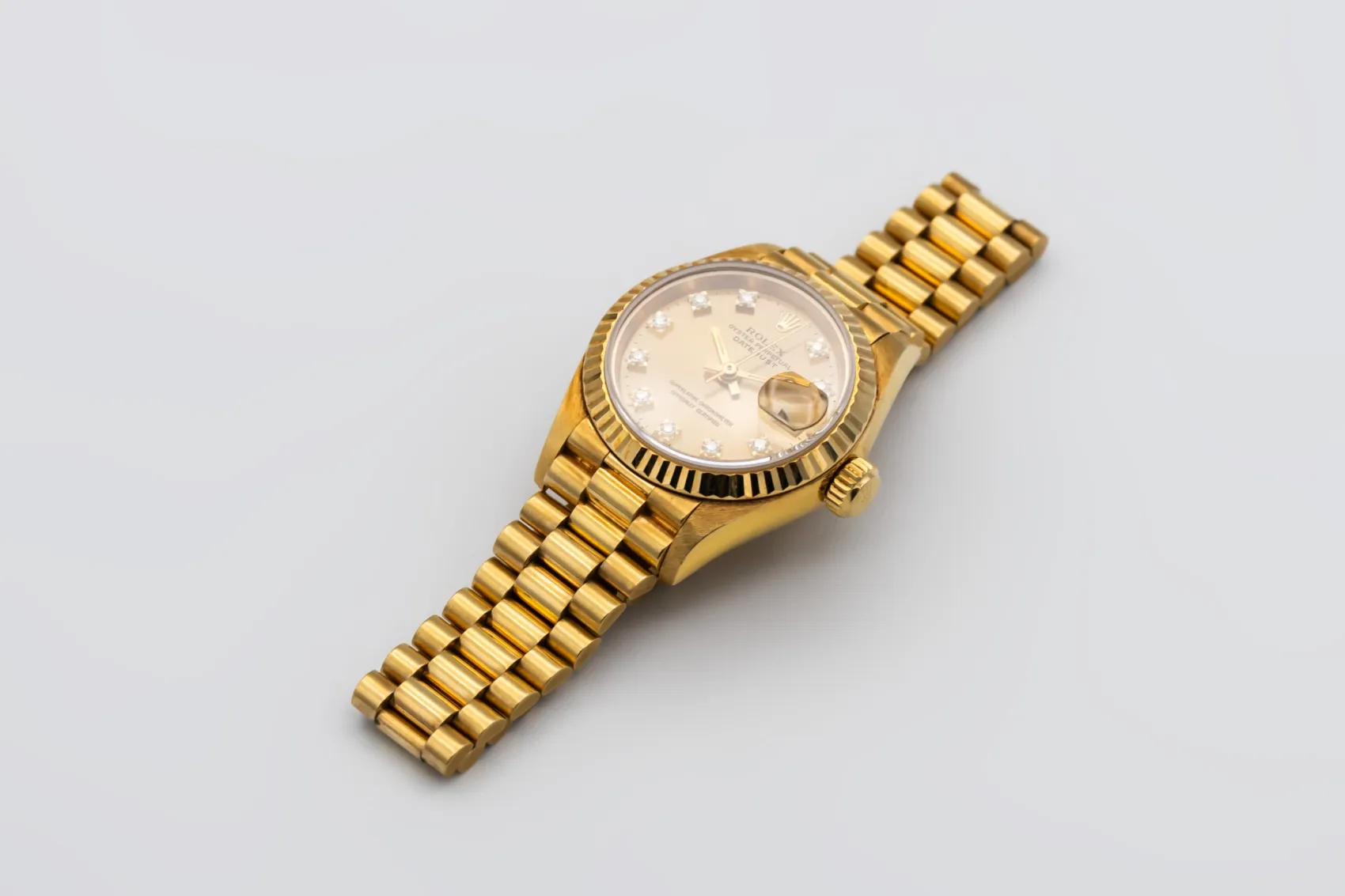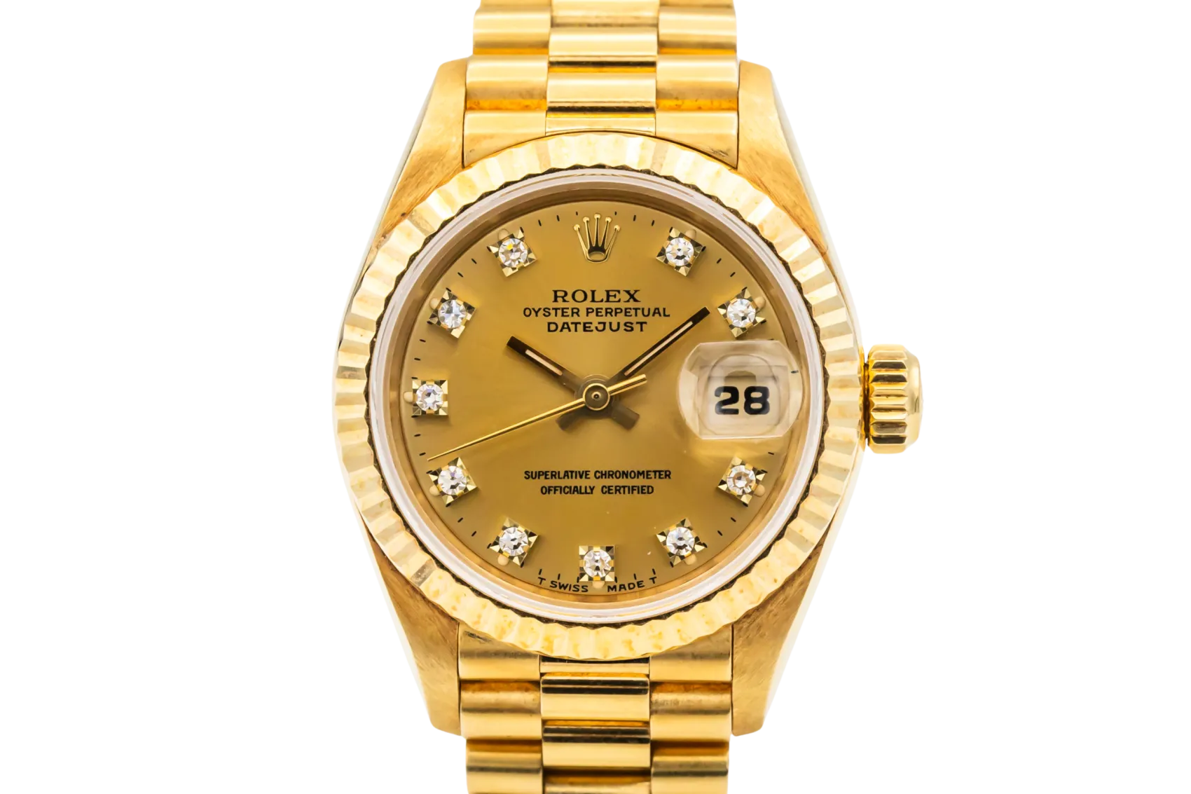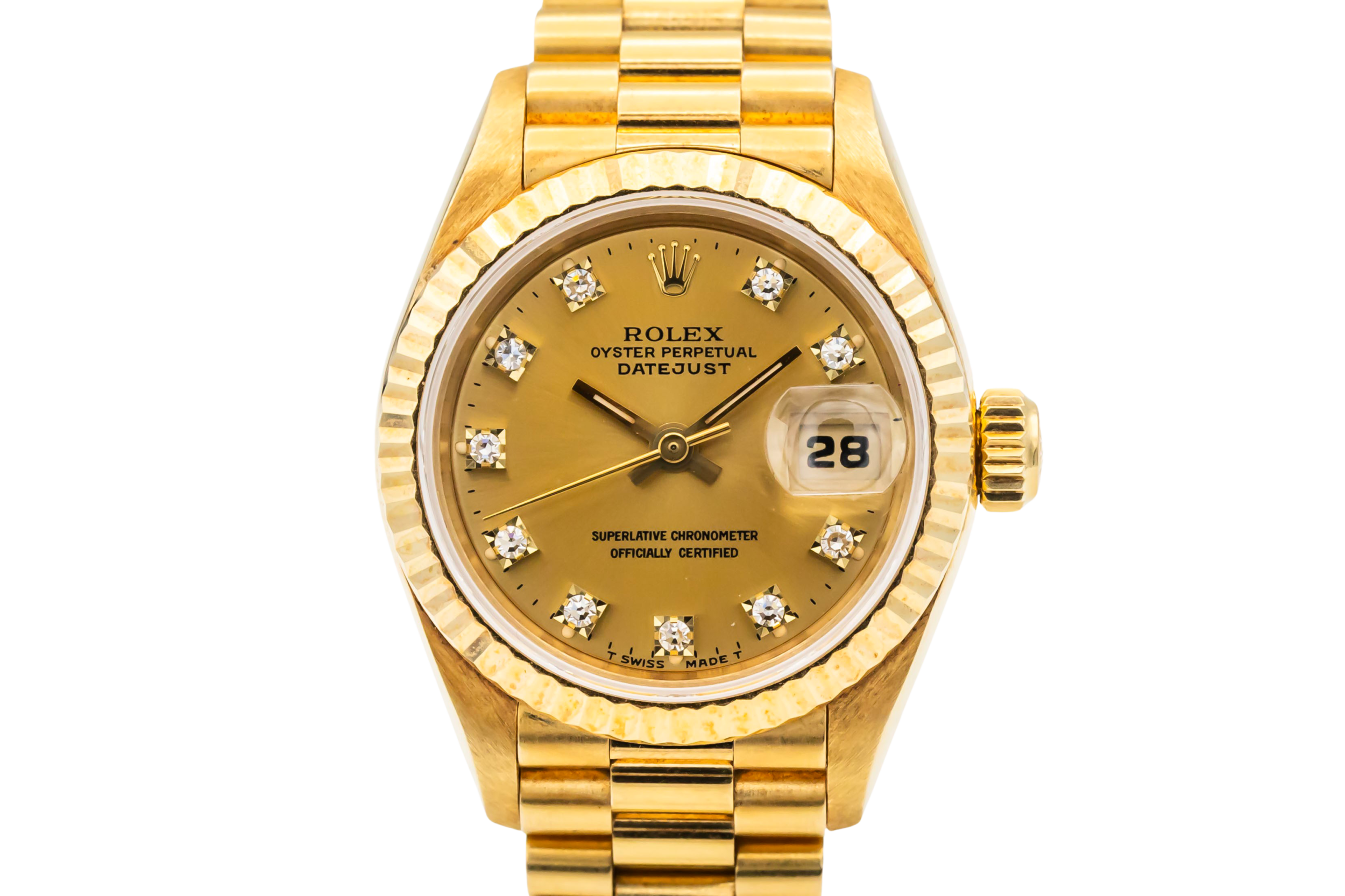 finance this from £148.5 p/m call the shop Read about our Limited Lifetime WarrantyThis 1994 Rolex Lady DateJust 26mm is a classic luxury timepiece crafted in solid 18ct yellow gold. The elegant champagne dial is paired with diamond hour markers and the signature date window at 3 o’clock, offering timeless Rolex style with excellent legibility. Finished with a fluted yellow gold bezel and the prestigious 18ct yellow gold President bracelet.