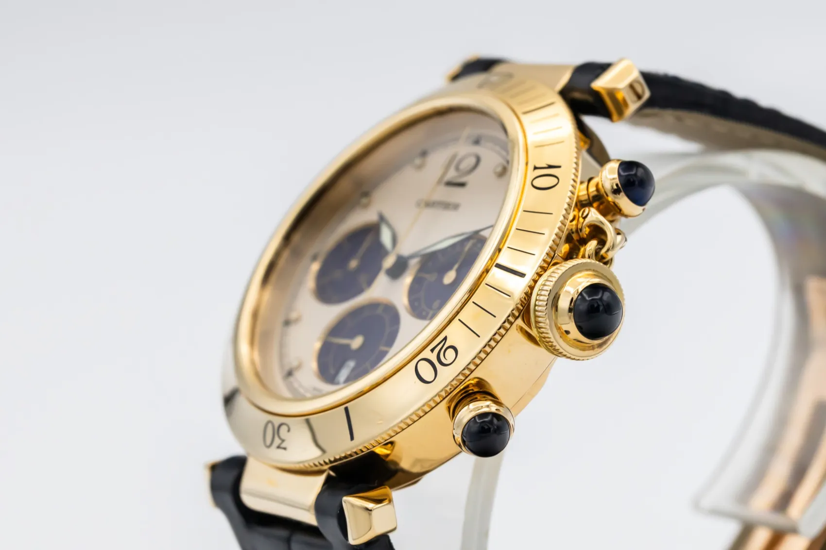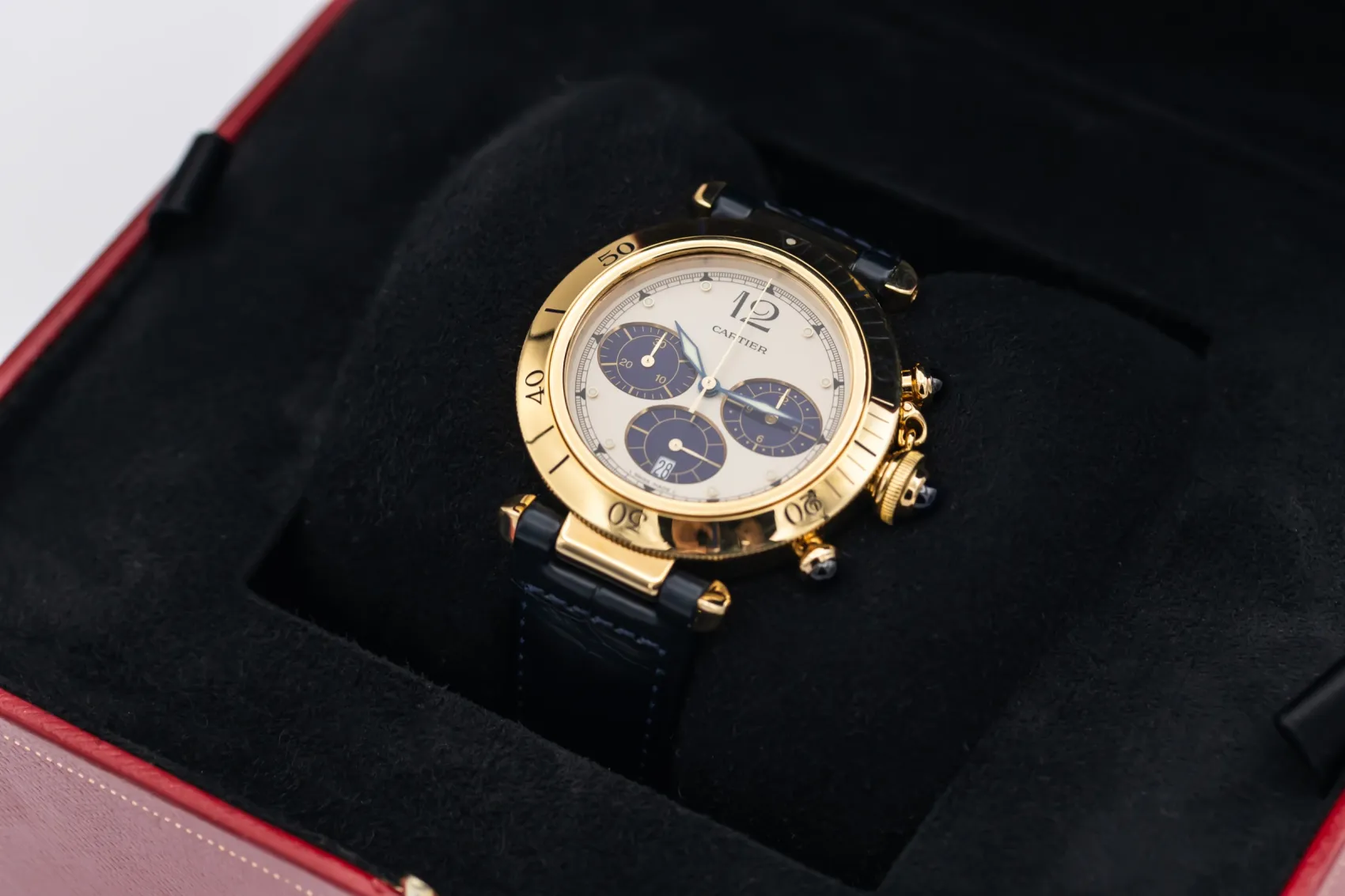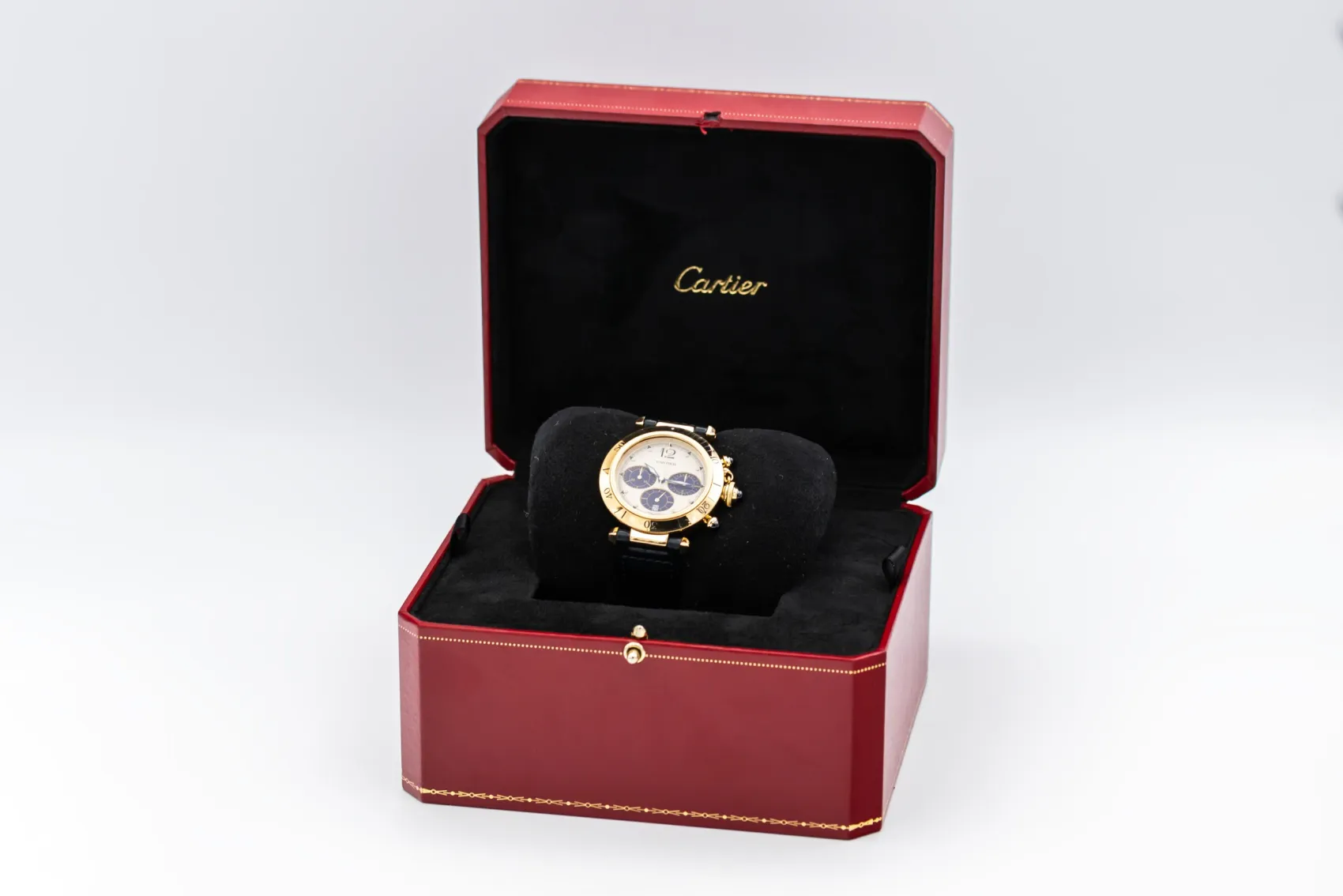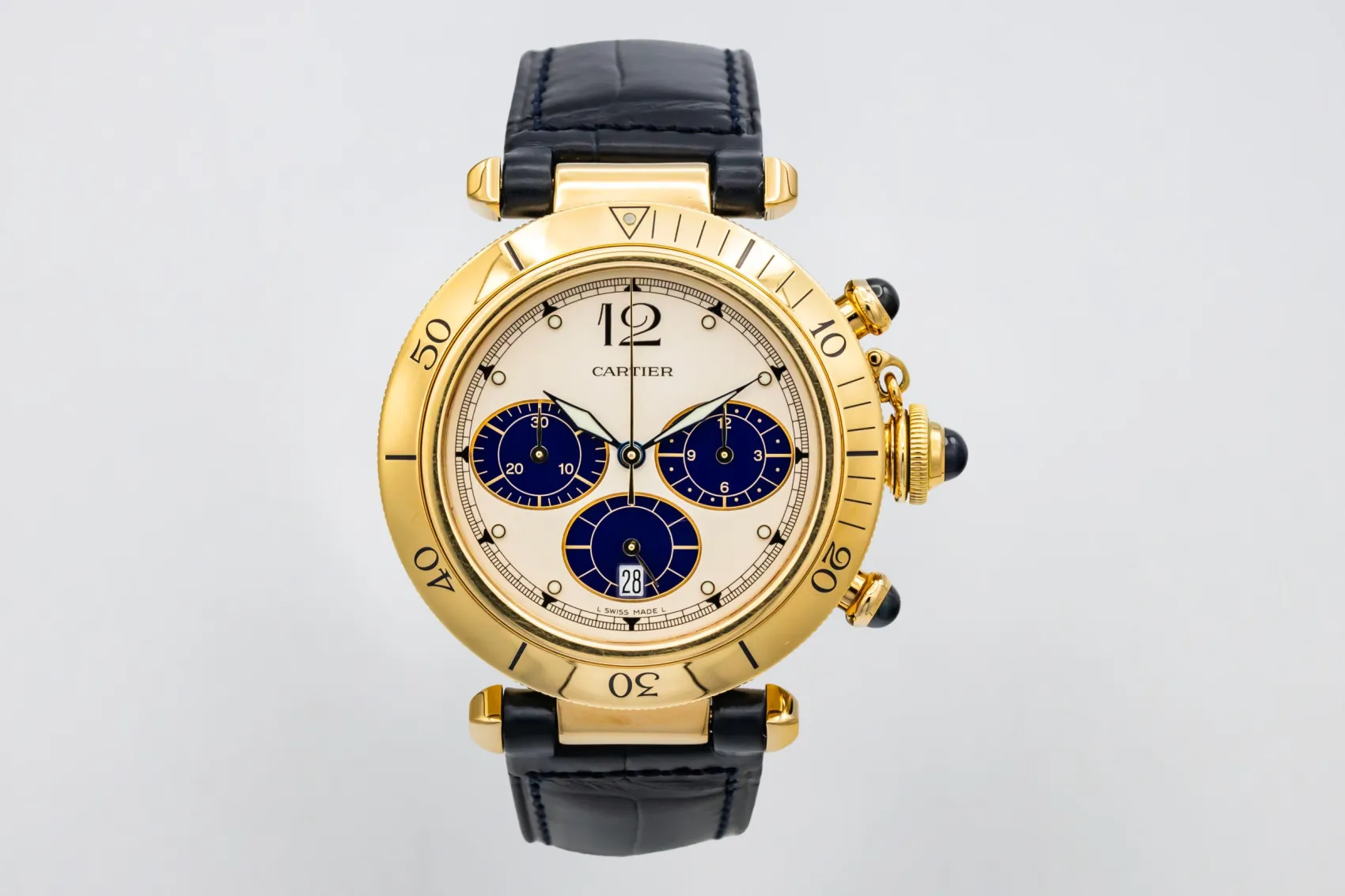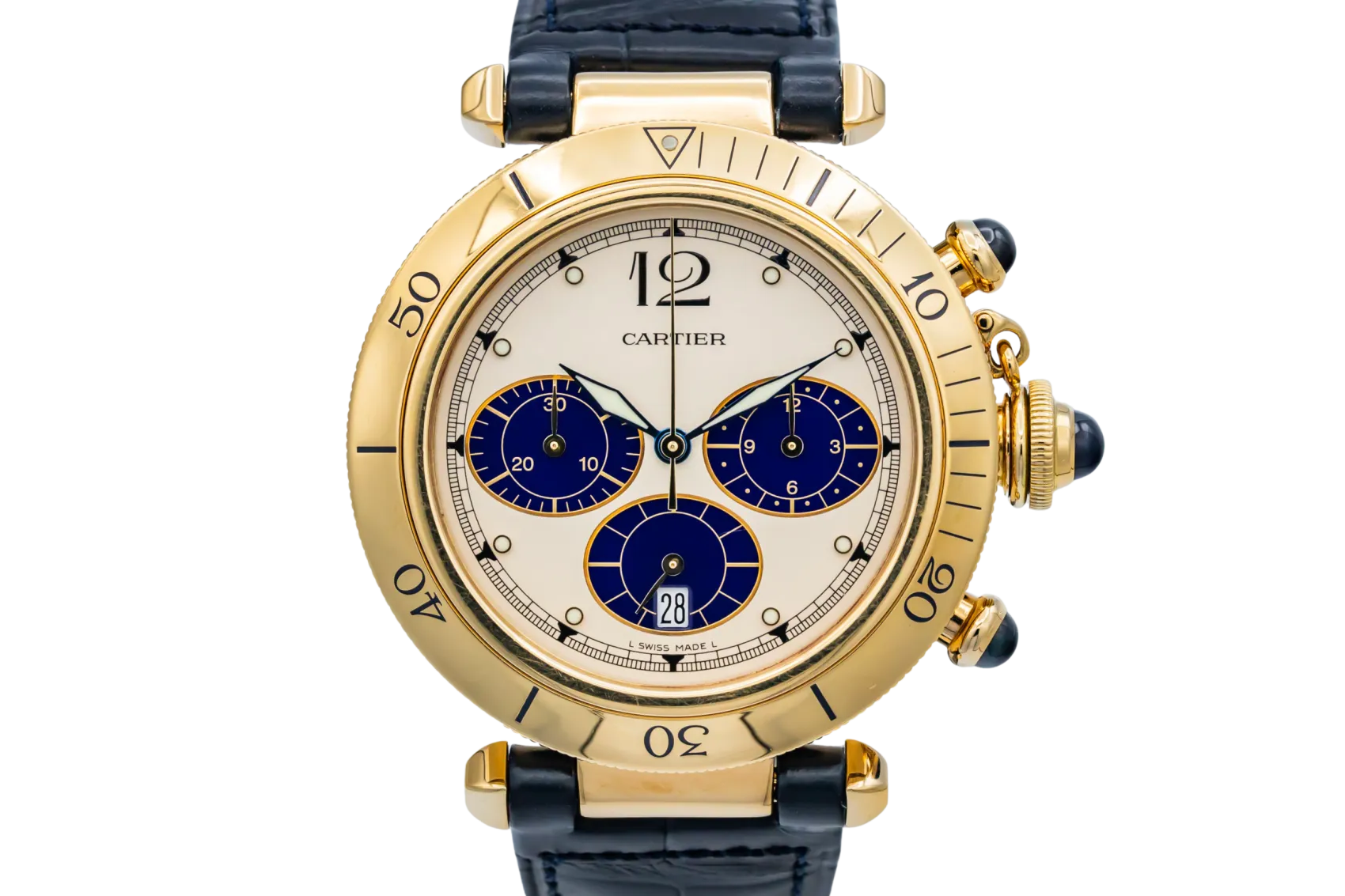 finance this from £140.68 p/m call the shop Read about our Limited Lifetime WarrantyThis 1996 Cartier Pasha Chronograph is a striking luxury timepiece crafted in solid 18ct yellow gold. The cream dial is contrasted by deep blue chronograph sub-dials, Arabic numerals, and luminous hands. Finished with a rotating gold bezel, blue cabochon crown and pushers, and fitted to a dark blue leather strap, this Pasha delivers strong presence with unmistakable Cartier character.