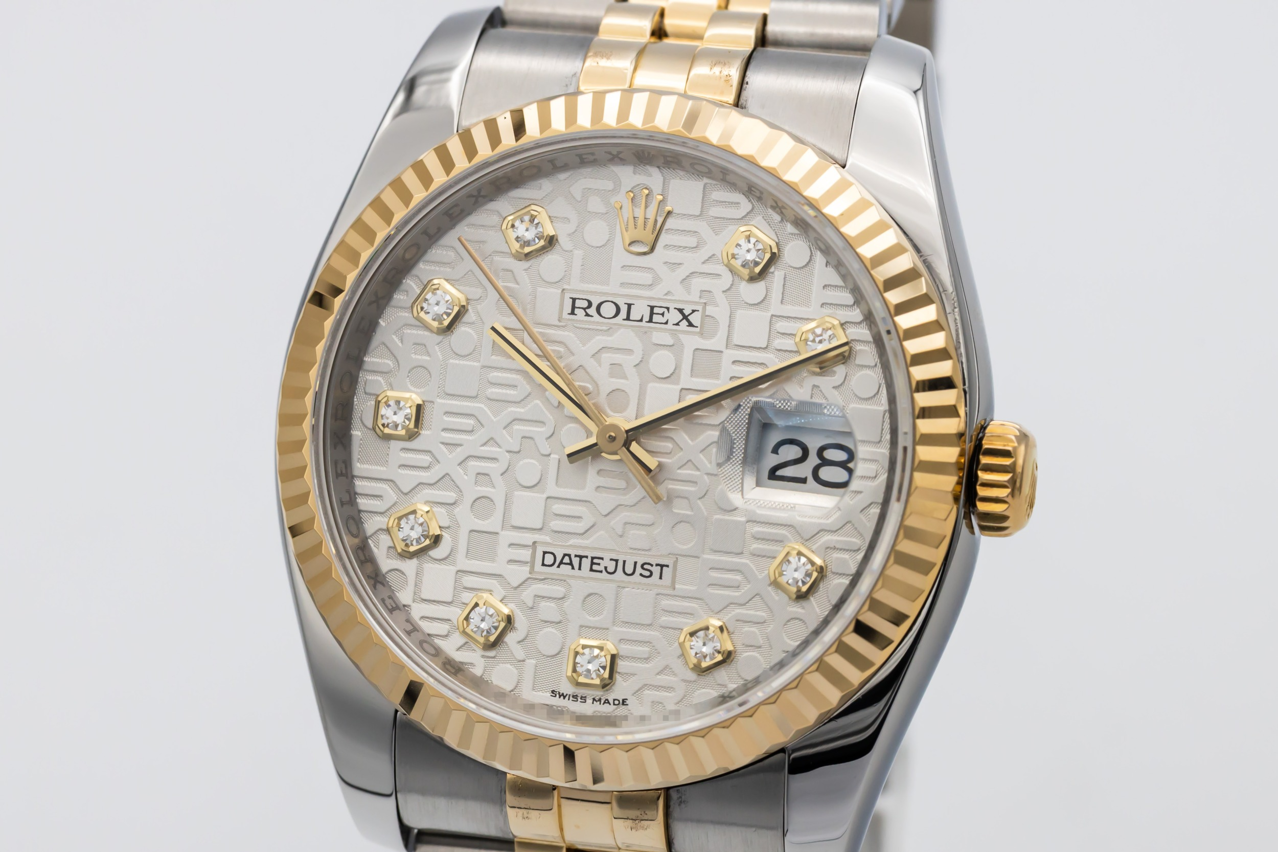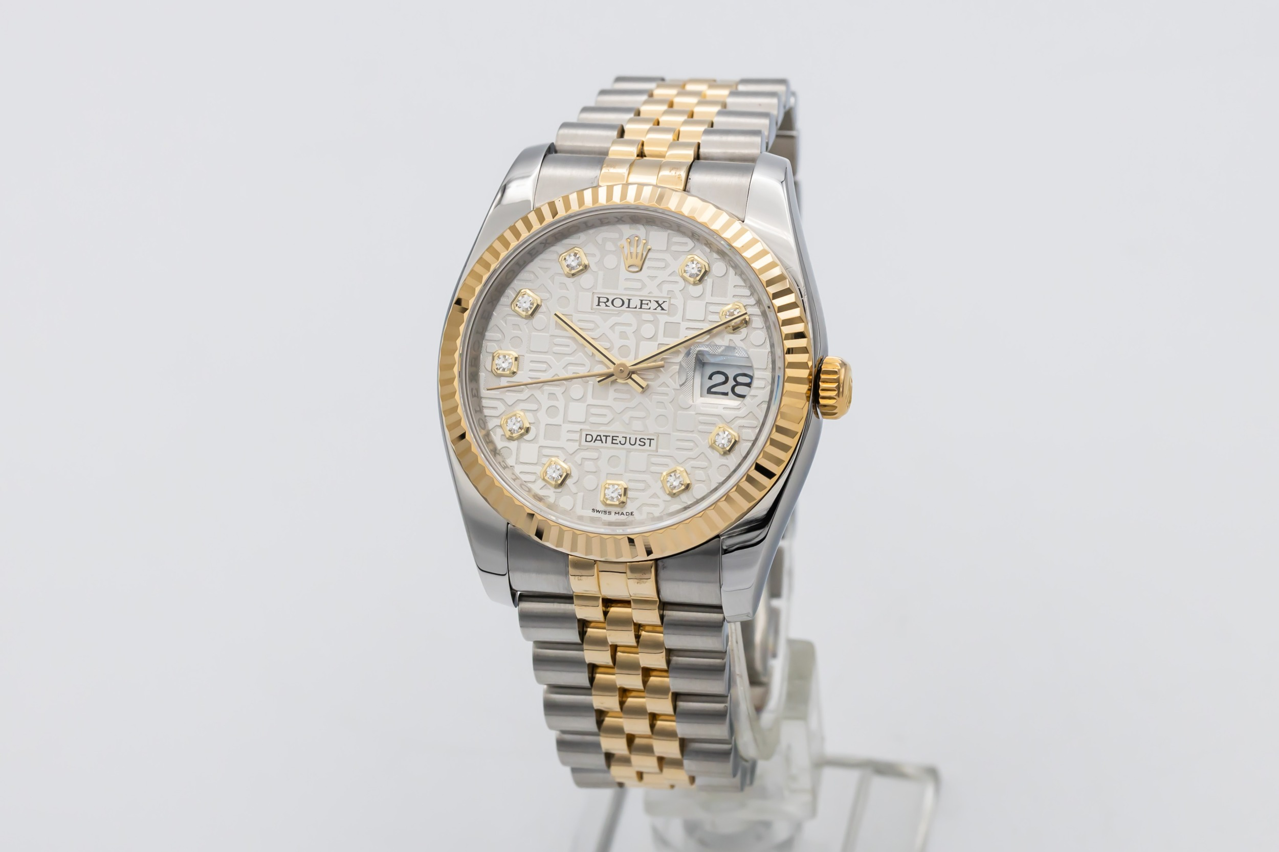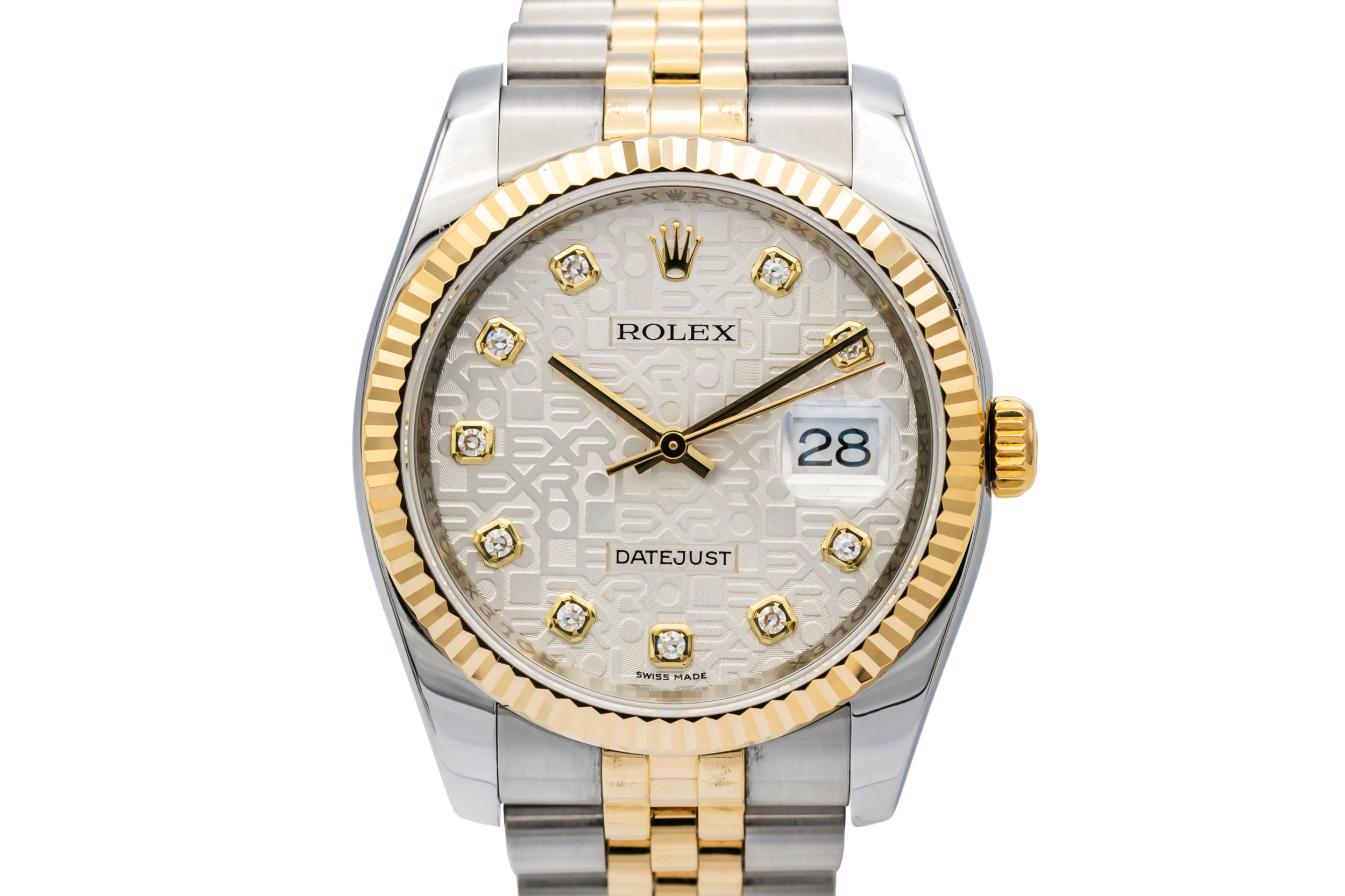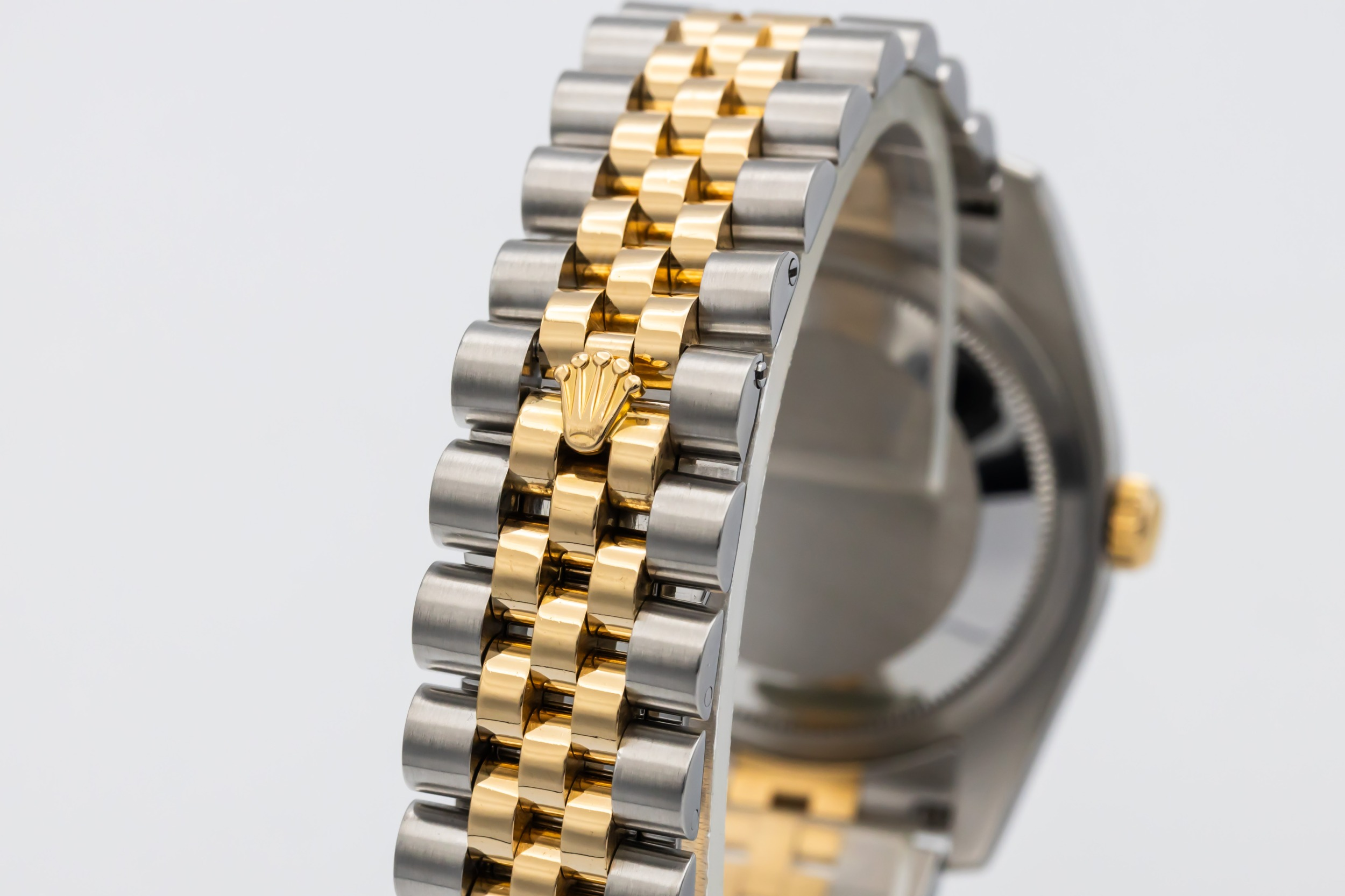 This 2008 Rolex DateJust 36mm is a timeless luxury timepiece crafted in stainless steel and 18ct yellow gold. The computerised silver dial is paired with baton hour markers and the signature date window at 3 o’clock for excellent legibility, framed by a fluted yellow gold bezel. Finished on the iconic steel and yellow gold Jubilee bracelet.