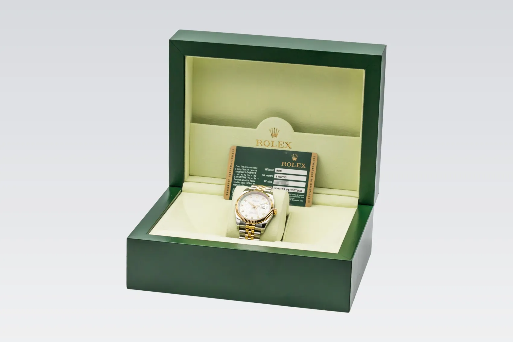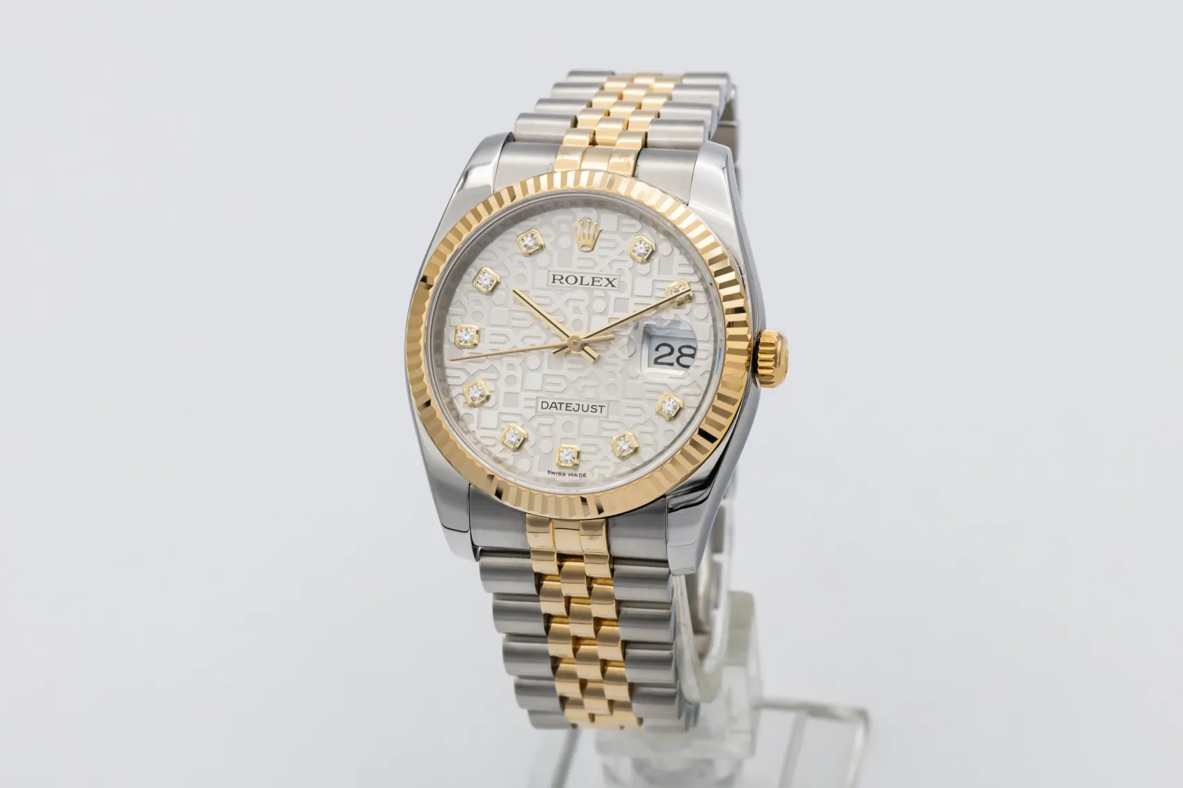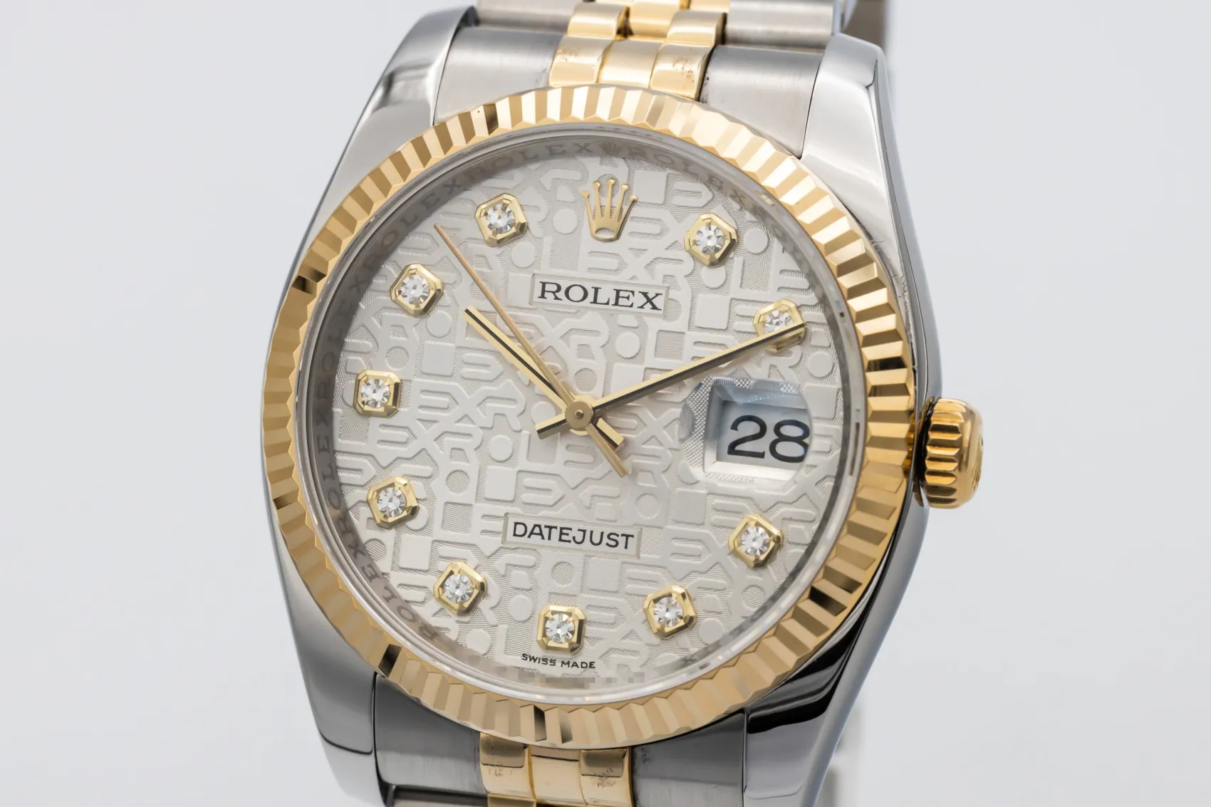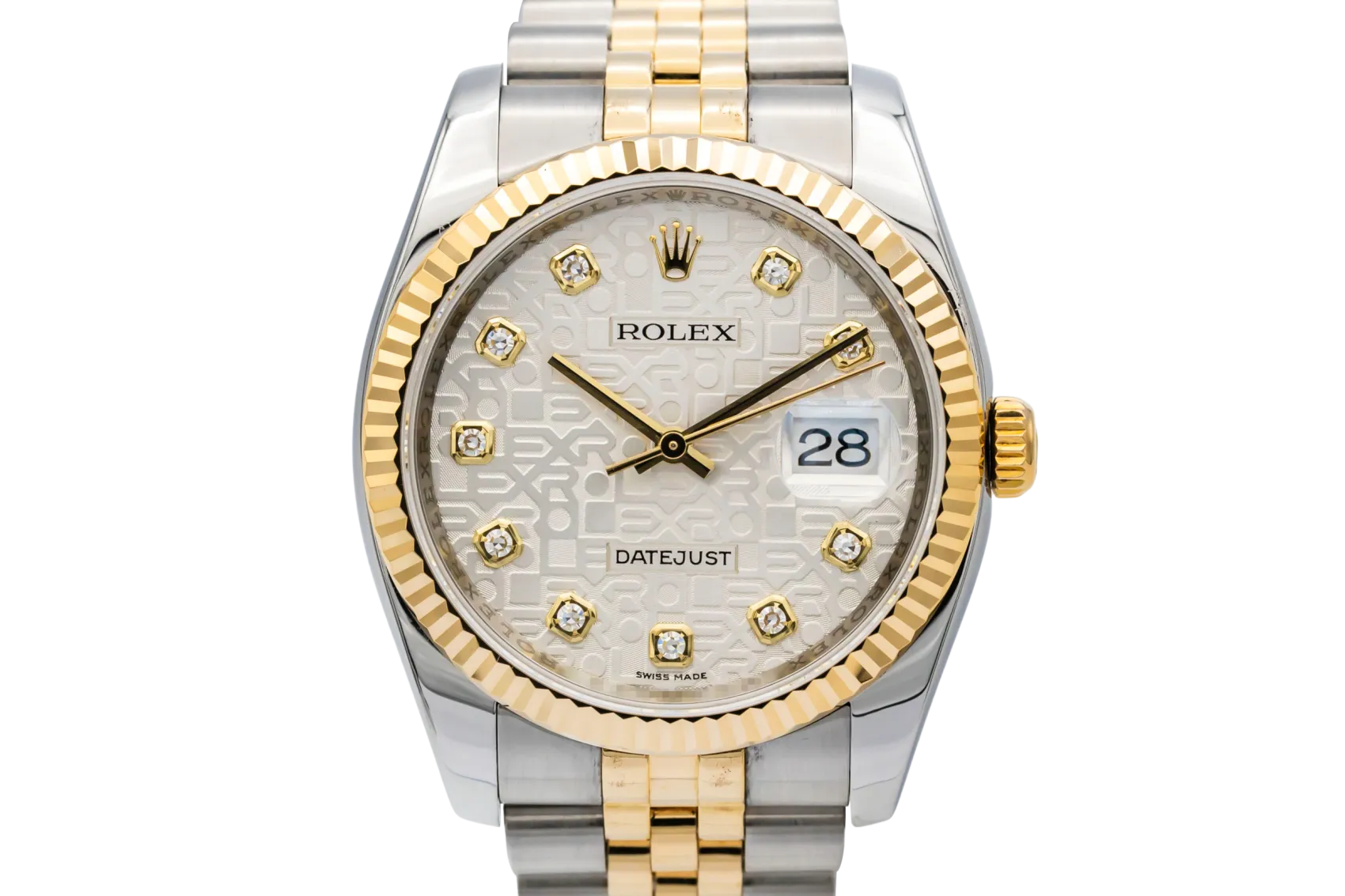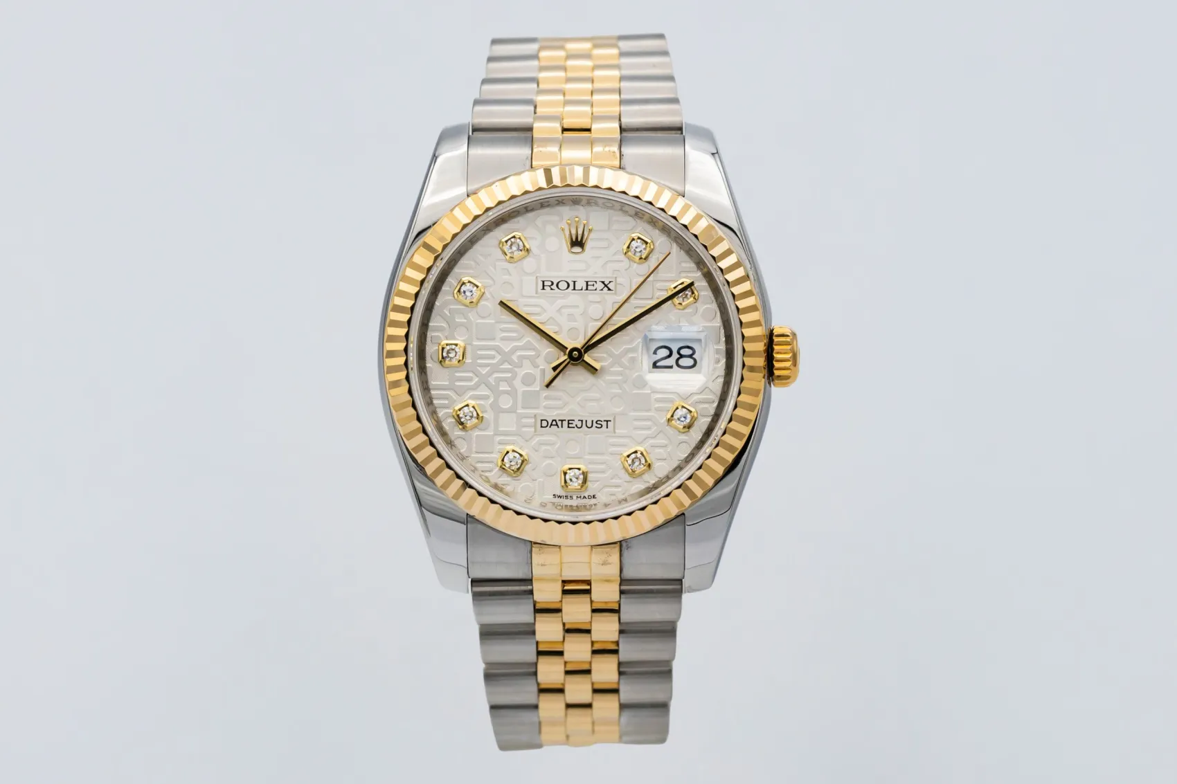 finance this from £186.9 p/m call the shop Read about our Limited Lifetime WarrantyThis 2008 Rolex DateJust 36mm is a timeless luxury timepiece crafted in stainless steel and 18ct yellow gold. The computerised silver dial is paired with baton hour markers and the signature date window at 3 o’clock for excellent legibility, framed by a fluted yellow gold bezel. Finished on the iconic steel and yellow gold Jubilee bracelet.