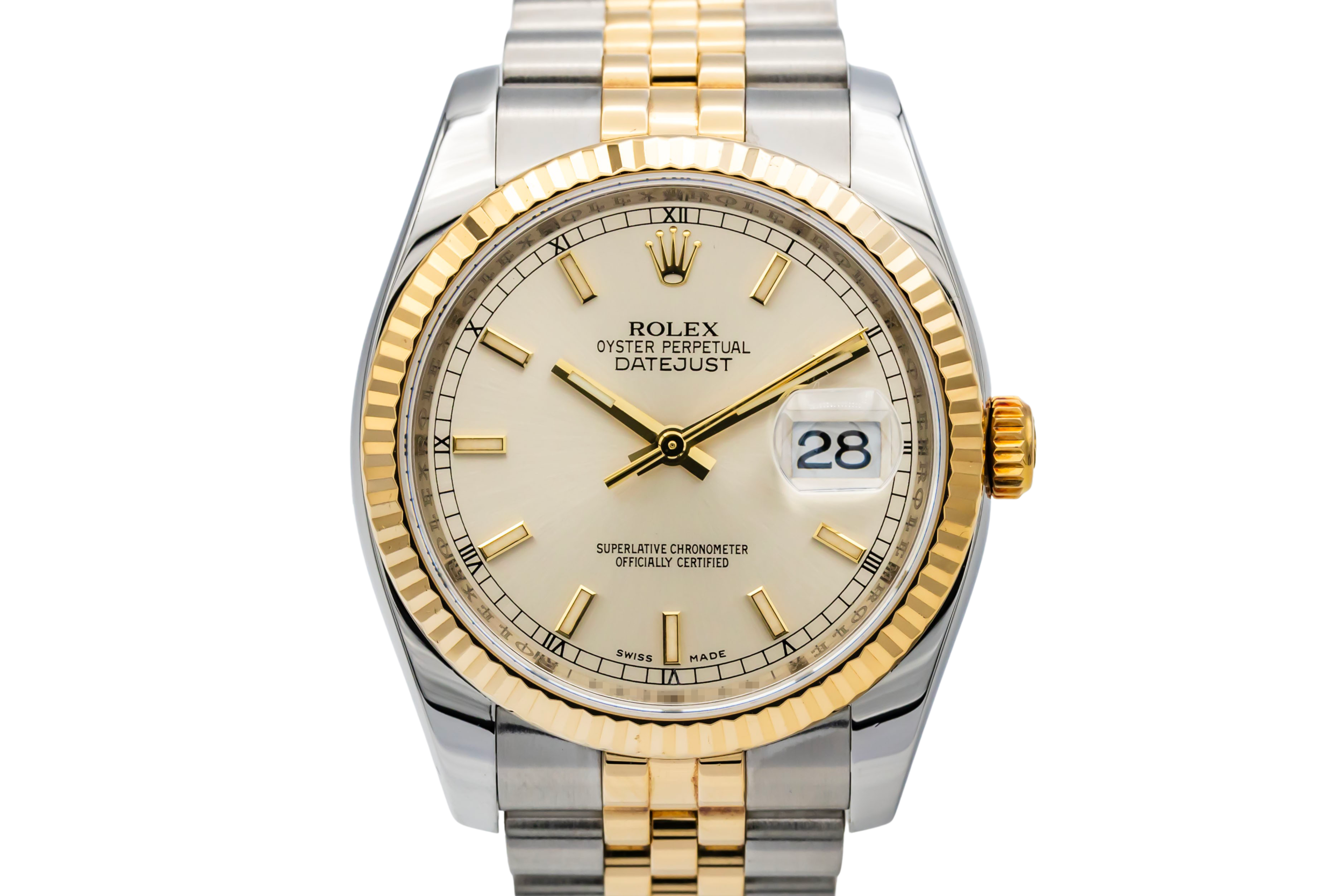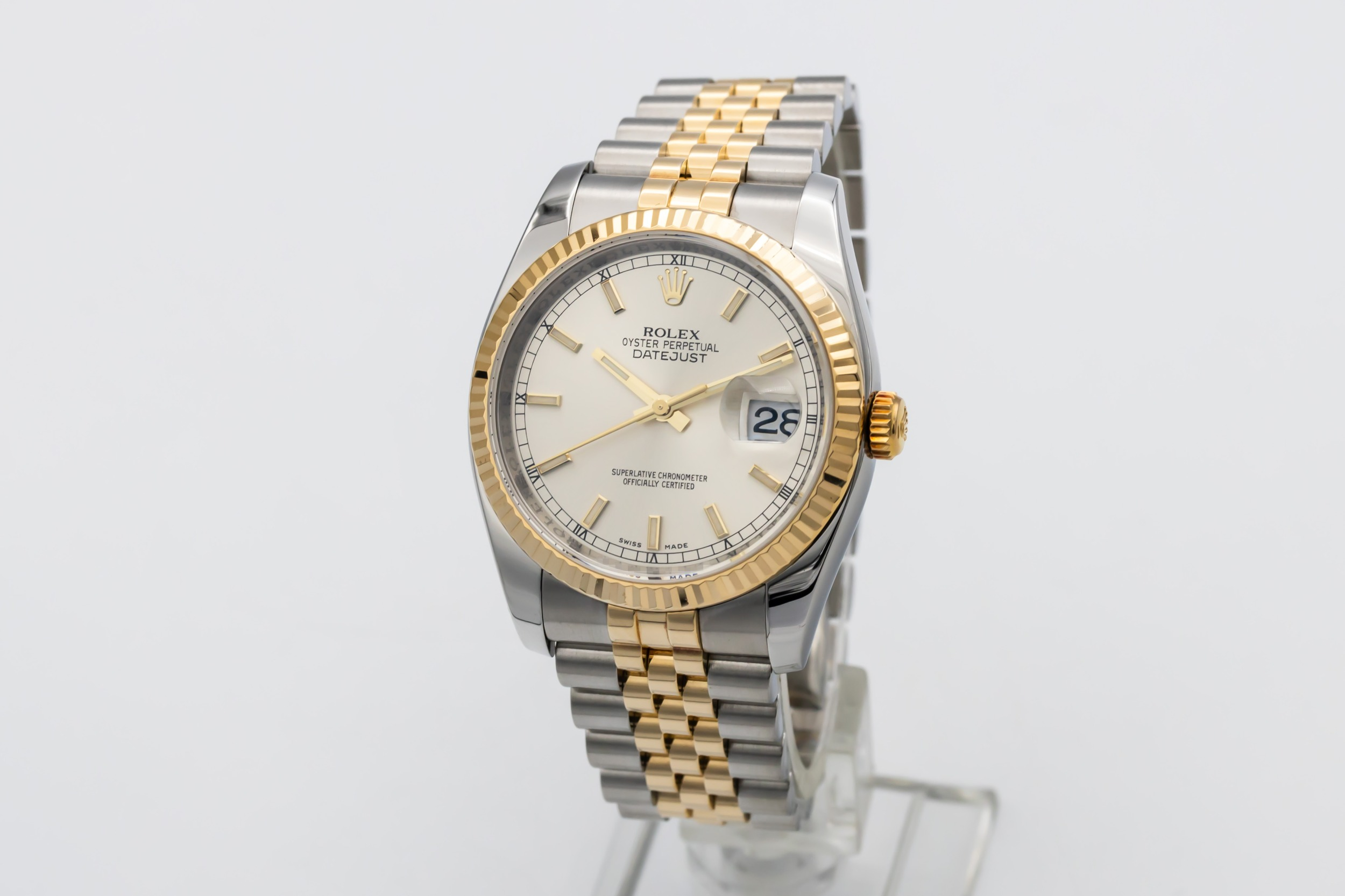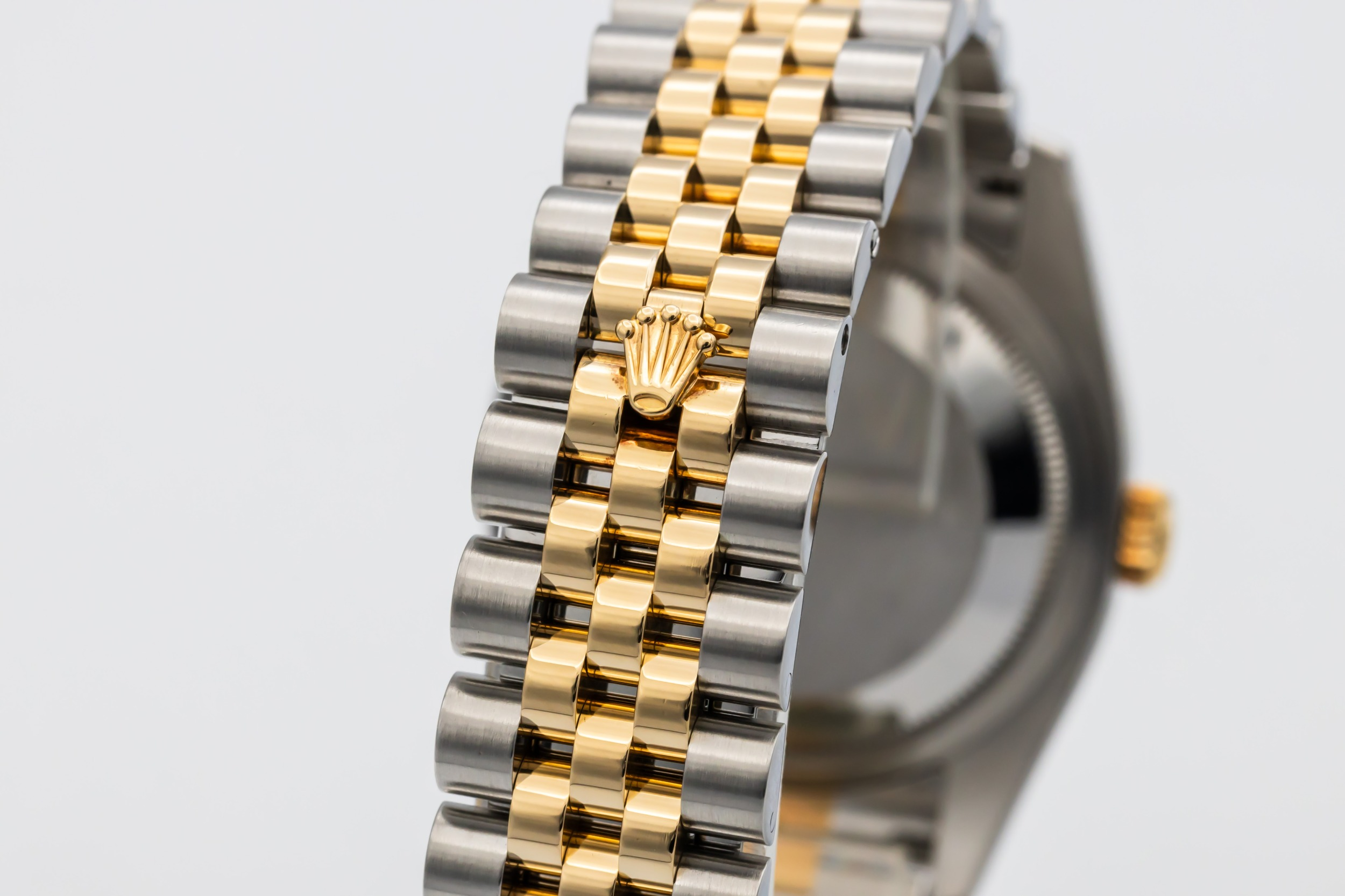 This 2008 Rolex DateJust 36mm is a timeless luxury timepiece crafted in stainless steel and 18ct yellow gold. The elegant silver dial is paired with baton hour markers and the signature date window at 3 o’clock for excellent legibility, framed by a fluted yellow gold bezel. Finished on the iconic steel and yellow gold Jubilee bracelet.