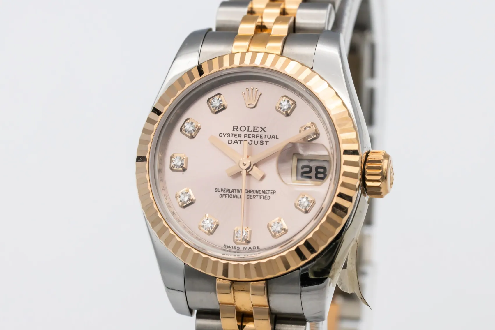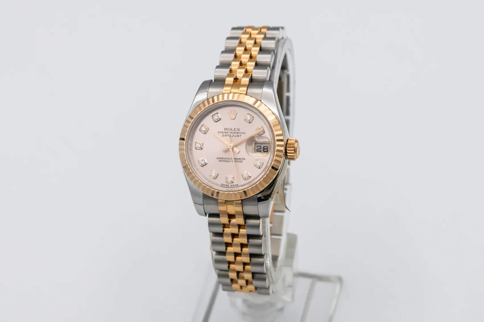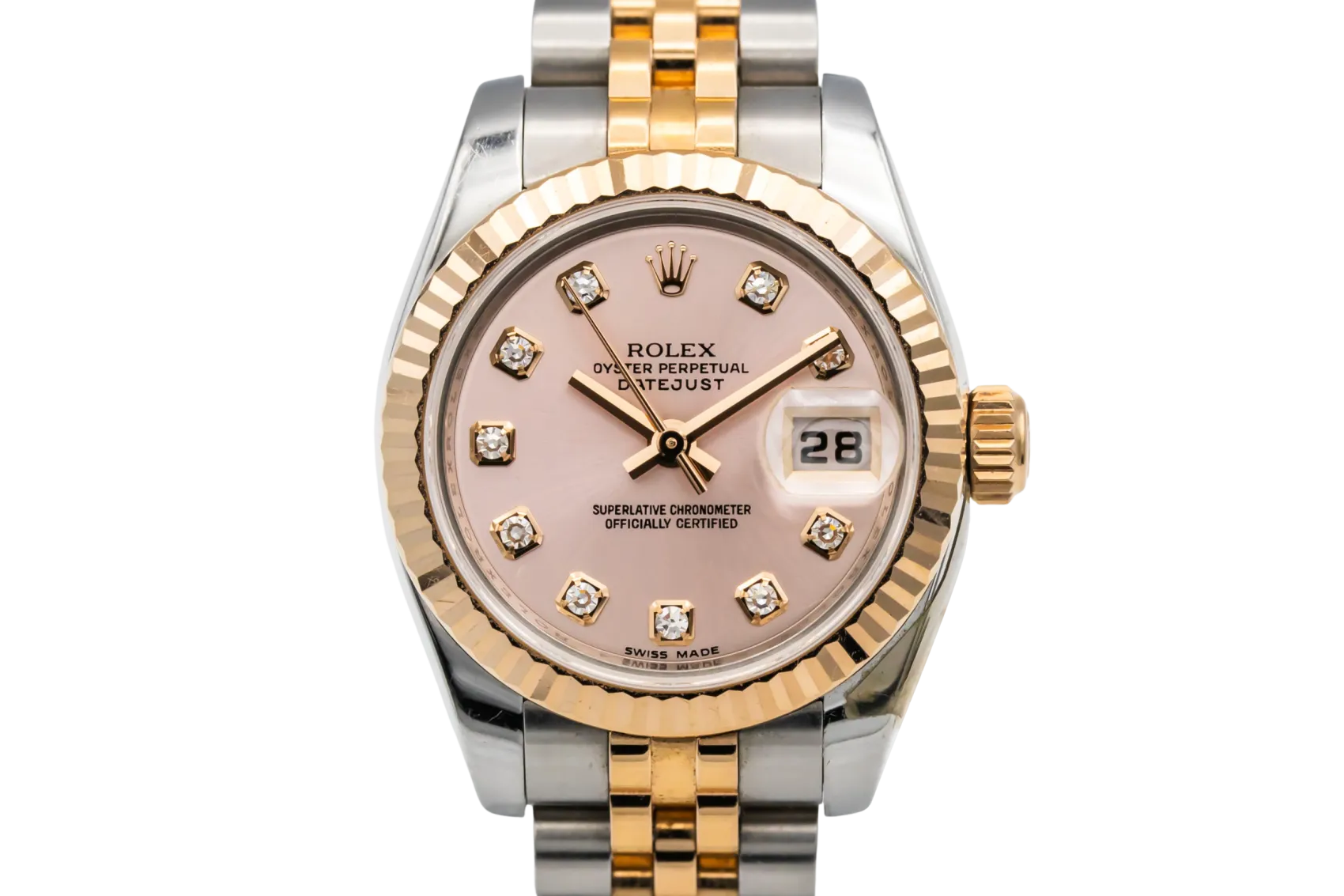 finance this from £125.04 p/m call the shop Read about our Limited Lifetime WarrantyThis 2008 Rolex DateJust 26mm is an elegant luxury timepiece crafted in stainless steel and 18ct rose gold. The pink dial is complemented by factory diamond markers and the signature date window at 3 o’clock, delivering classic Rolex style with excellent legibility. Finished with a fluted Everose gold bezel and the iconic steel and rose gold Jubilee bracelet.