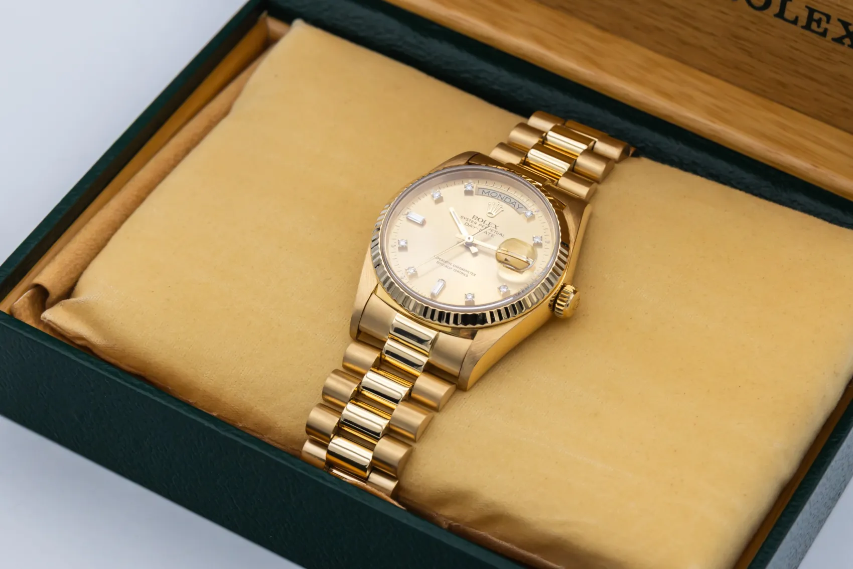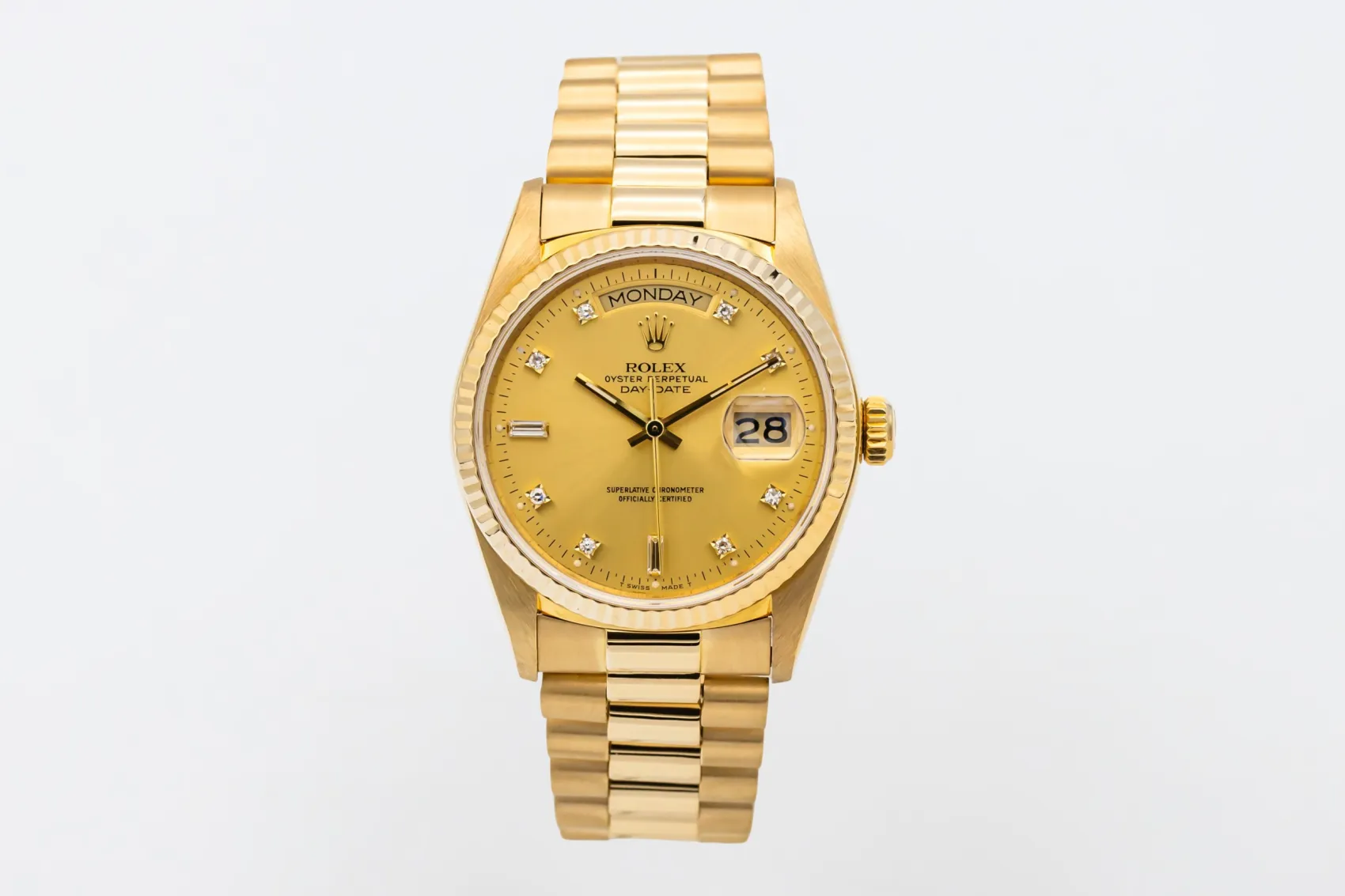 finance this from £311.57 p/m call the shop Read about our Limited Lifetime WarrantyThis 1988 Rolex Day-Date 36mm is an iconic luxury timepiece crafted in solid 18ct yellow gold. The classic champagne dial is complemented by diamond hour markers, the signature day display at 12 o’clock, and the date window at 3 o’clock for excellent legibility. Finished with a fluted yellow gold bezel and the prestigious 18ct yellow gold President bracelet.