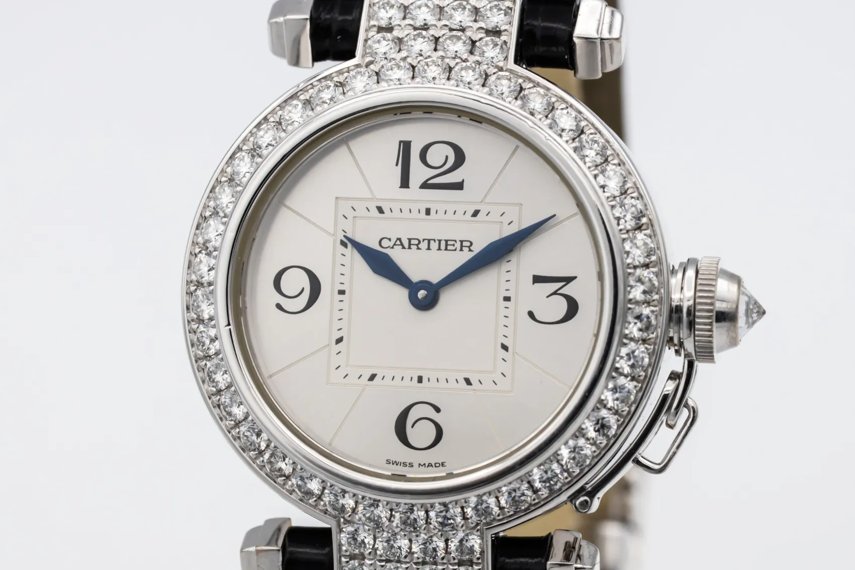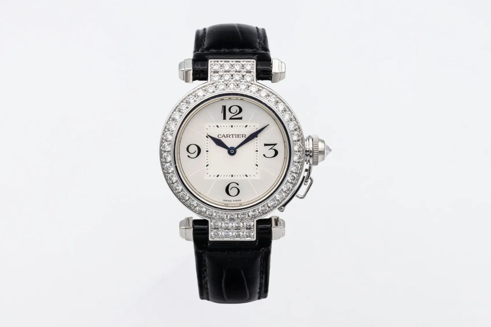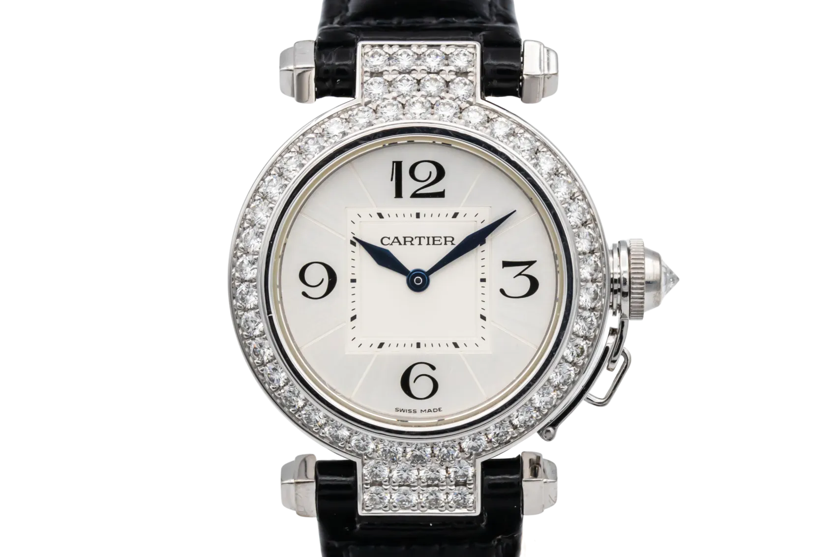 finance this from £132.86 p/m call the shop Read about our Limited Lifetime WarrantyThis circa 2015 Cartier Pasha is an elegant jewellery timepiece crafted in precious white metal and finished with a factory diamond-set bezel and diamond-set lugs. The silver dial features classic Arabic numerals at 12, 3, 6, and 9, complemented by blued steel hands for clear legibility. Fitted with the signature screw-down crown cap secured by a chain and paired with a black leather strap.