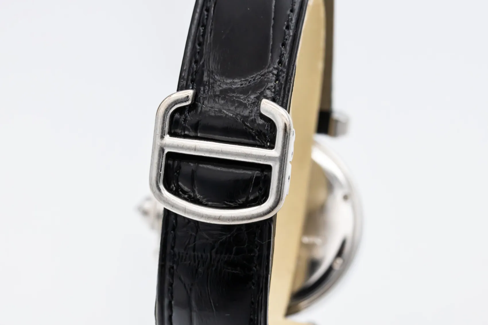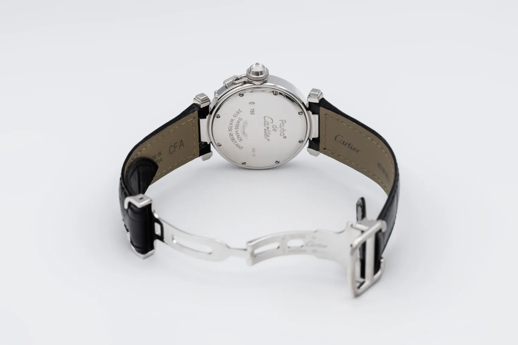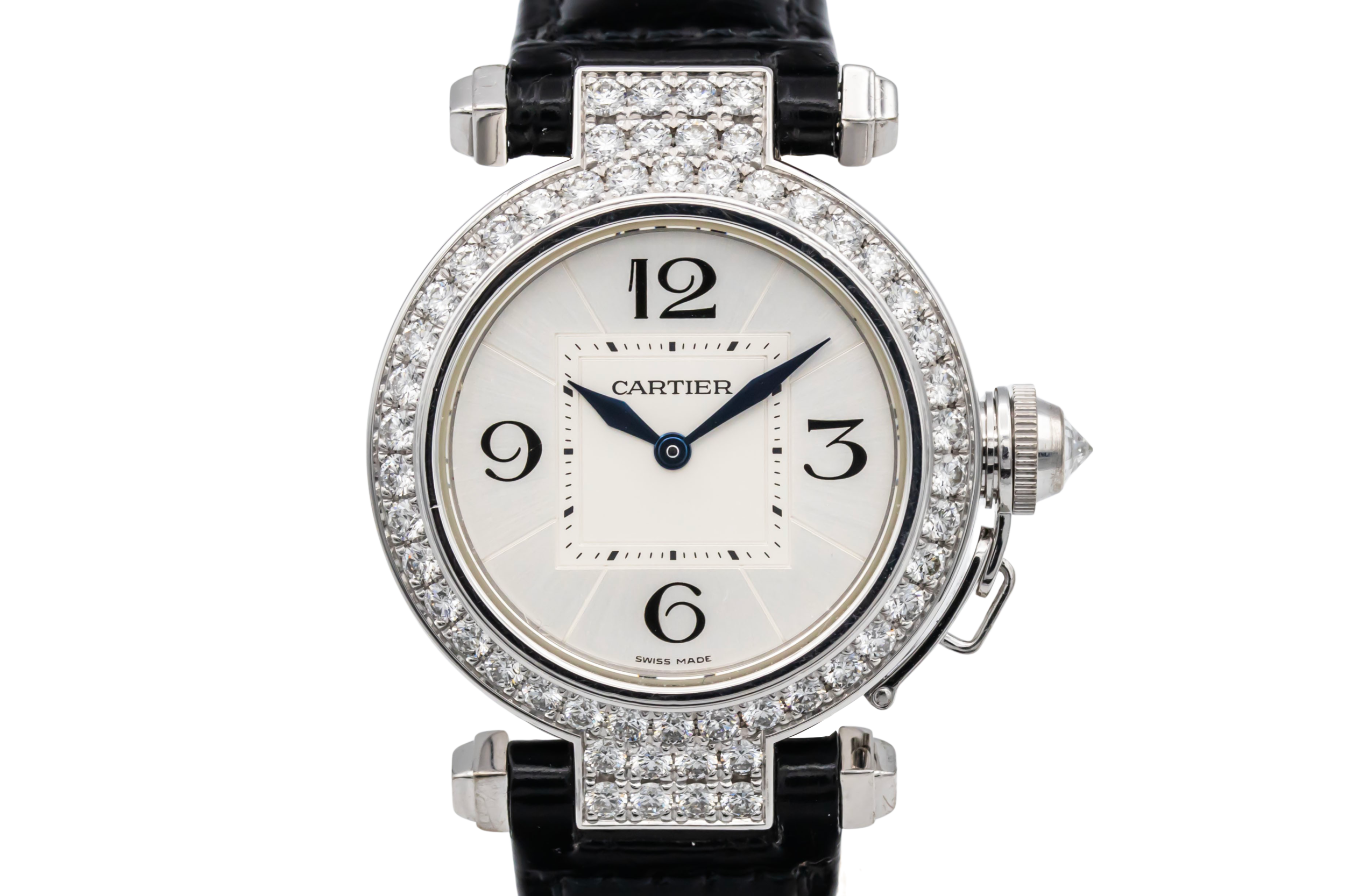 finance this from £132.86 p/m call the shop Read about our Limited Lifetime WarrantyThis circa 2015 Cartier Pasha is an elegant jewellery timepiece crafted in precious white metal and finished with a factory diamond-set bezel and diamond-set lugs. The silver dial features classic Arabic numerals at 12, 3, 6, and 9, complemented by blued steel hands for clear legibility. Fitted with the signature screw-down crown cap secured by a chain and paired with a black leather strap.