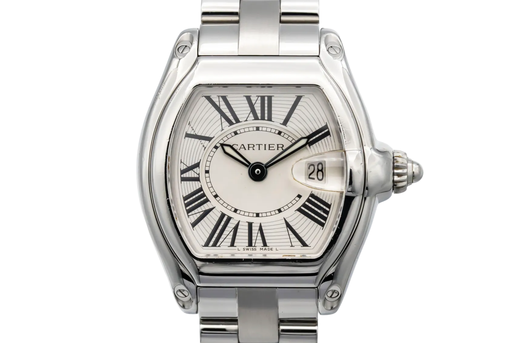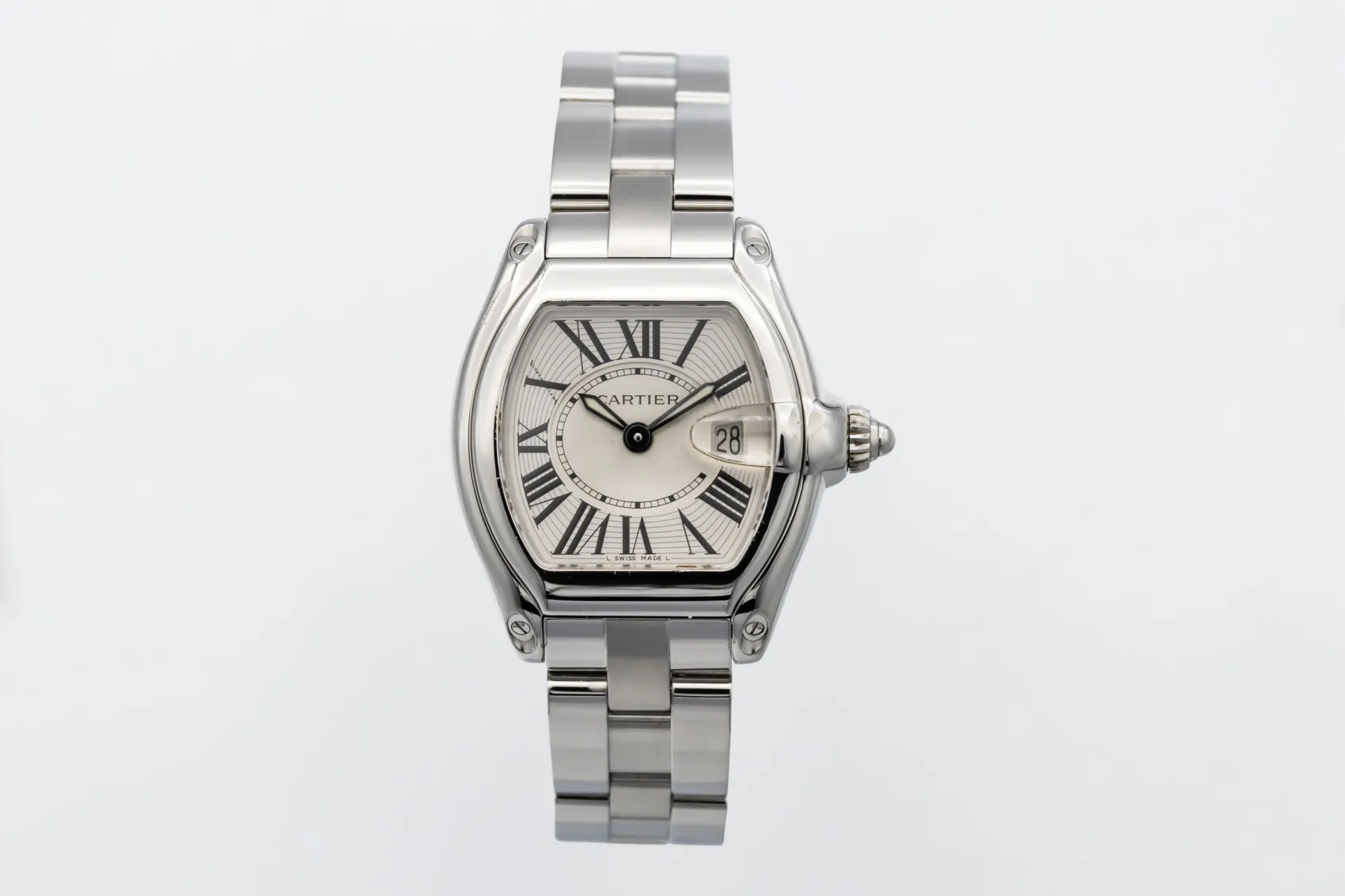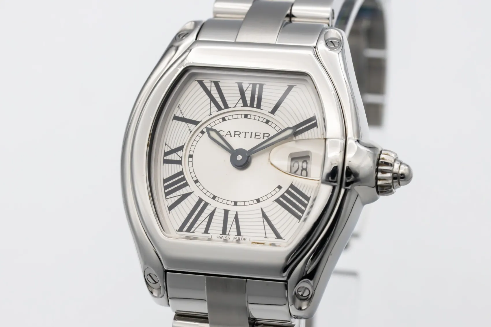 finance this from £66.26 p/m call the shop Read about our Limited Lifetime WarrantyThis circa 2010 Cartier Roadster 33mm is a distinctive luxury timepiece crafted in stainless steel. The tonneau-shaped case frames a silver dial with bold black Roman numeral hour markers and blued steel hands, offering unmistakable Cartier styling with excellent legibility. Finished on a stainless steel Roadster bracelet with concealed clasp.