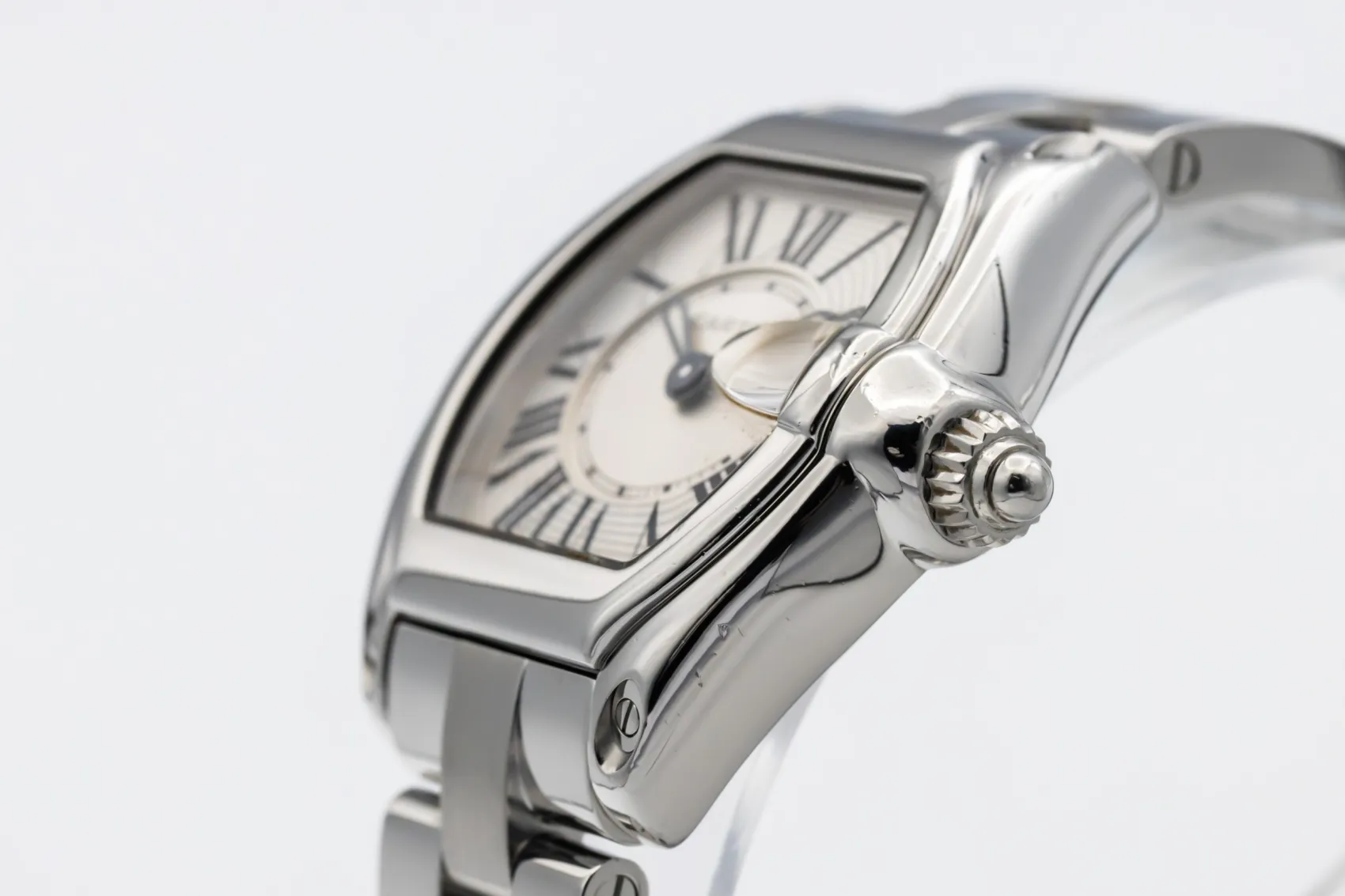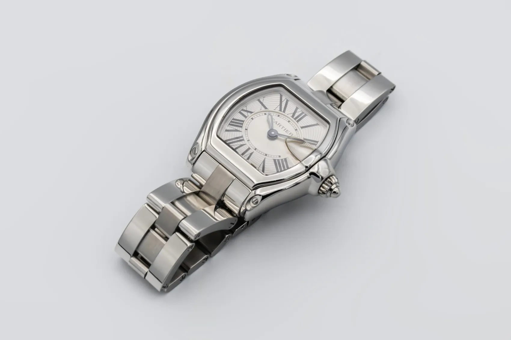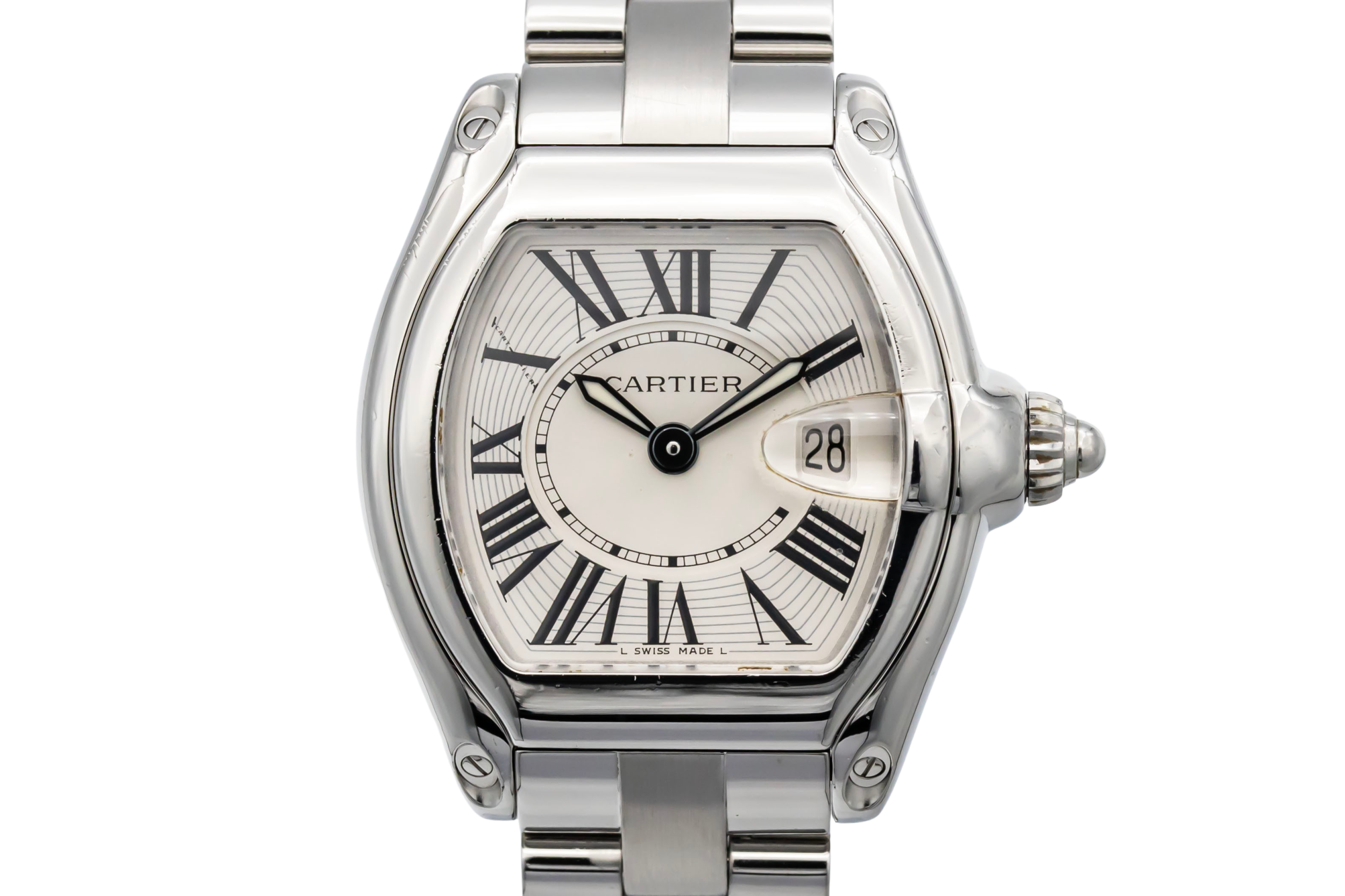 finance this from £66.26 p/m call the shop Read about our Limited Lifetime WarrantyThis circa 2010 Cartier Roadster 33mm is a distinctive luxury timepiece crafted in stainless steel. The tonneau-shaped case frames a silver dial with bold black Roman numeral hour markers and blued steel hands, offering unmistakable Cartier styling with excellent legibility. Finished on a stainless steel Roadster bracelet with concealed clasp.