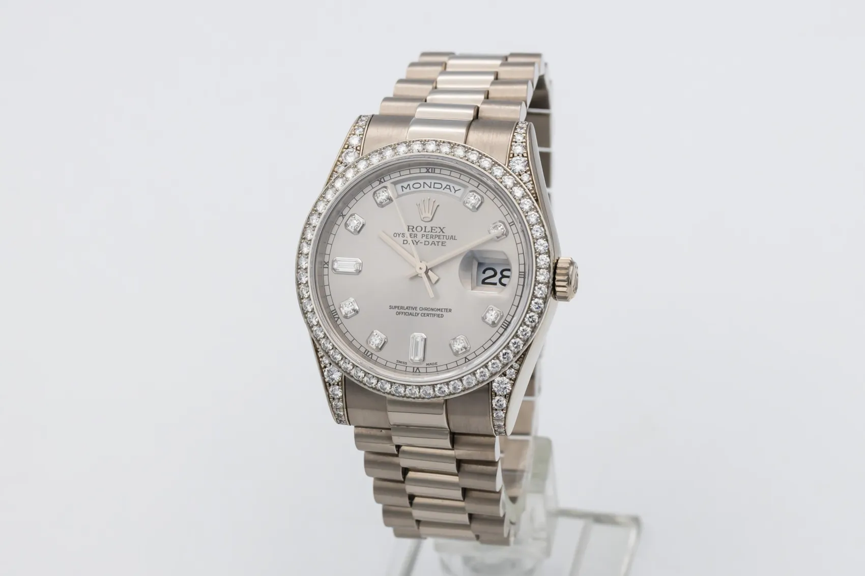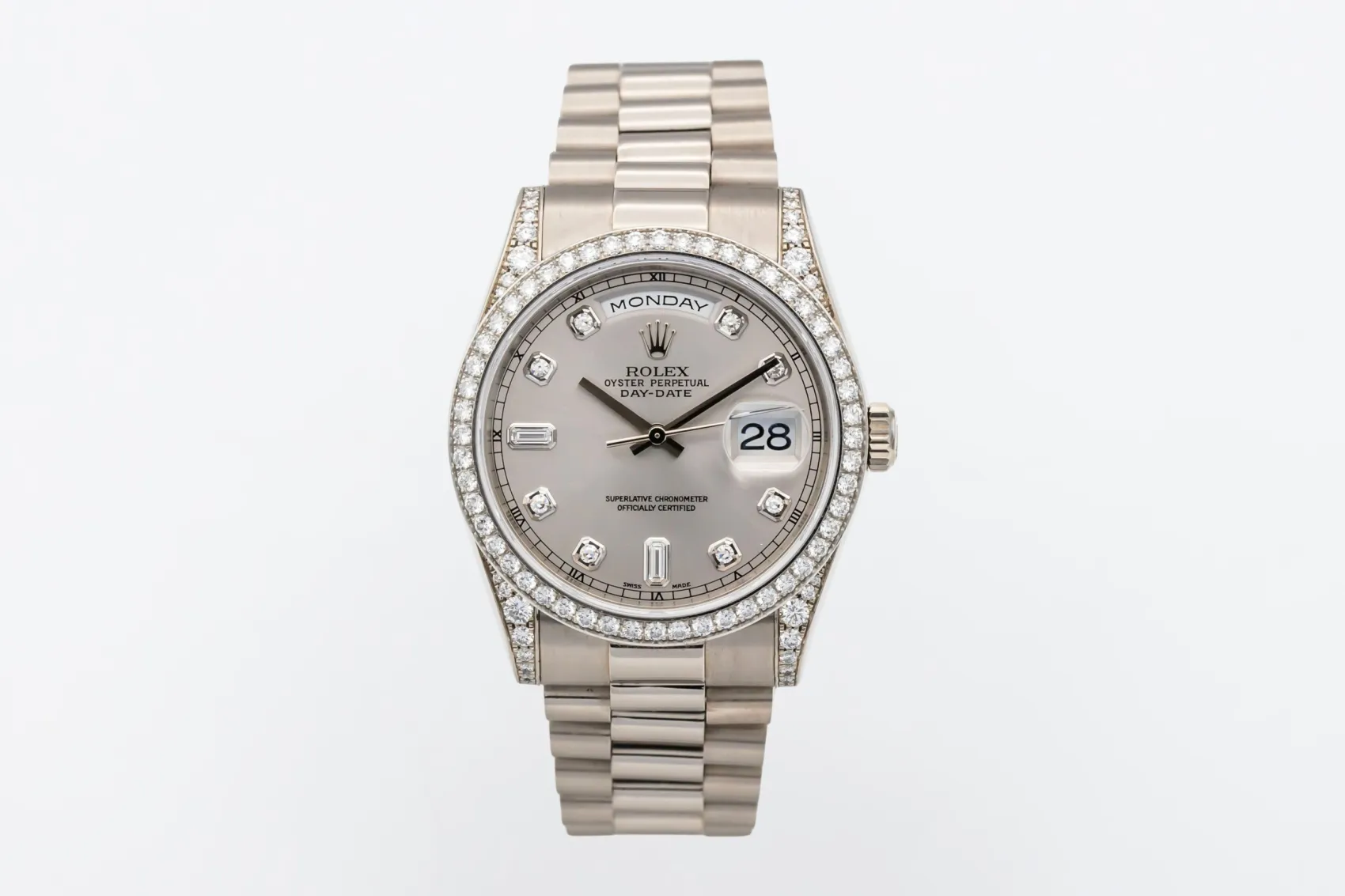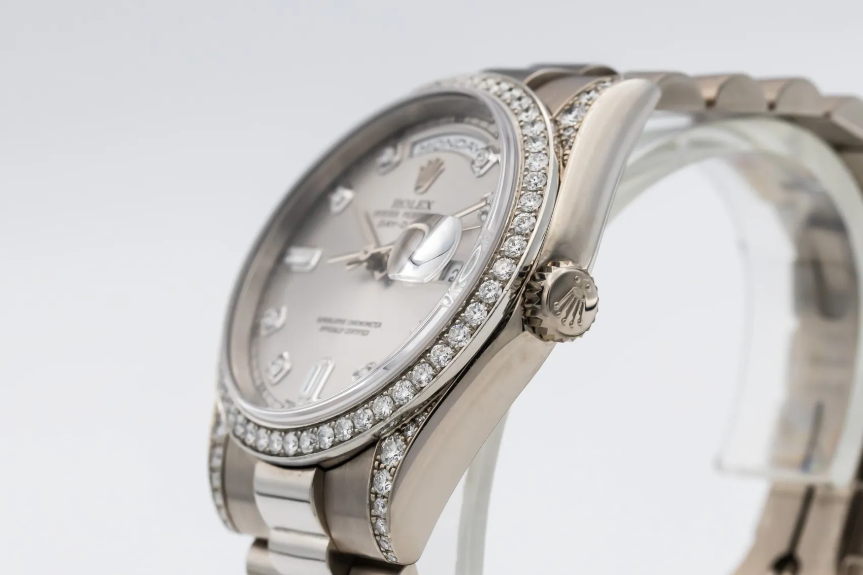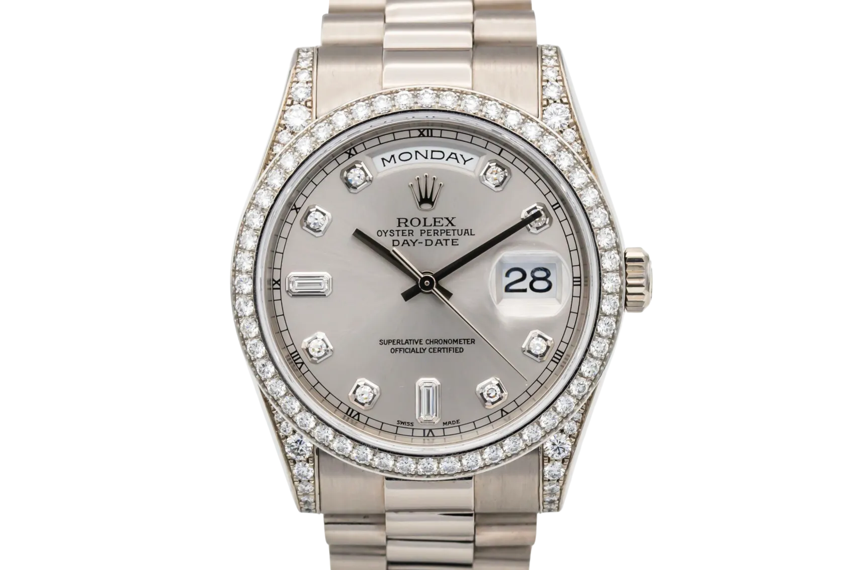 finance this from £388.68 p/m call the shop Read about our Limited Lifetime WarrantyThis 2005 Rolex Day-Date is a luxurious statement timepiece crafted in 18ct white gold. The silver dial is set with factory diamond hour markers, complemented by a diamond-set bezel and diamond-set lugs, creating exceptional brilliance and presence. Finished on the prestigious President bracelet in matching white gold.