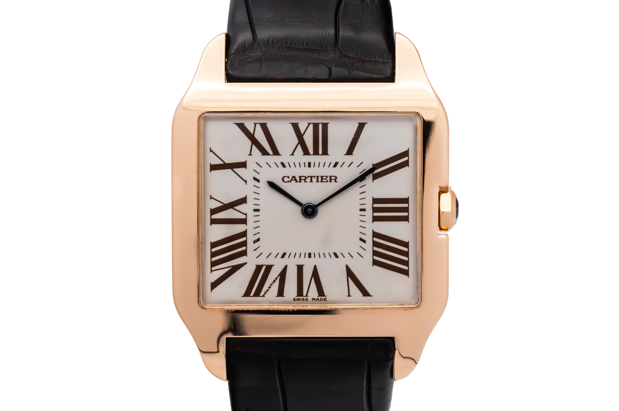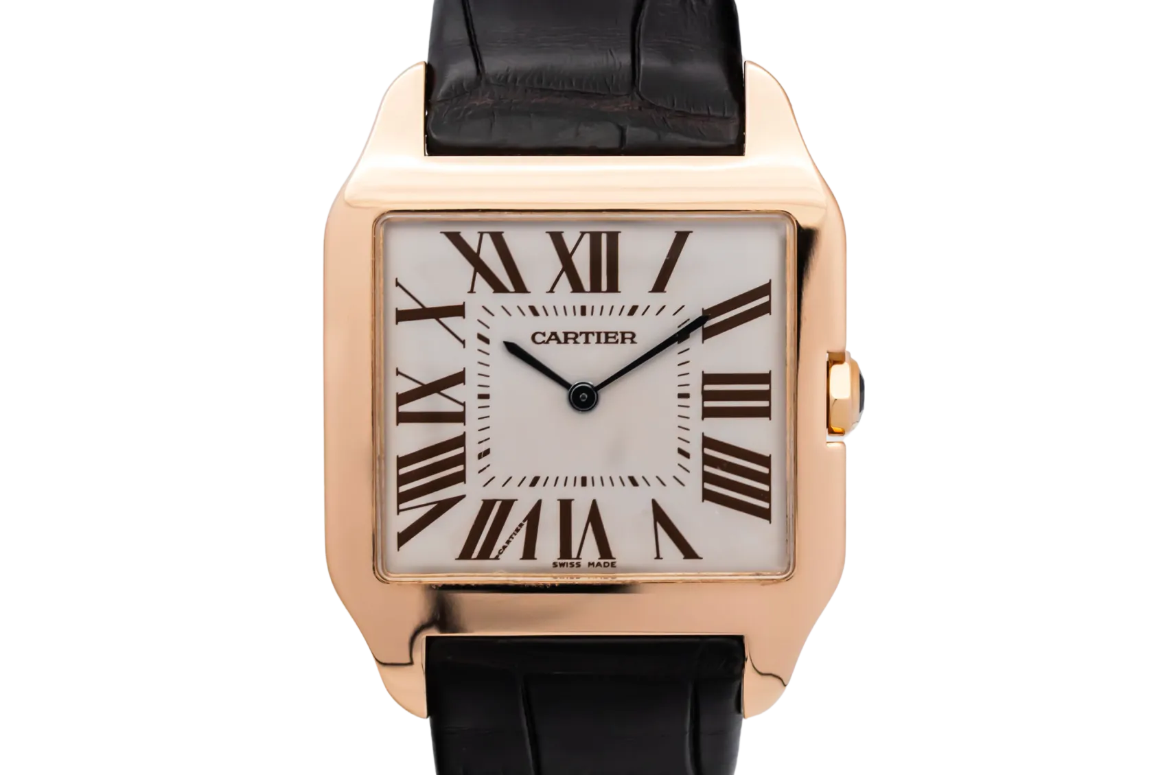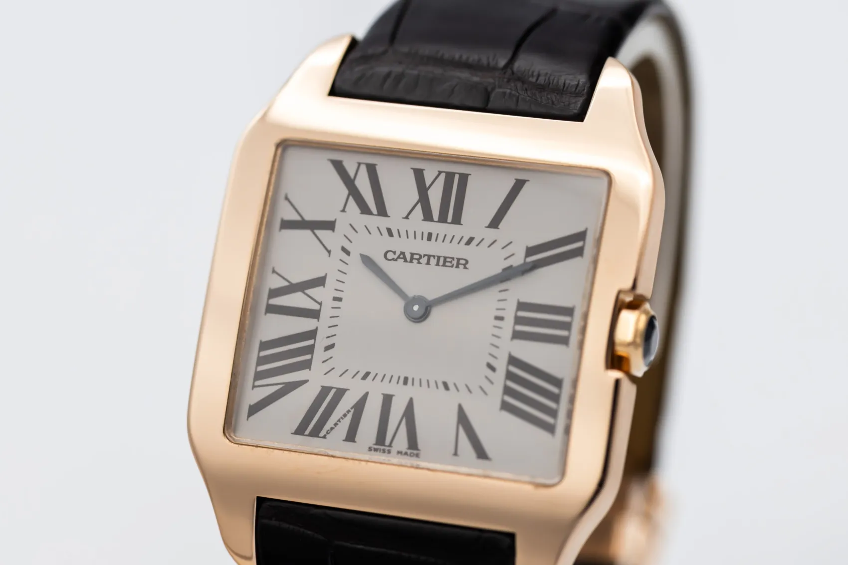 finance this from £160.76 p/m call the shop Read about our Limited Lifetime WarrantyThis circa 2010 Cartier Santos Dumont 35mm is an elegant dress watch crafted in stainless steel. The classic square case frames a silver dial with bold black Roman numeral hour markers, blued steel hands, and a minimalist layout that reflects Cartier’s timeless design language. Finished on a black leather strap with a cabochon-set crown.