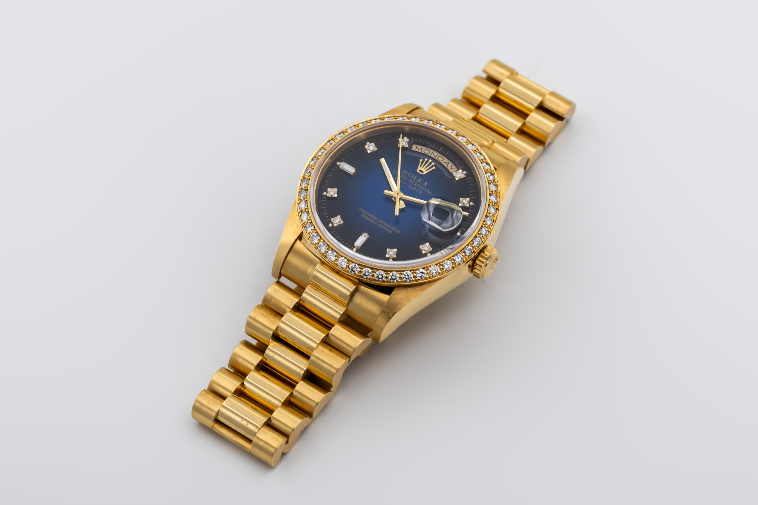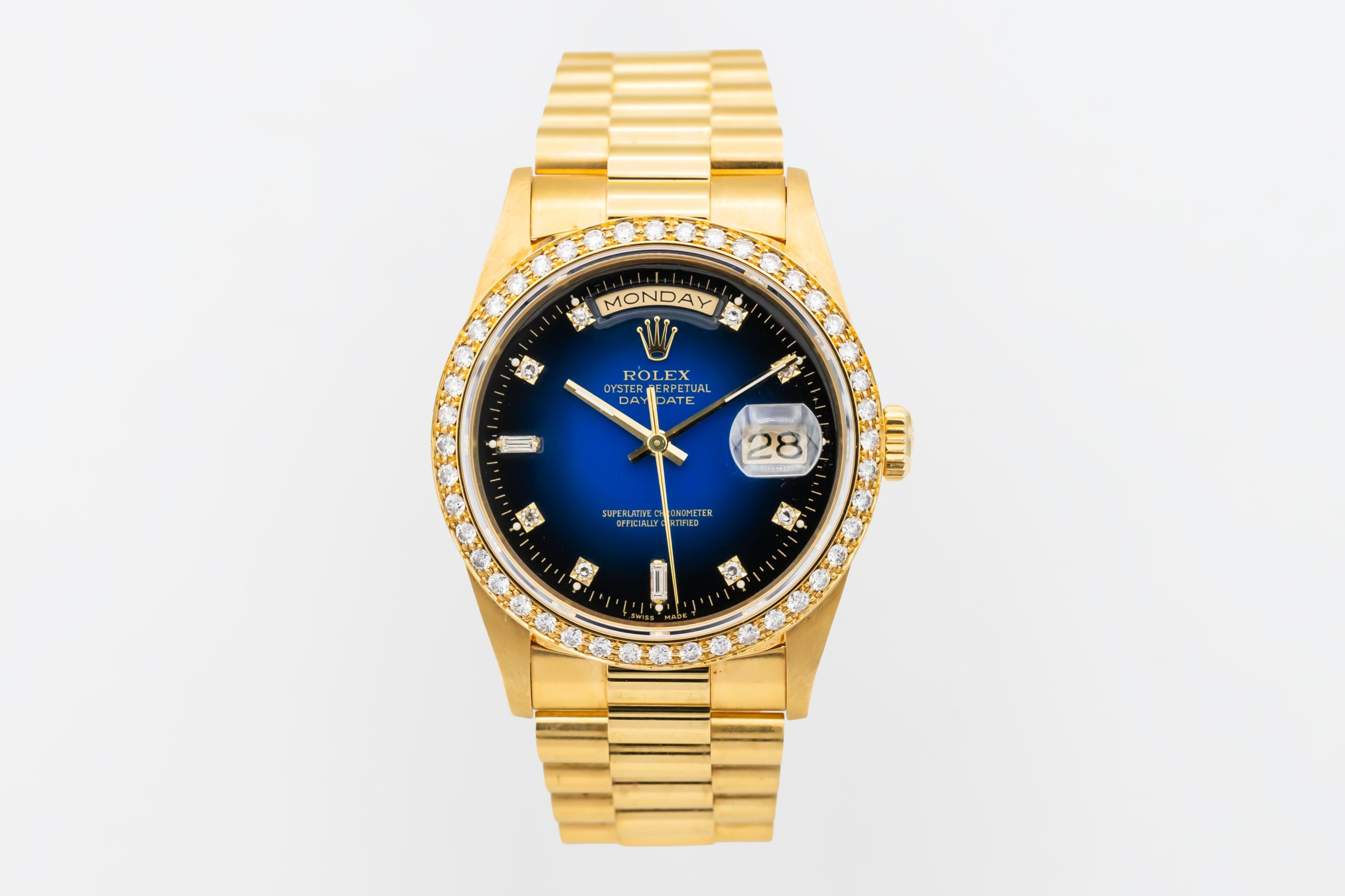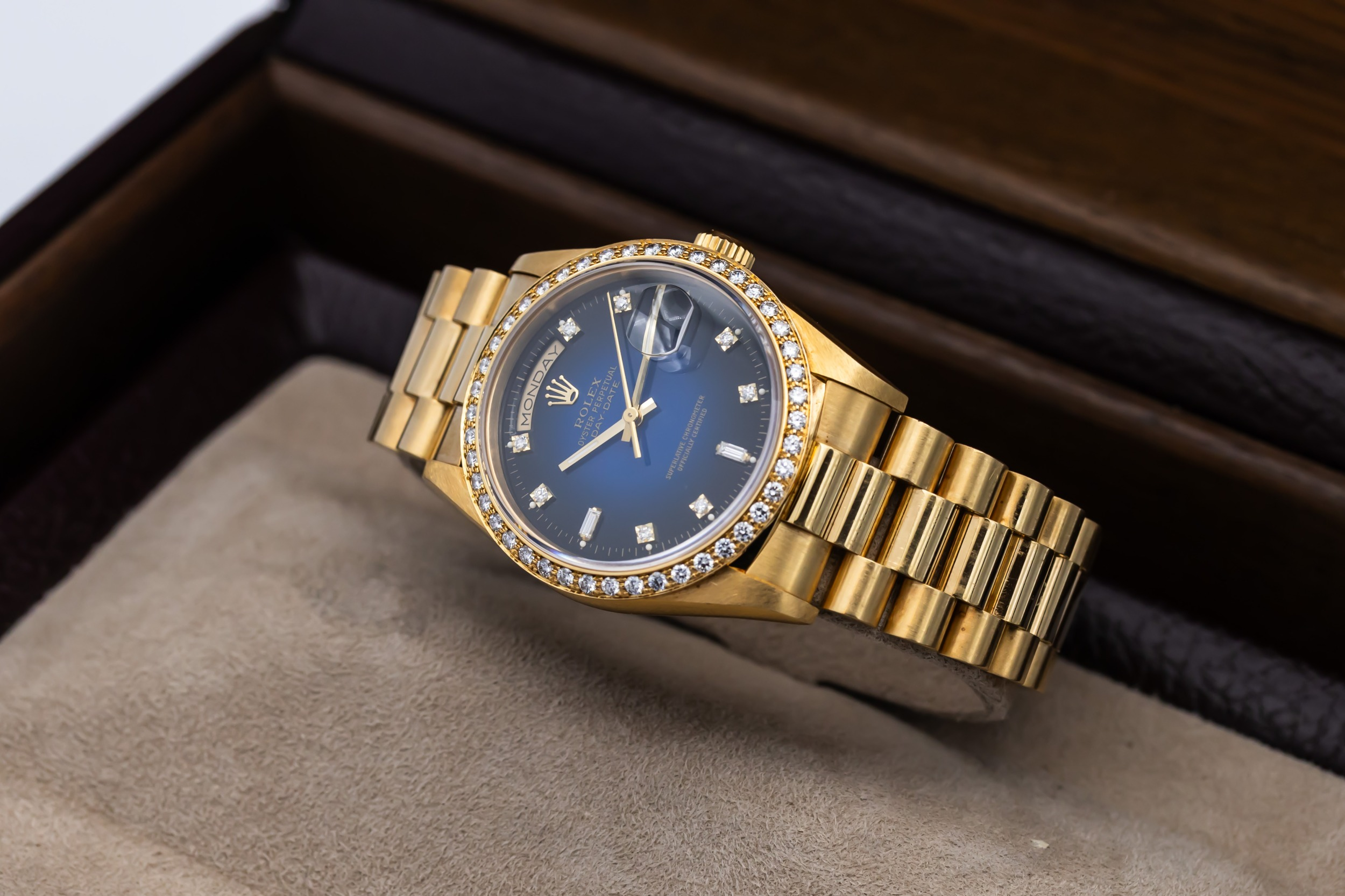 This 1997 Rolex Day-Date 36mm is a prestigious luxury timepiece crafted in solid 18ct yellow gold. The striking blue vignette dial features diamond hour markers, creating depth and contrast while maintaining excellent legibility. Finished with a fluted bezel and the iconic 18ct yellow gold President bracelet.