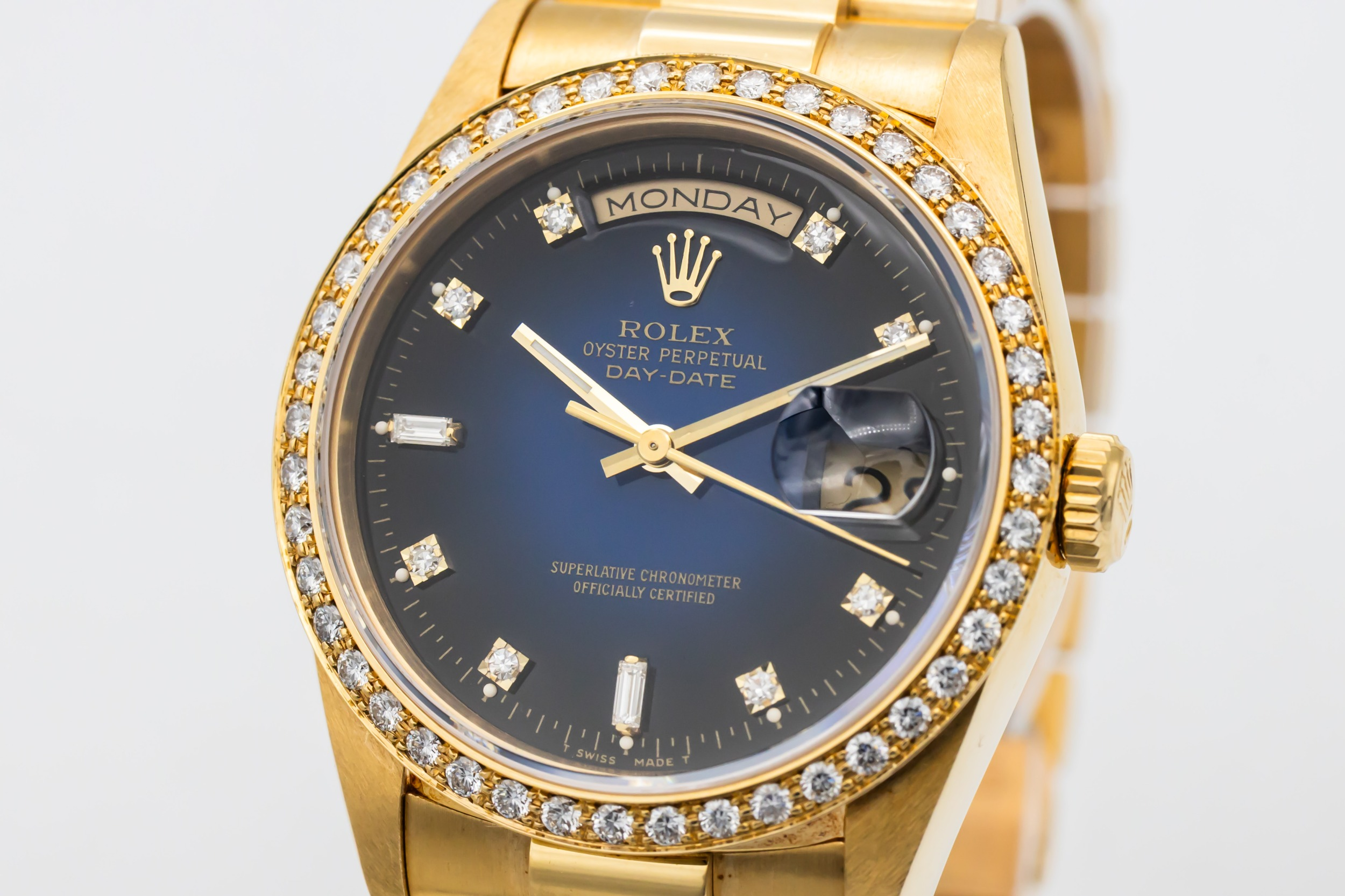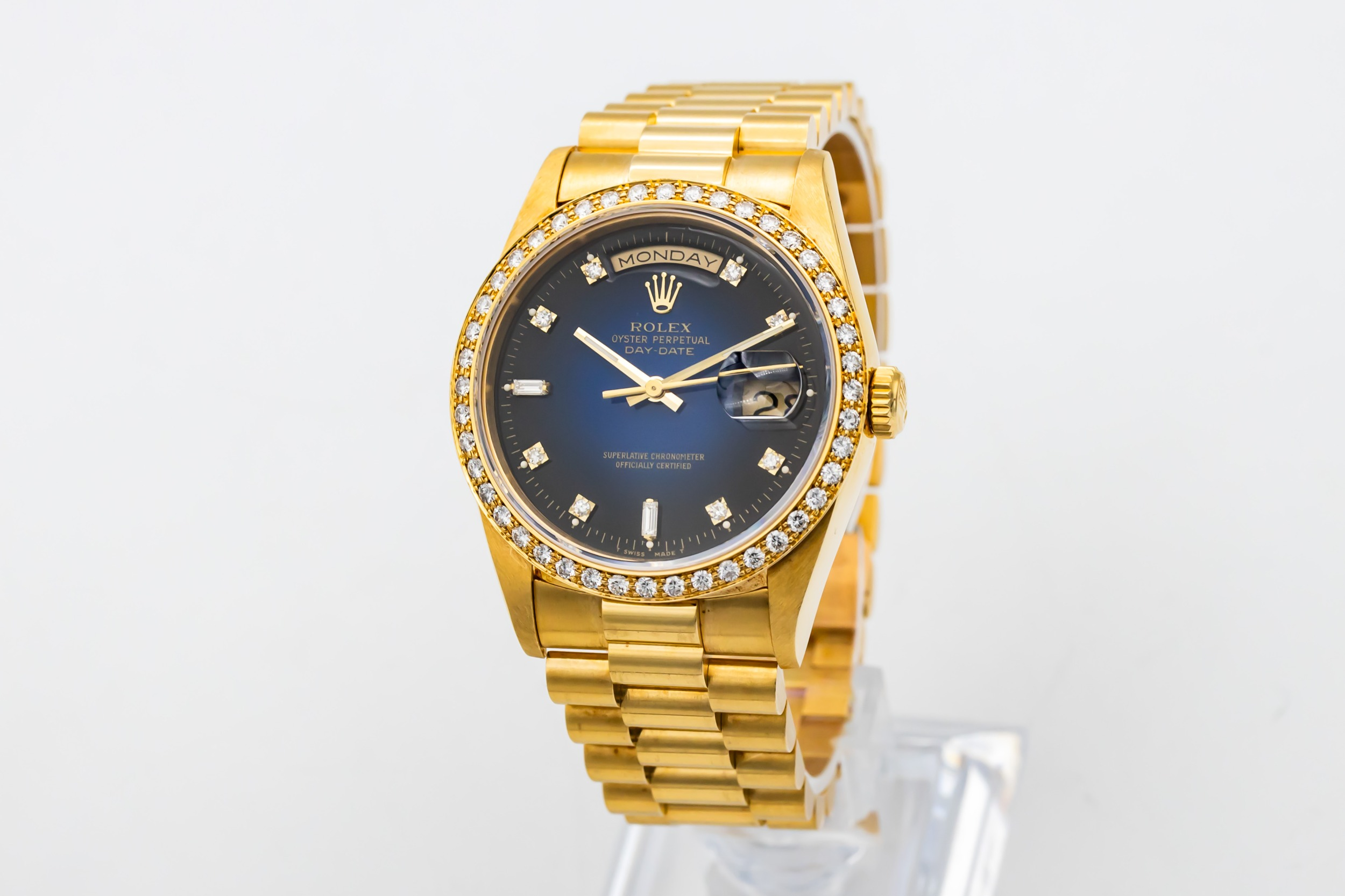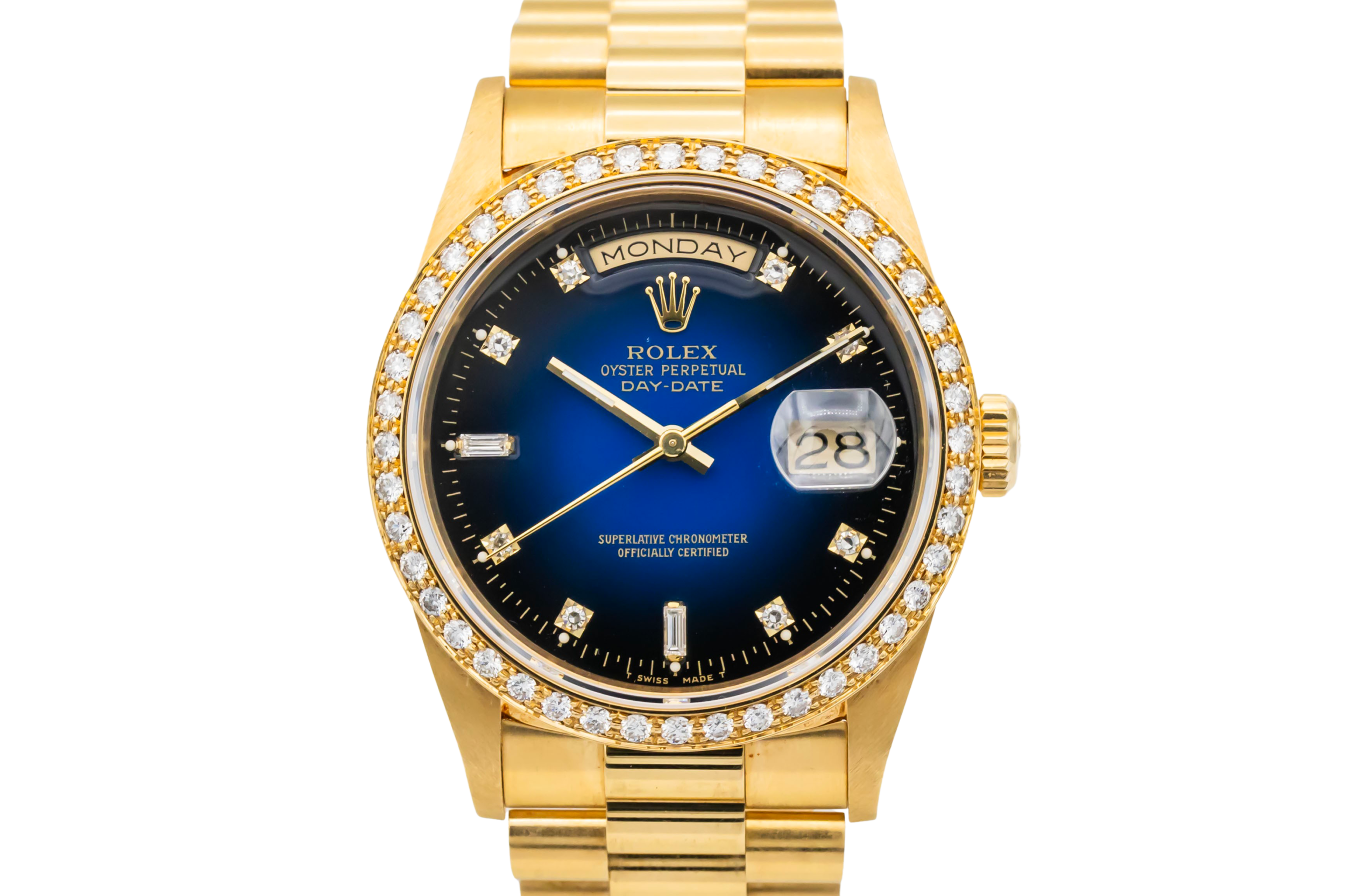 This 1997 Rolex Day-Date 36mm is a prestigious luxury timepiece crafted in solid 18ct yellow gold. The striking blue vignette dial features diamond hour markers, creating depth and contrast while maintaining excellent legibility. Finished with a fluted bezel and the iconic 18ct yellow gold President bracelet.