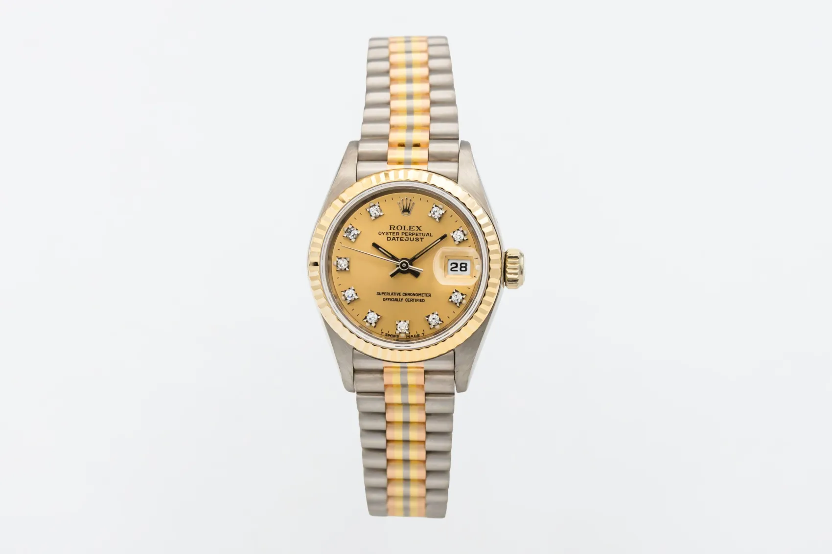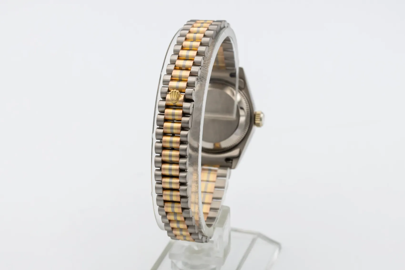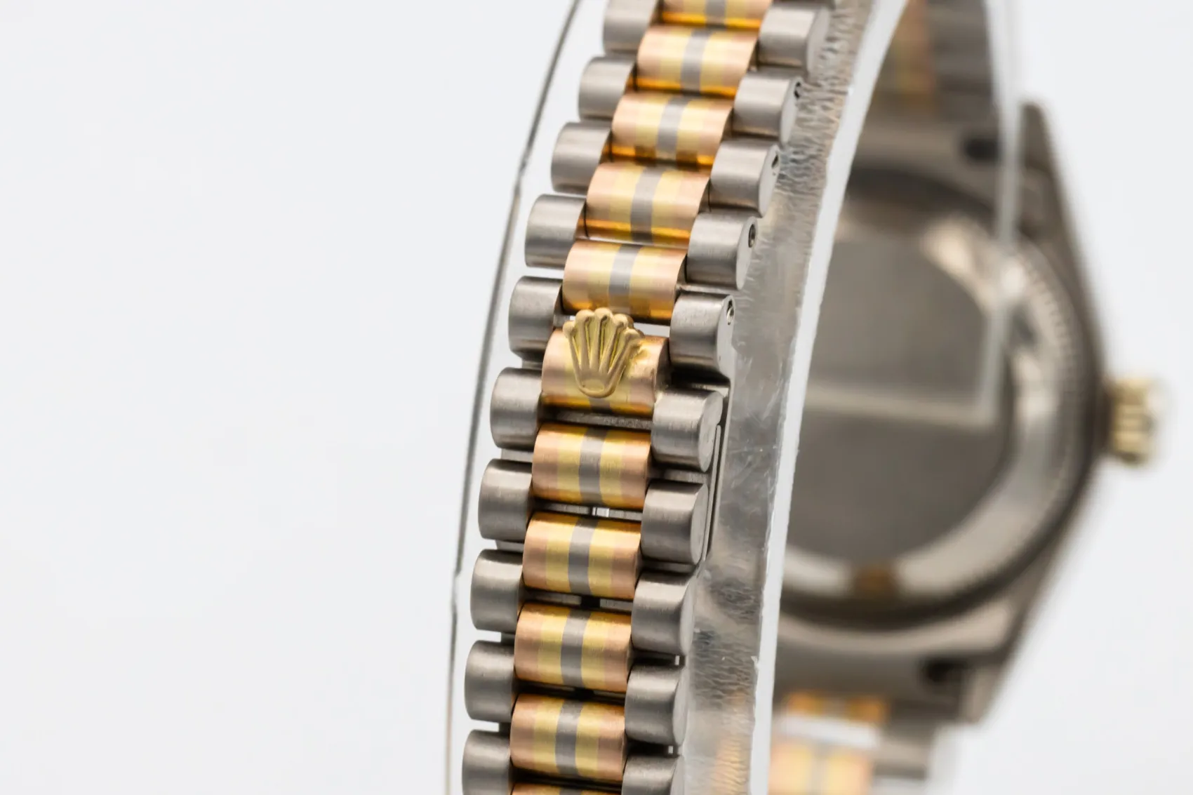 The Tridor variation was developed as a more luxurious interpretation of the President bracelet, blending three gold tones in one design to showcase Rolex’s precious metal craftsmanship. Produced in limited numbers, Tridor models such as the reference 69179 are now especially sought after by collectors for their rarity and distinctive aesthetic.