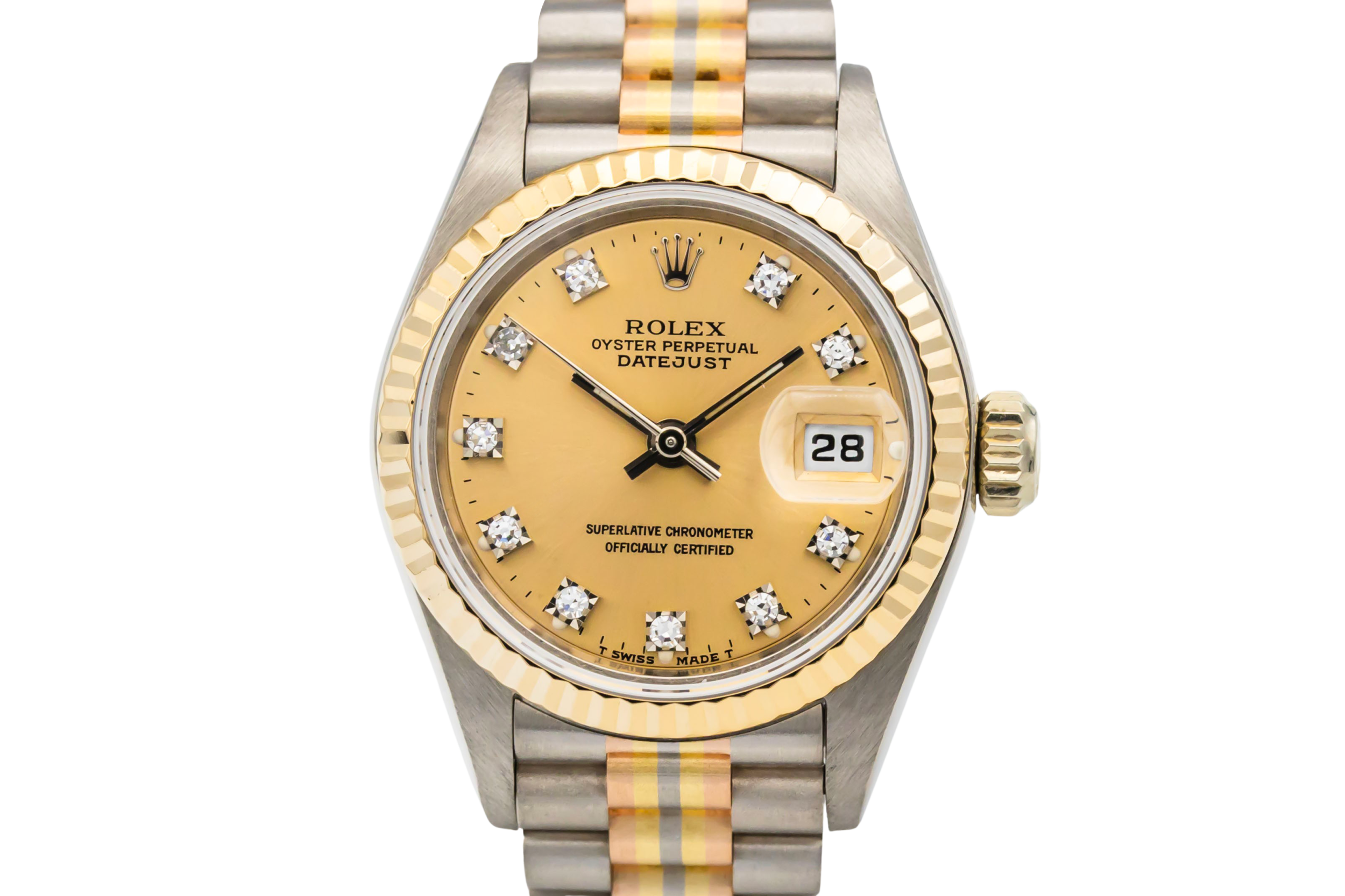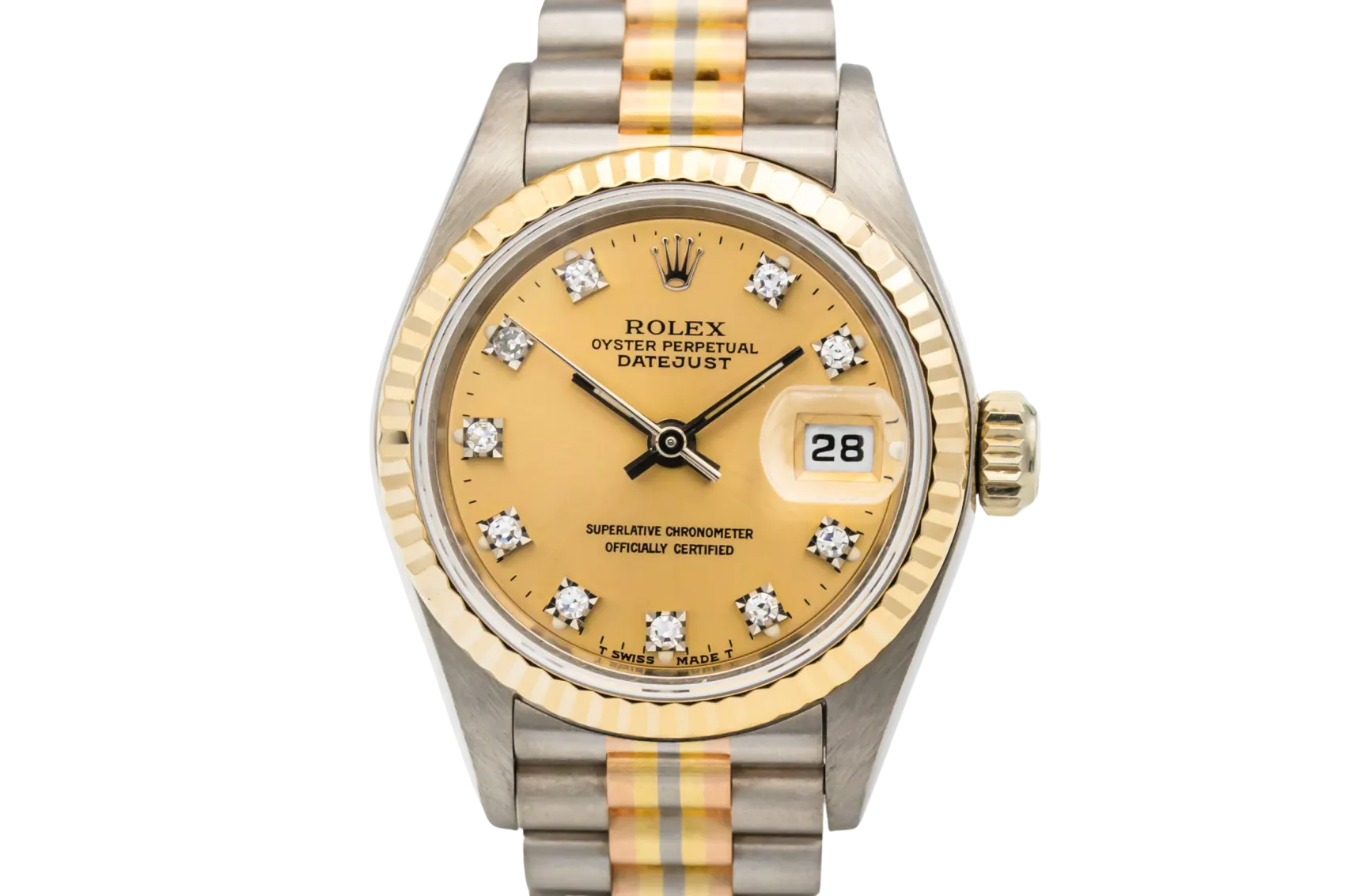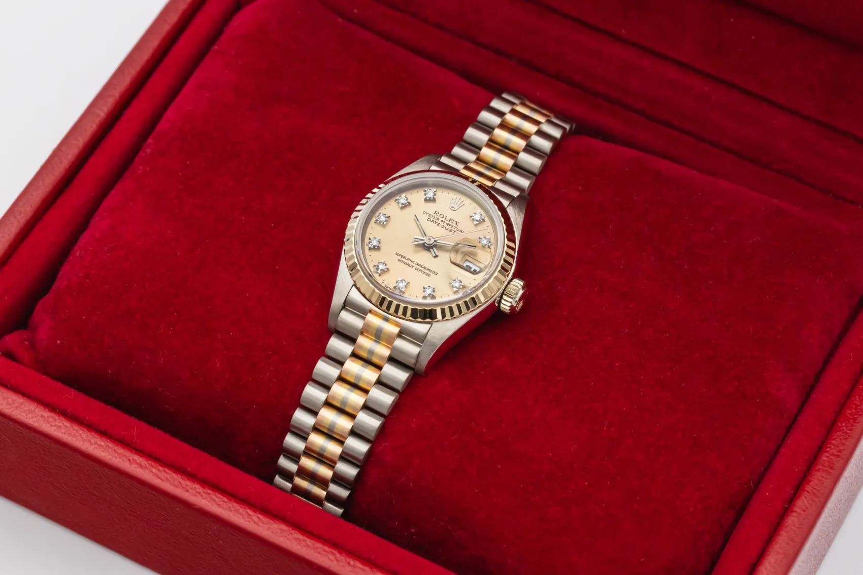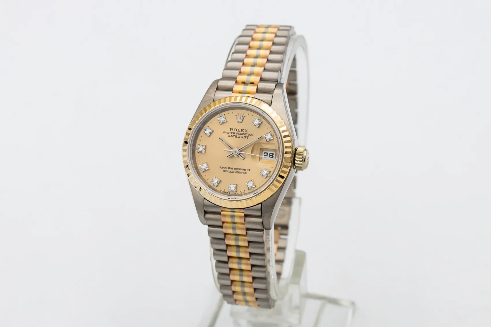 The Tridor variation was developed as a more luxurious interpretation of the President bracelet, blending three gold tones in one design to showcase Rolex’s precious metal craftsmanship. Produced in limited numbers, Tridor models such as the reference 69179 are now especially sought after by collectors for their rarity and distinctive aesthetic.
