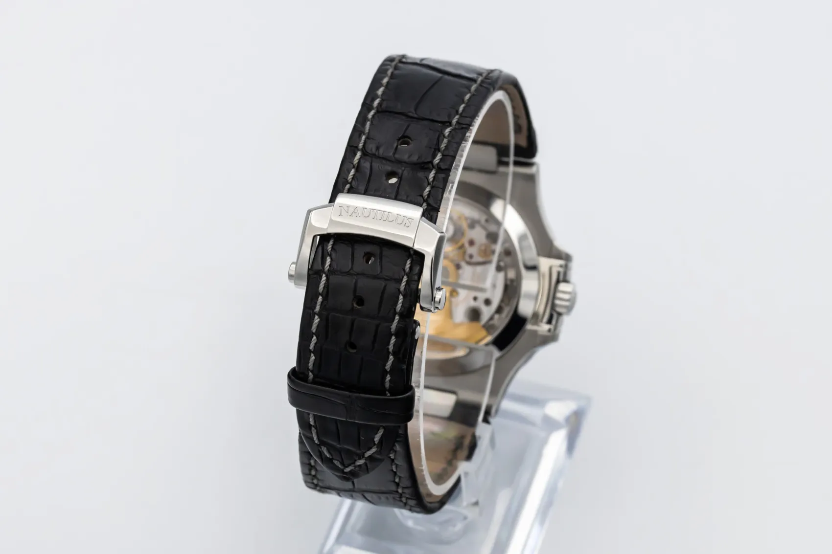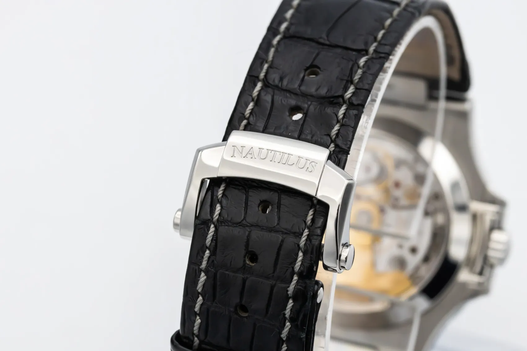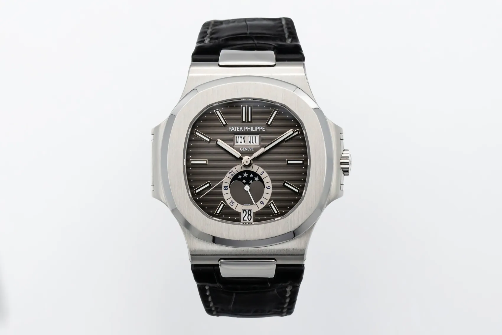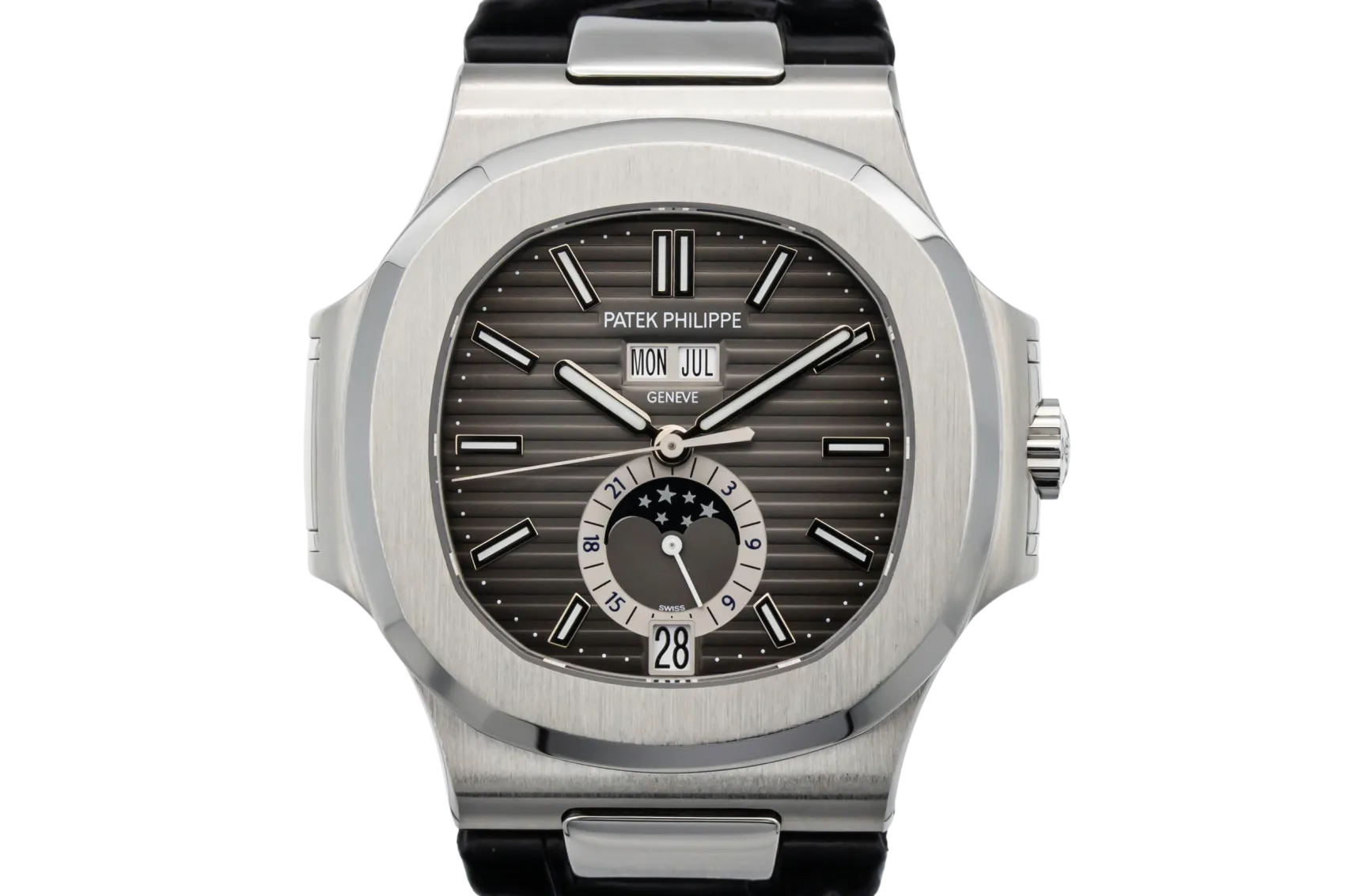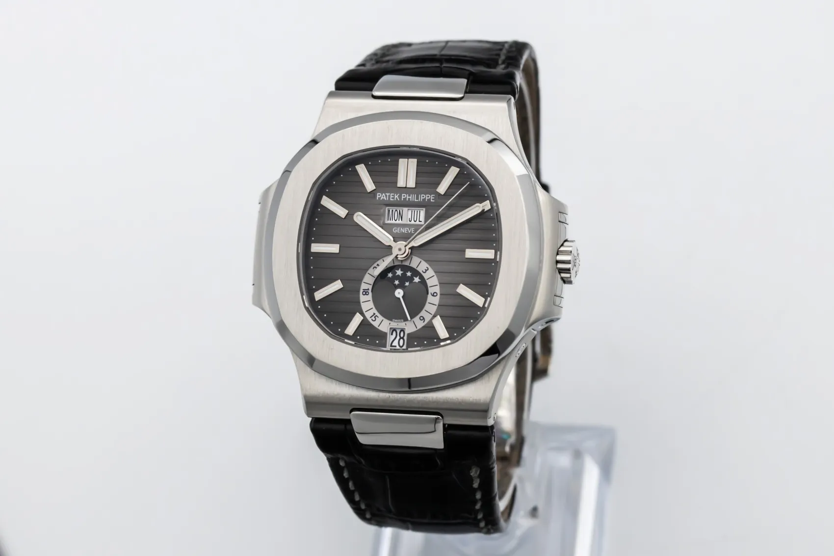 finance this from £415.53 p/m call the shop Read about our Limited Lifetime WarrantyThis 2017 Patek Philippe Nautilus 40.5mm is a sophisticated luxury timepiece crafted in stainless steel. The horizontally embossed grey dial features luminous hour markers, an annual calendar display, moonphase complication, and power reserve indicator, creating exceptional depth and technical presence. Finished on a black leather strap with a stainless steel fold-over clasp.