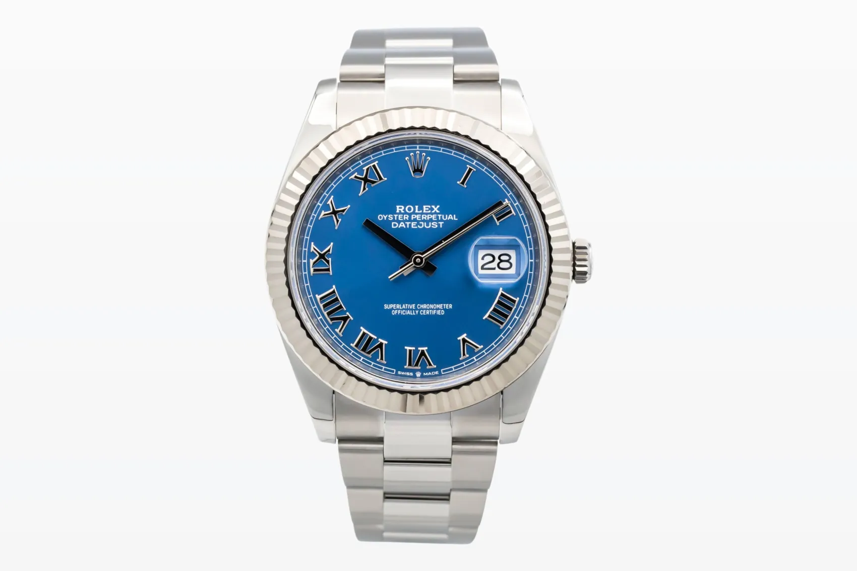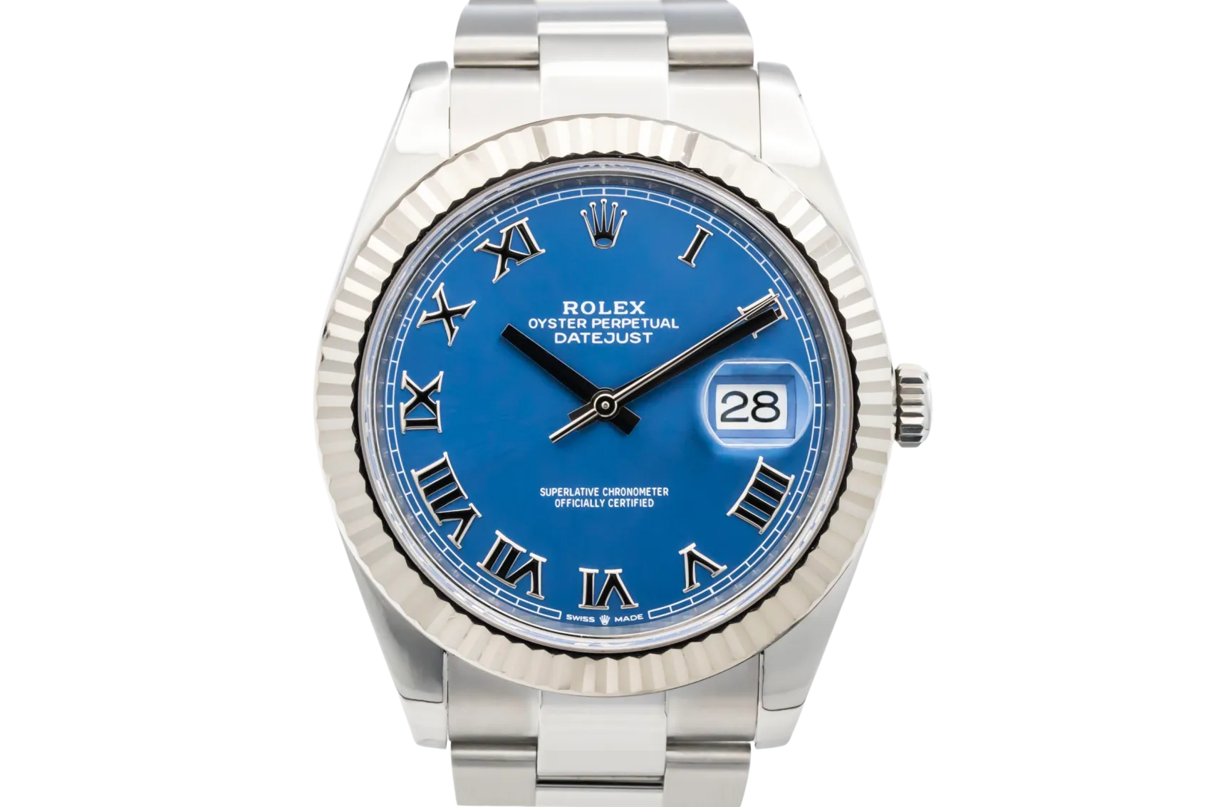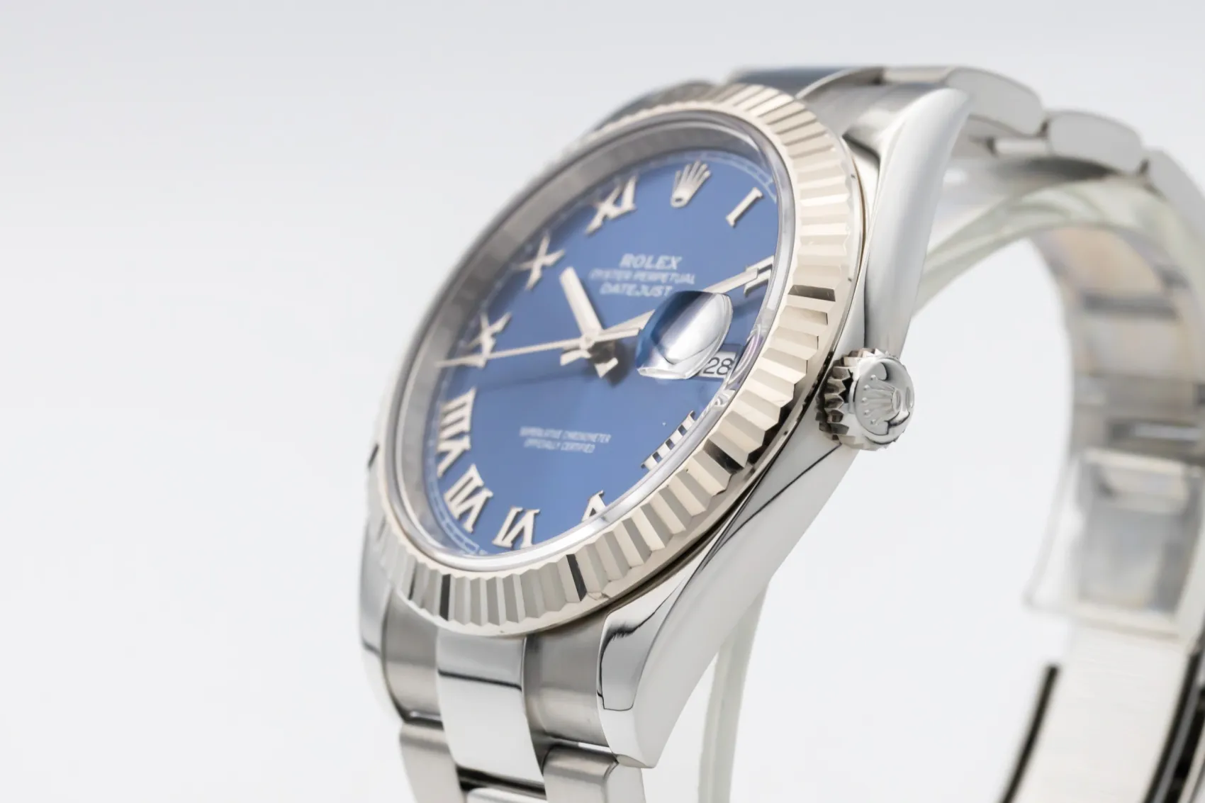 finance this from £146.93 p/m call the shop Read about our Limited Lifetime WarrantyThis 2021 Rolex DateJust 41mm is a refined luxury timepiece crafted in Oystersteel with a fluted white gold bezel. The striking blue dial features Roman numeral hour markers and the signature date window at 3 o’clock with Rolex’s Cyclops lens for enhanced legibility. Finished on the robust stainless steel Oyster bracelet.