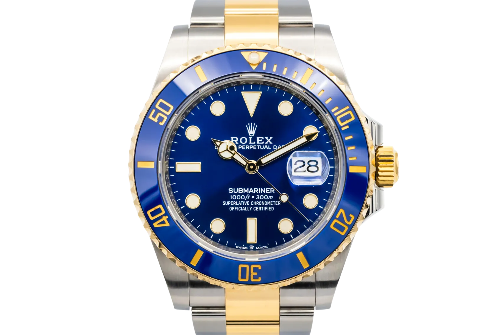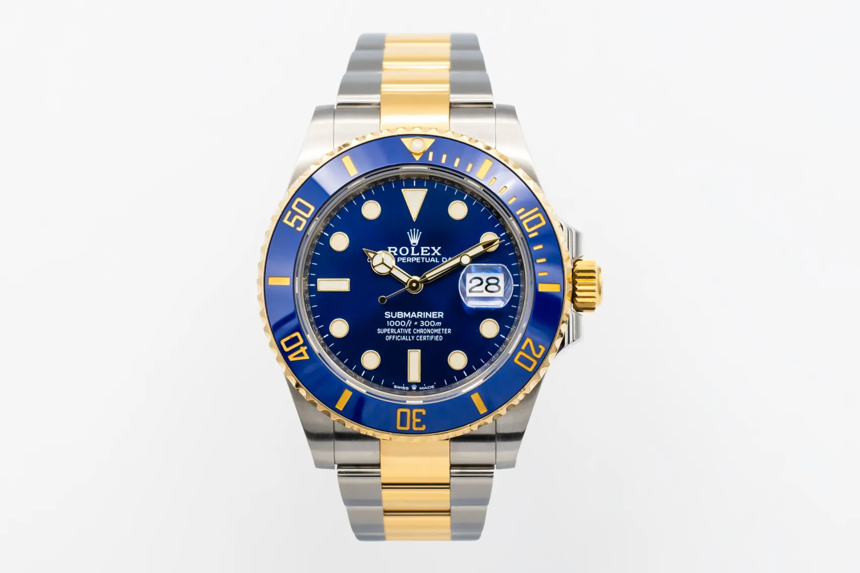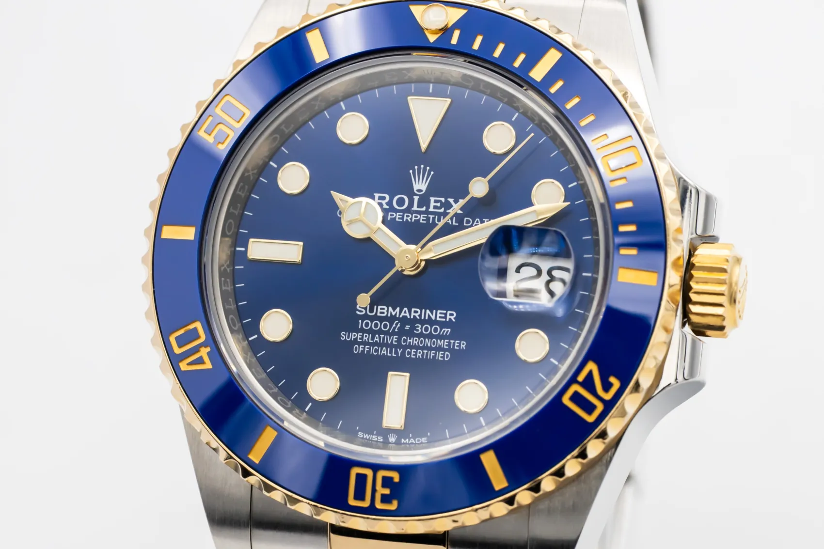finance this from £203.23 p/m call the shop Read about our Limited Lifetime WarrantyThis 2021 Rolex Submariner 41mm is a striking two-tone timepiece crafted in stainless steel and 18ct yellow gold, featuring a blue dial with luminous hour markers, Mercedes hands and the signature date display. Finished with a blue ceramic bezel and Oyster bracelet.