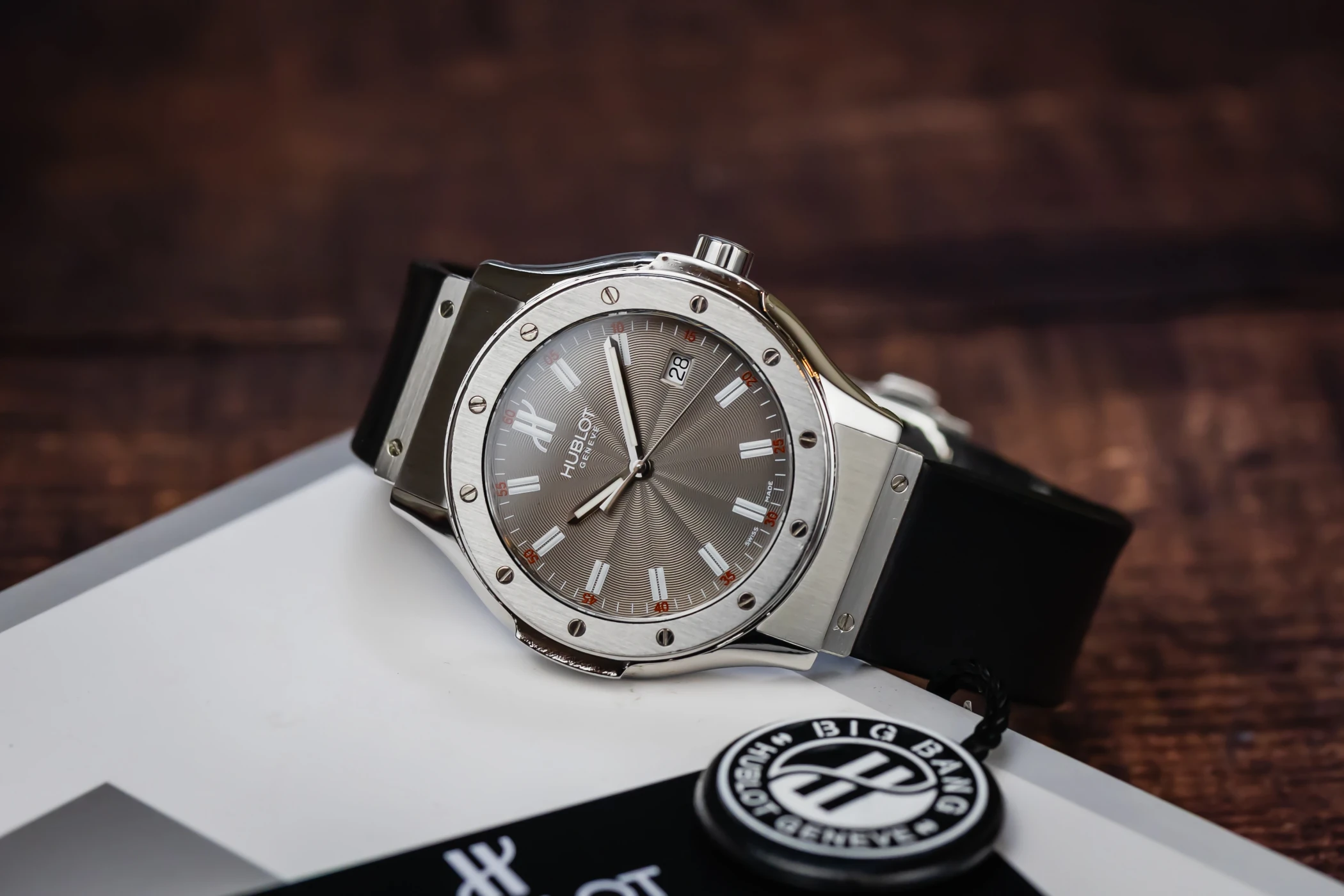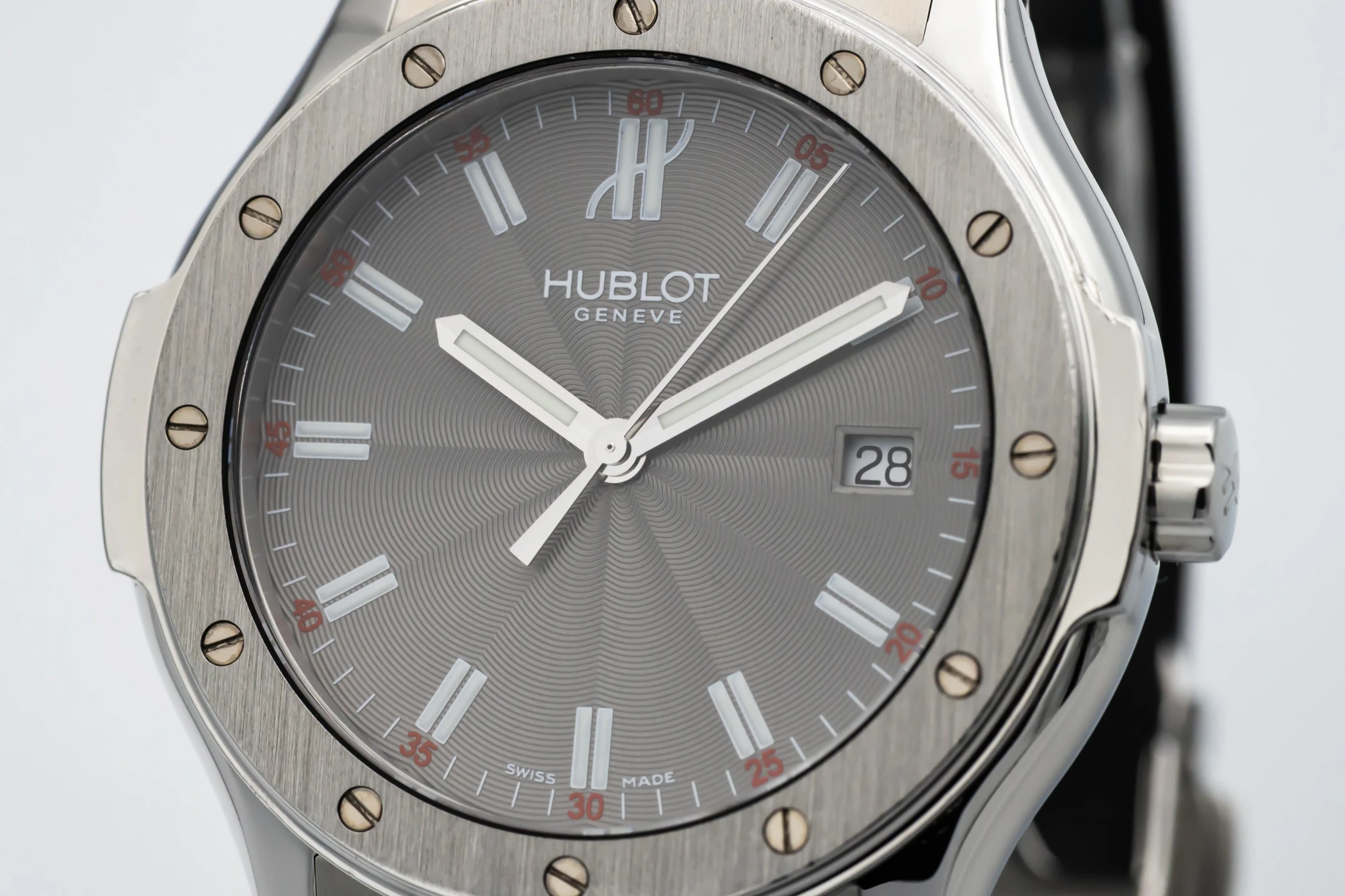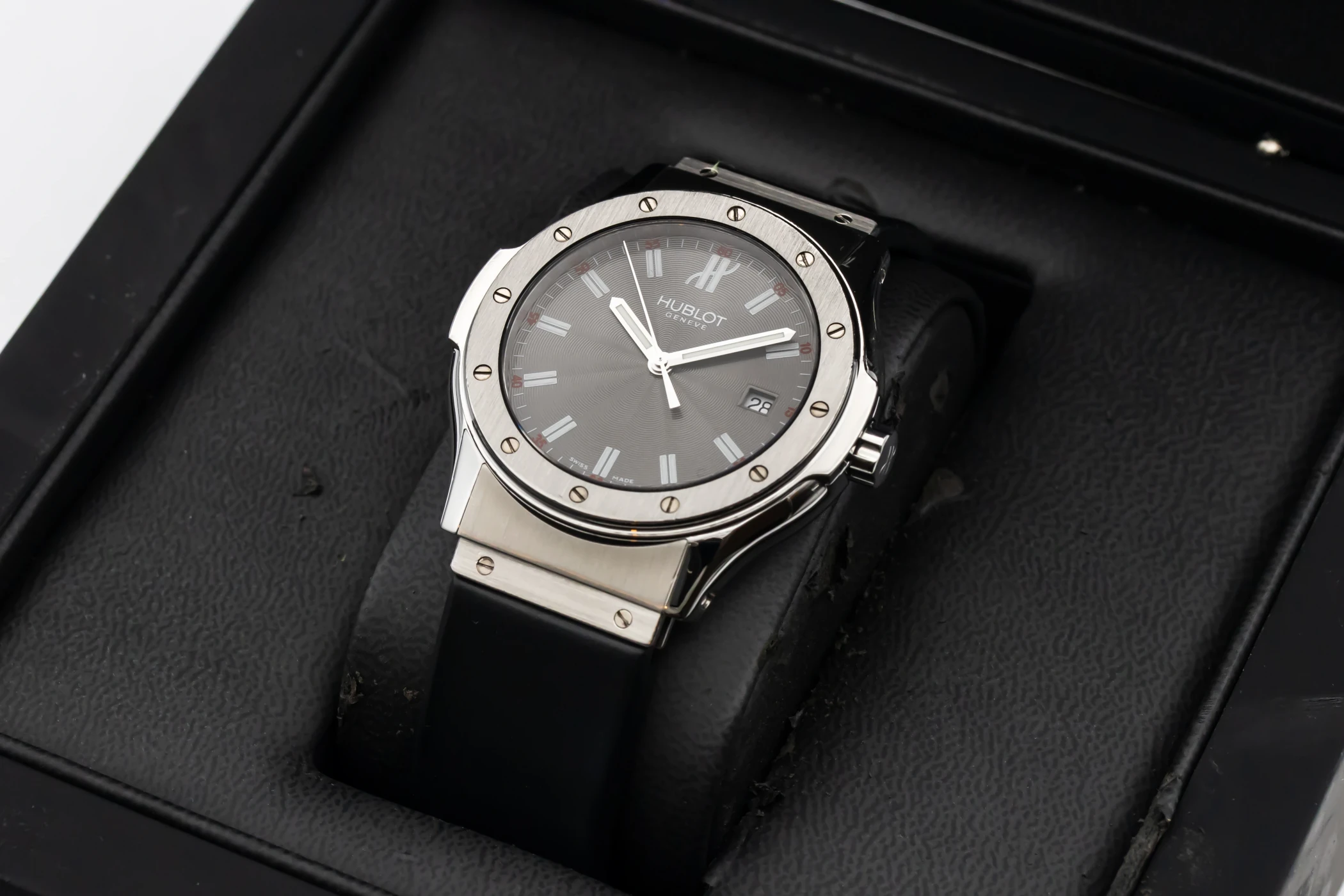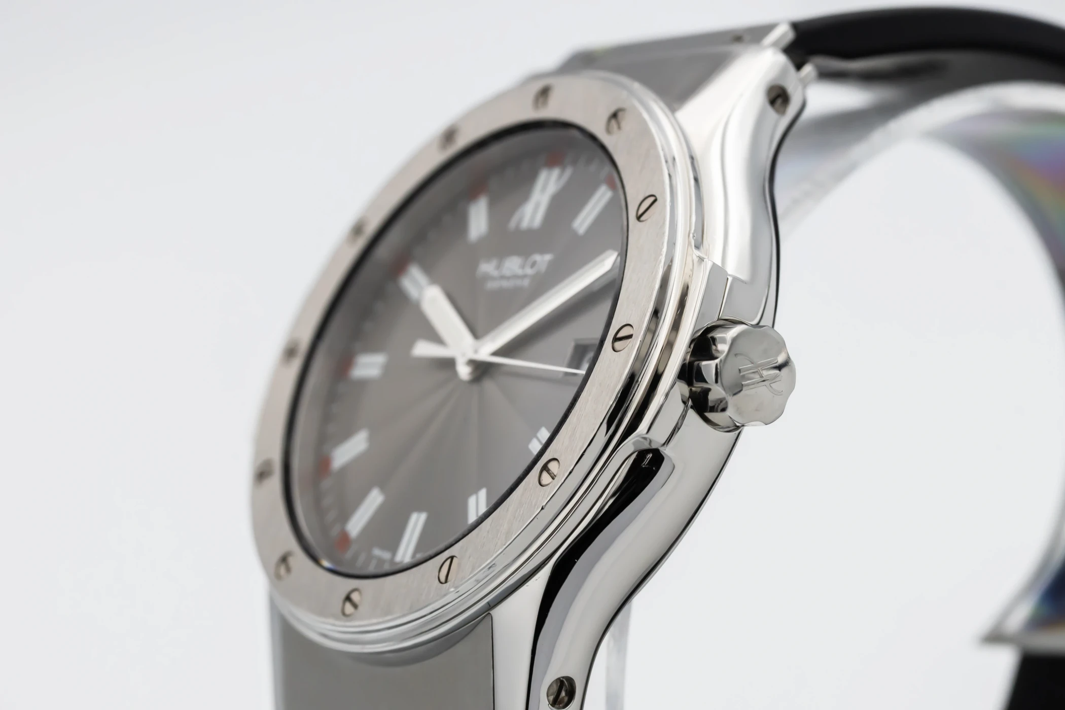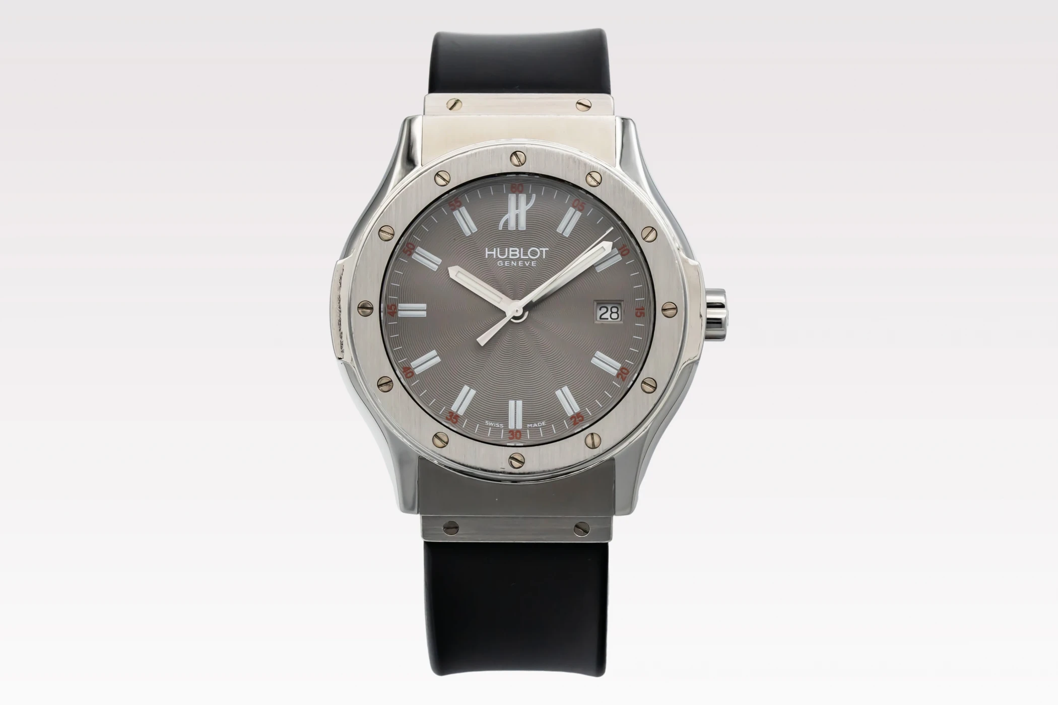 This 2008 Hublot Classic Fusion features a 41mm grey dial with baton indexes and a black rubber strap. It features a stainless steel bezel with 6 H-shaped screws.