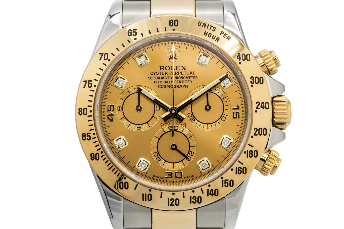 This Rolex Cosmograph Daytona 40mm features a champagne dial with diamond markers and a stainless steel and 18ct yellow gold oyster bracelet. It is also fitted with a 18ct yellow gold bezel with engraved tachymetric scale.
