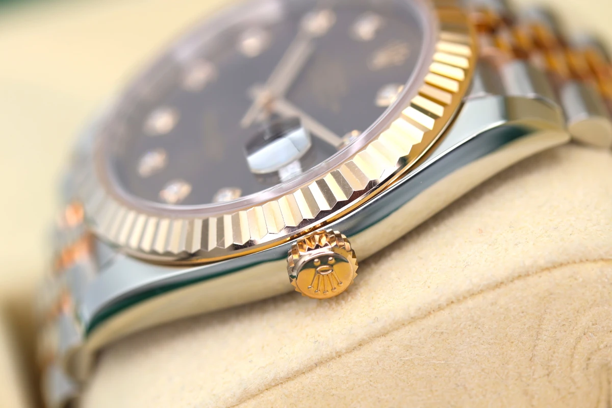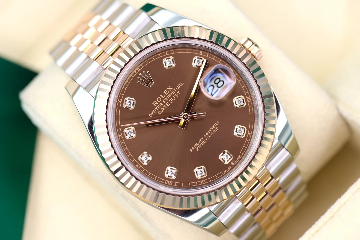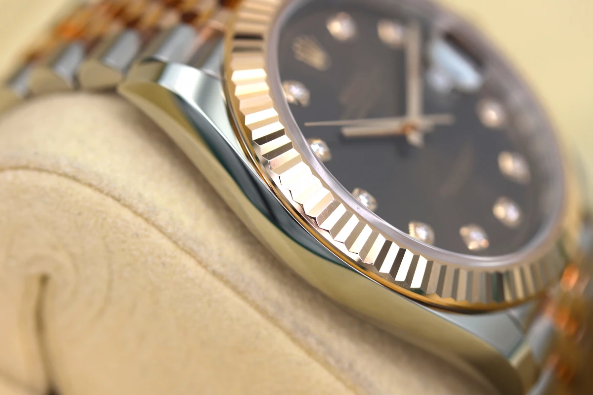 Everose gold fluted bezel. The dial is amazing with its rich chocolate diamond dot dial.