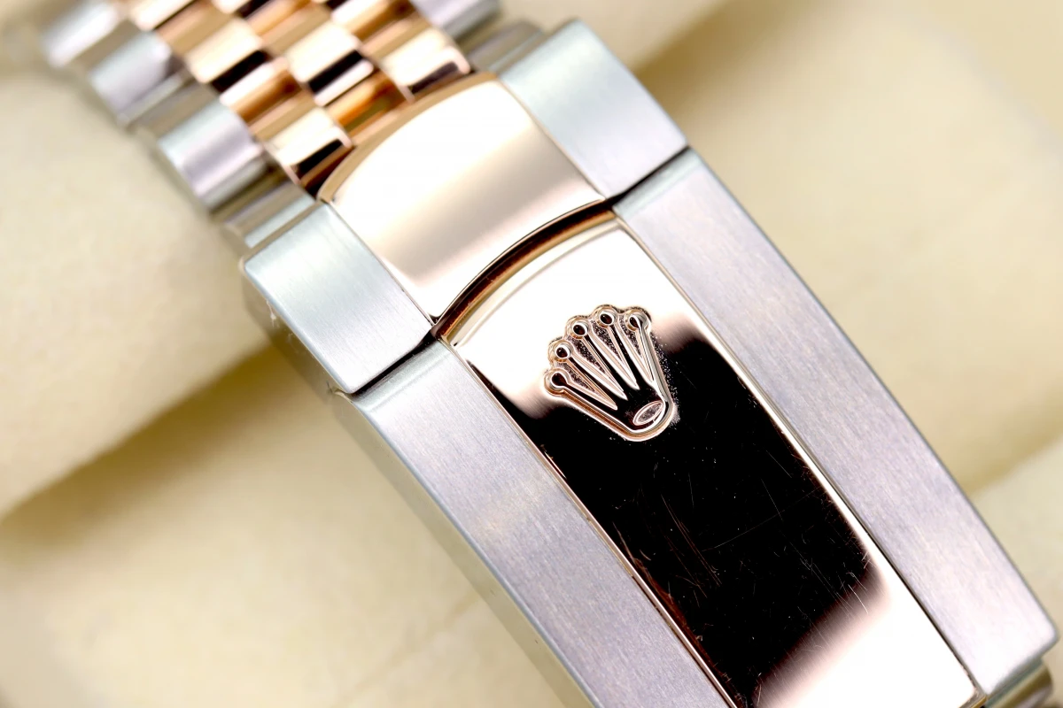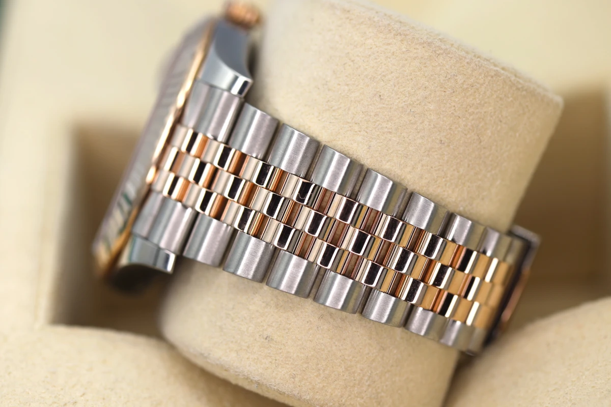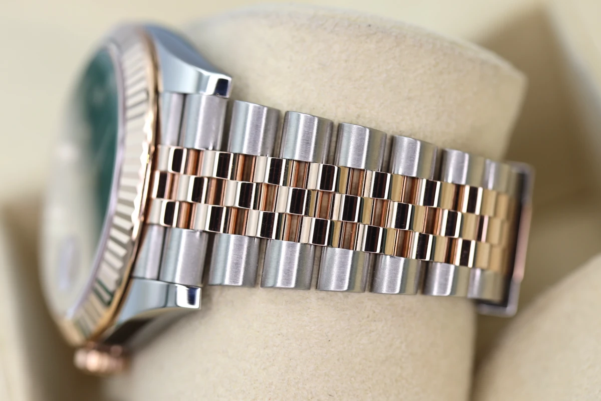 & 18ct Everose gold that has a mixed metal Stainless steel & 18ct Everose Jubilee strap and an 18ct