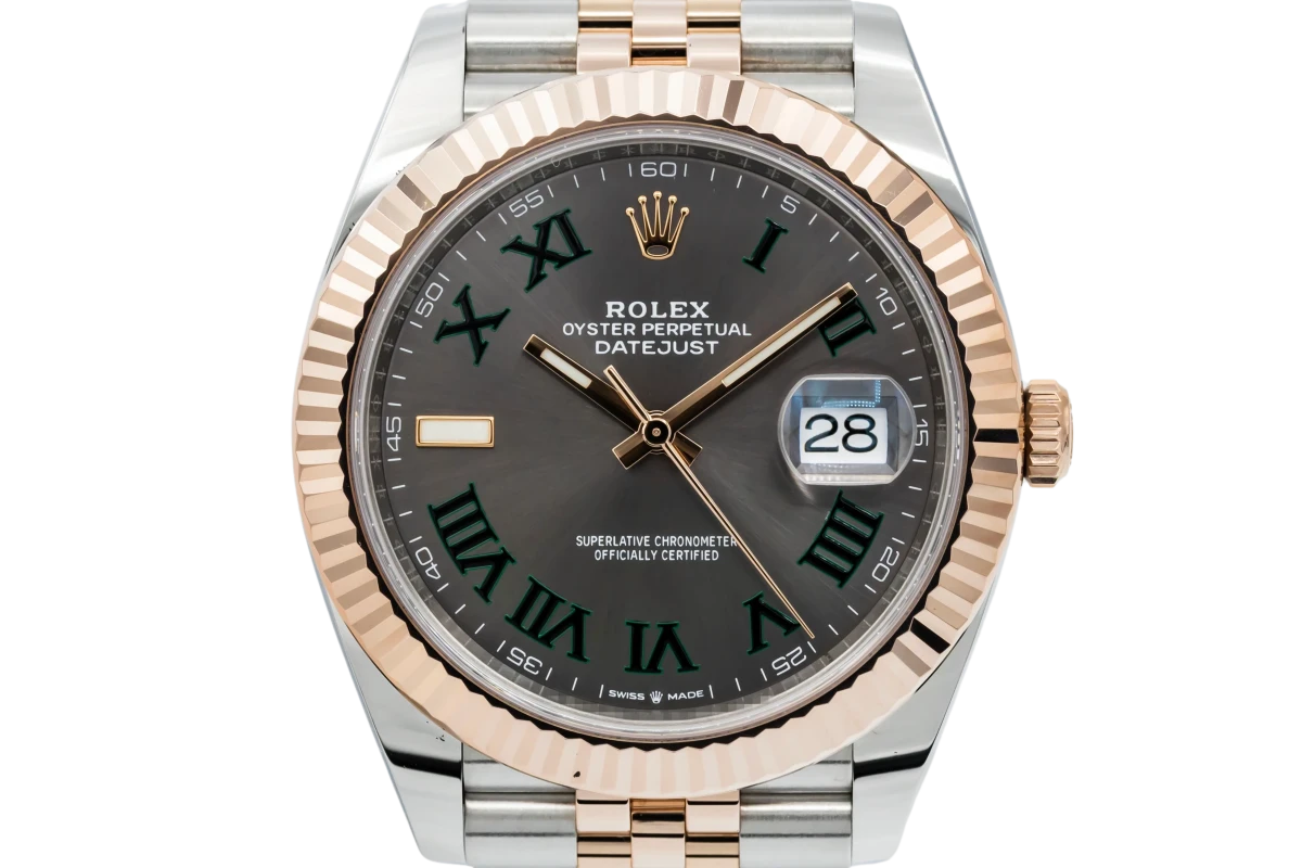This 2024 Rolex DateJust 41mm features a rhodium dial with roman numerals and a stainless steel and 18ct rose gold jubilee bracelet. It fitted with a 18ct rose gold fluted bezel.