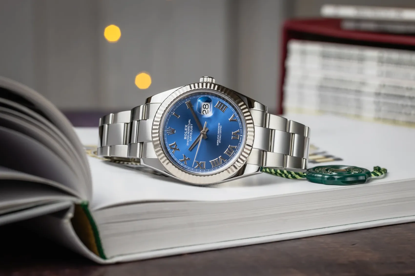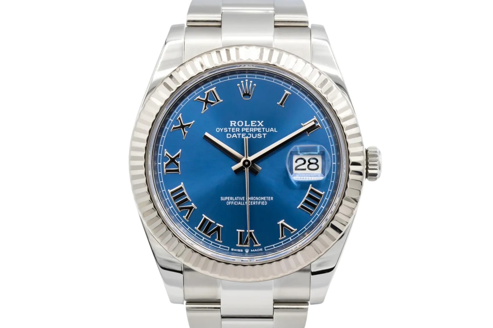 finance this from £211.03 p/m call the shop Read about our Limited Lifetime WarrantyThis 2020 Rolex DateJust 41mm features the highly desirable blue Azzurro sunburst dial, featuring Roman numeral hour markers and polished white gold hands. The stainless steel Oyster case is paired with a smooth Oyster bracelet. Framed by an 18ct white gold fluted bezel, this DateJust balances classic Rolex DNA with a striking contemporary twist.