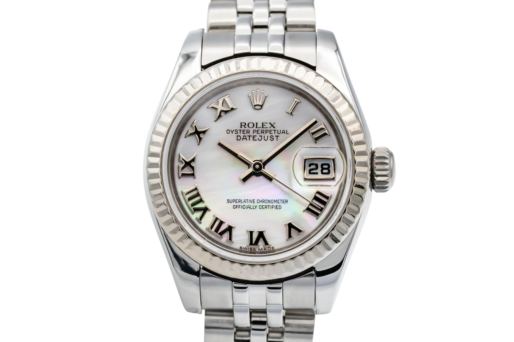 This 2011 Rolex Lady DateJust 26mm features a mother of pearl dial with roman numerals and a stainless steel jubilee bracelet. It is fitted with an 18ct white gold fluted bezel.