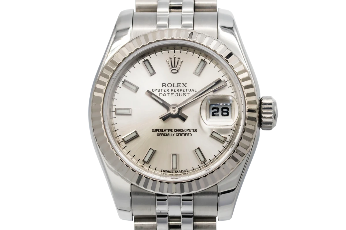 This circa 2005 Rolex Lady DateJust 26mm features a silver dial with baton markers and a stainless steel jubilee bracelet. It is fitted with an 18ct white gold fluted bezel.