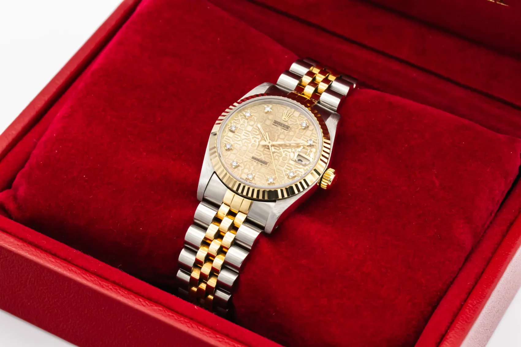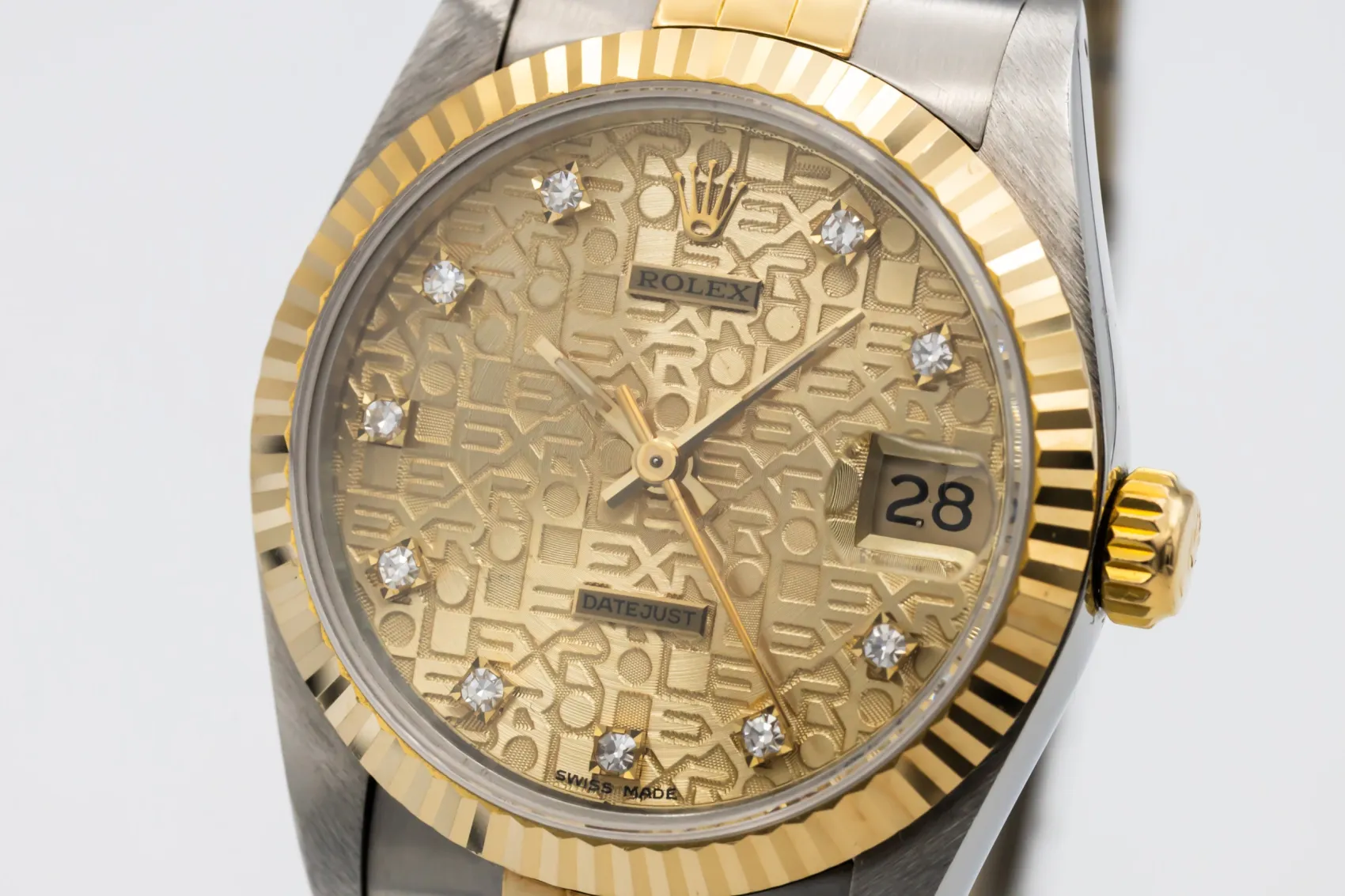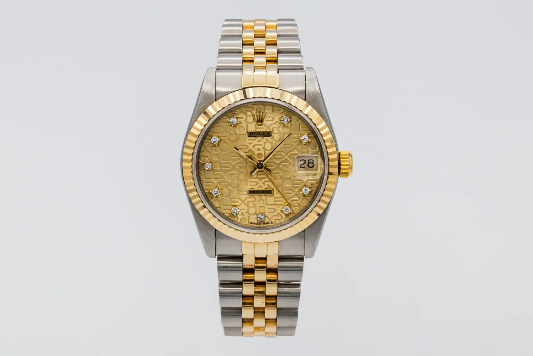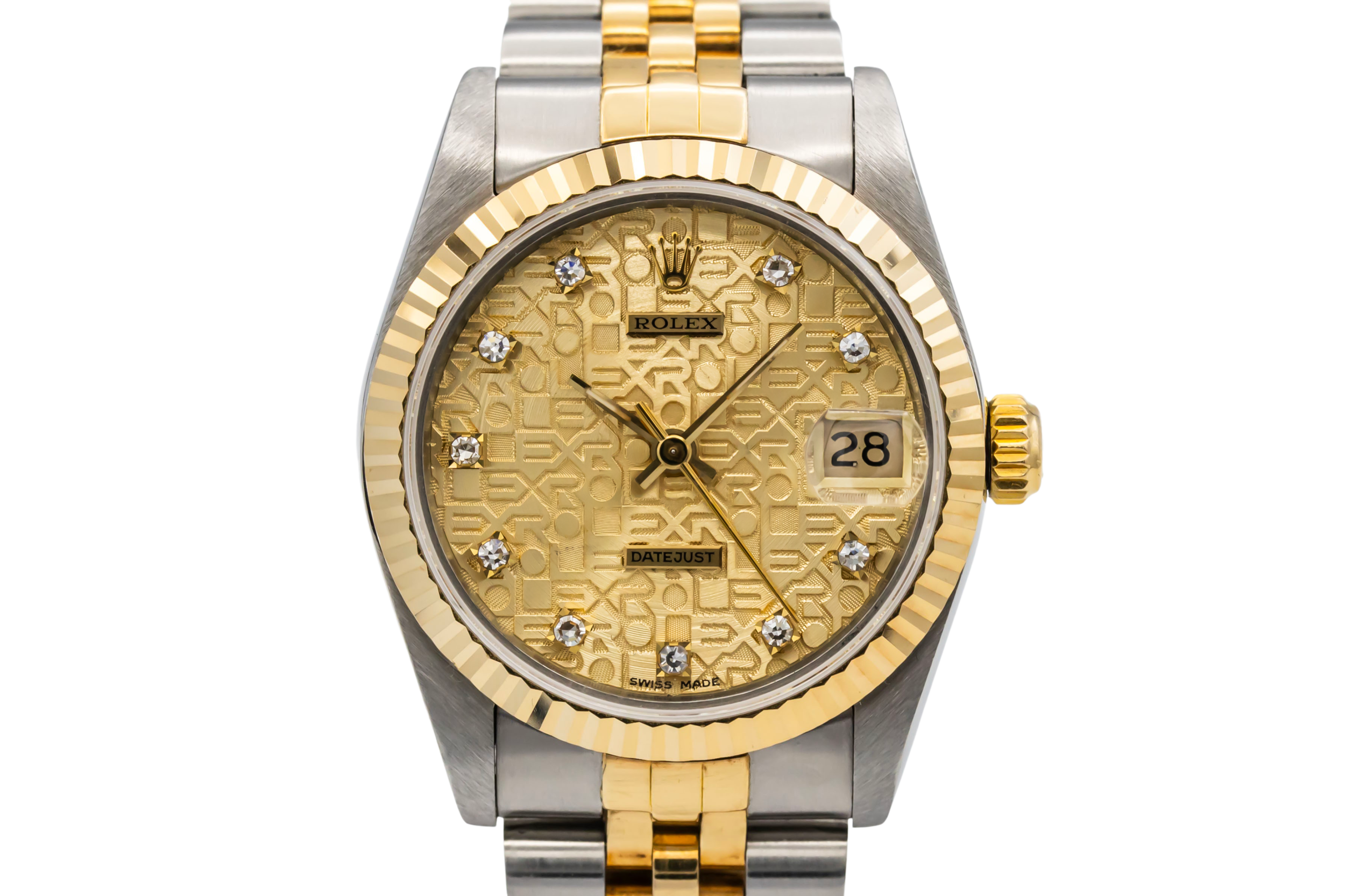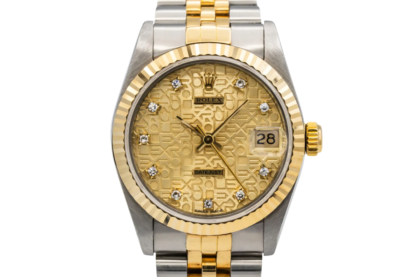 finance this from £101.58 p/m call the shop Read about our Limited Lifetime WarrantyThis 1988 Rolex DateJust 31mm is a classic two-tone timepiece crafted in stainless steel and 18ct yellow gold, featuring a champagne computerised dial set with diamond hour markers and the signature date display at 3 o’clock. Finished with a fluted yellow gold bezel and Jubilee bracelet.